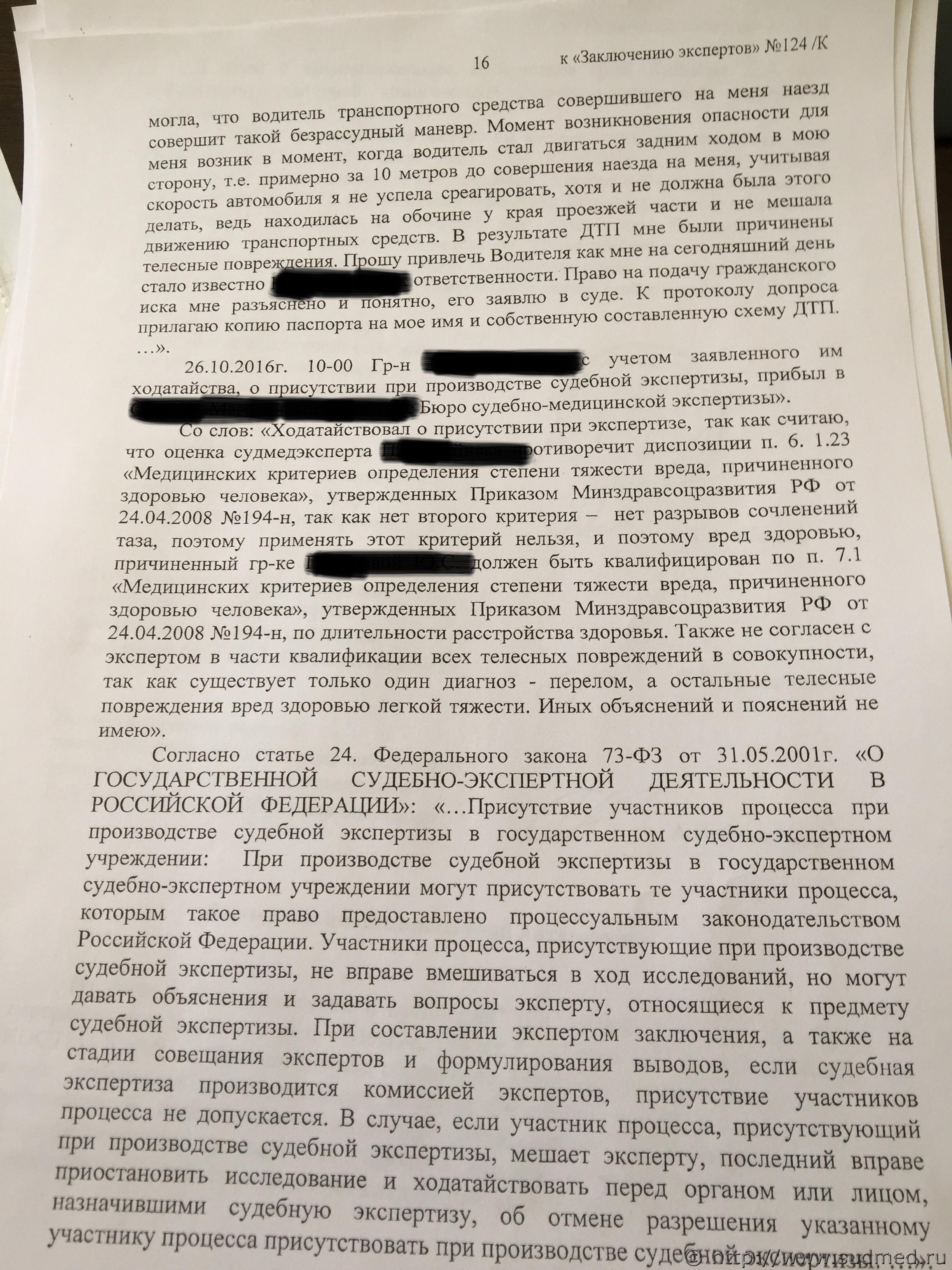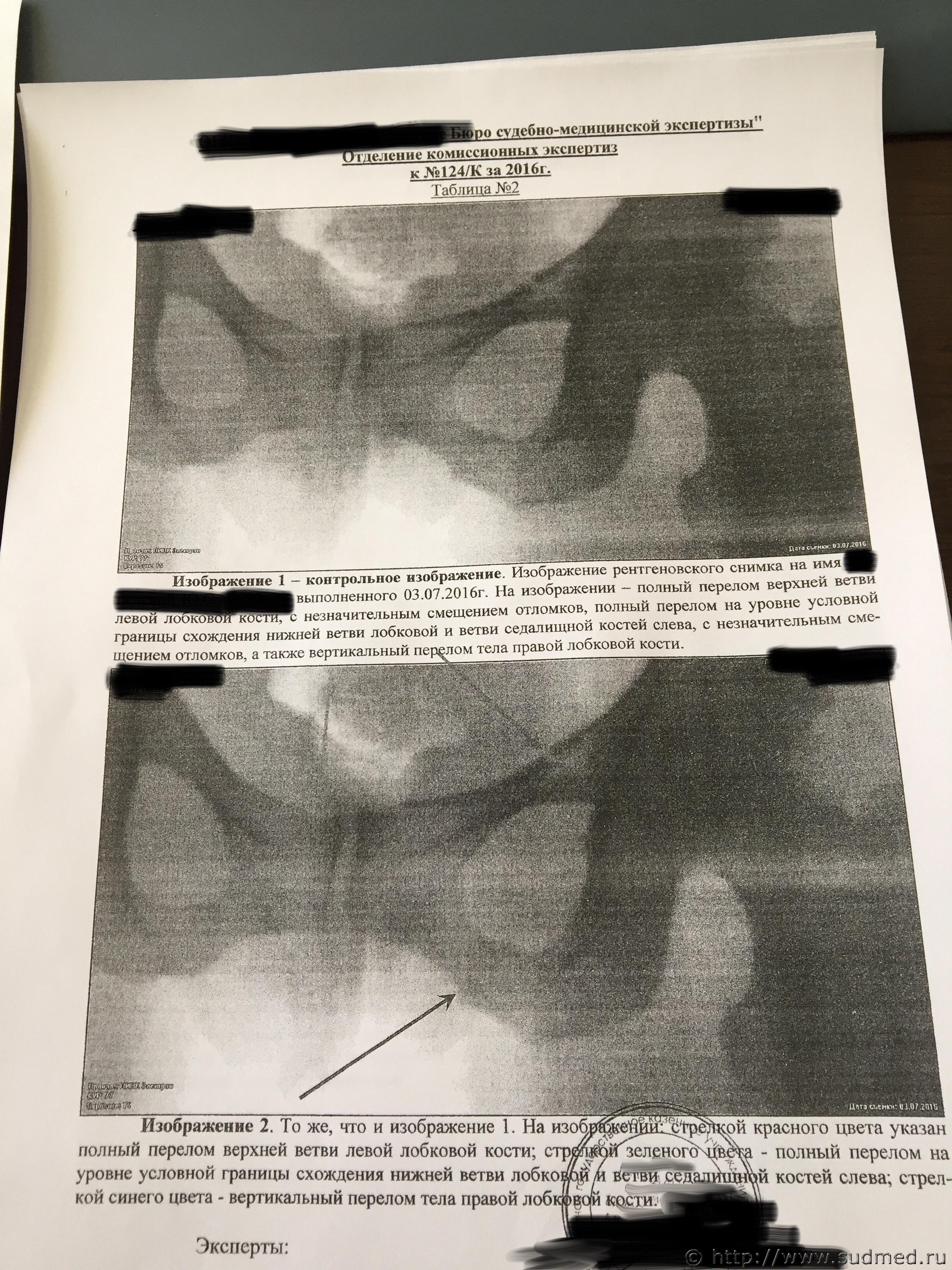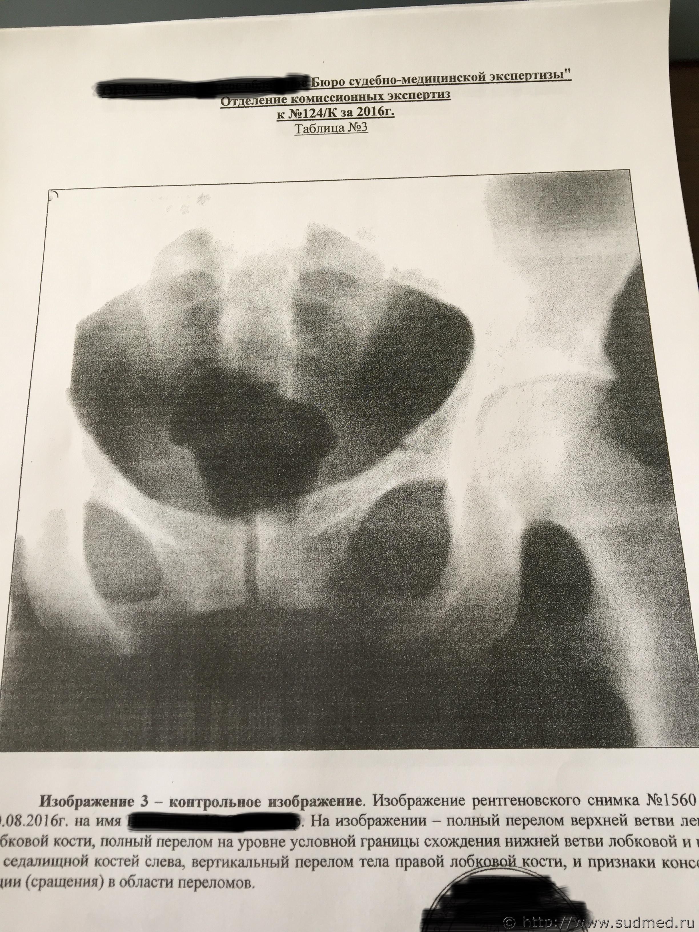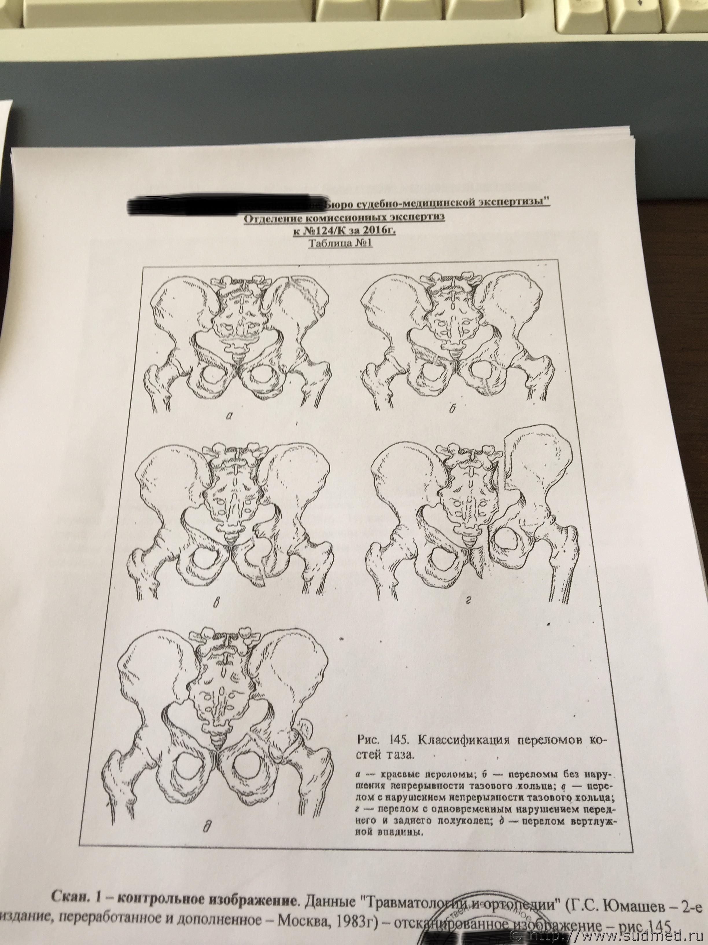Цитата 6.1.23. двусторонние переломы переднего тазового полукольца с нарушением непрерывности: переломы обеих лобковых и обеих седалищных костей типа "бабочки"; переломы костей таза с нарушением непрерывности тазового кольца в заднем отделе: вертикальные переломы крестца, подвздошной кости, изолированные разрывы крестцово-подвздошного сочленения; переломы костей таза с нарушением непрерывности тазового кольца в переднем и заднем отделах: односторонние и двусторонние вертикальные переломы переднего и заднего отделов таза на одной стороне (перелом Мальгеня); диагональные переломы - вертикальные переломы в переднем и заднем отделах таза на противоположных сторонах (перелом Воллюмье); различные сочетания переломов костей и разрывов сочленений таза в переднем и заднем отделах; (жирным текстом - выделено мной то, что может относится к Вашему случаю. Остальное в тексте точно не про этот случай). На рентгенограммах хорошо видны переломы: правой лонной и правой седалищной костей, левой лонной кости. Перелома левой седалищной кости нет. "Условная граница" левой лонной и левой седалищной костей, на самом деле, находится на некотором расстоянии от места перелома левой лонной кости. Т.е. ссылка экспертов на прохождение линии перелома по этой условной границе представляется изрядно притянутой и, в любом случае, это непосредственно не свидетельствует о наличии перелома левой седалищной кости. Для оценки этой травмы как тяжкий вред нужен перелом типа "бабочки" всех четырех костей: правой лонной (он есть), правой седалищной (есть), левой лонной (есть), левой седалищной (нет!). Убежден, что за такой перелом тяжкий вред давать неправильно. Это - вред здоровью средней тяжести (по п.7.1 вышеуказанного документа). Посмотрите в интернете (по тэгам "кости таза анатомия", "лонная кость анатомия", "седалищная кость анатомия") абсолютно понятные картинки, в т.ч. на которых цветом обозначены эти кости и их граница". |