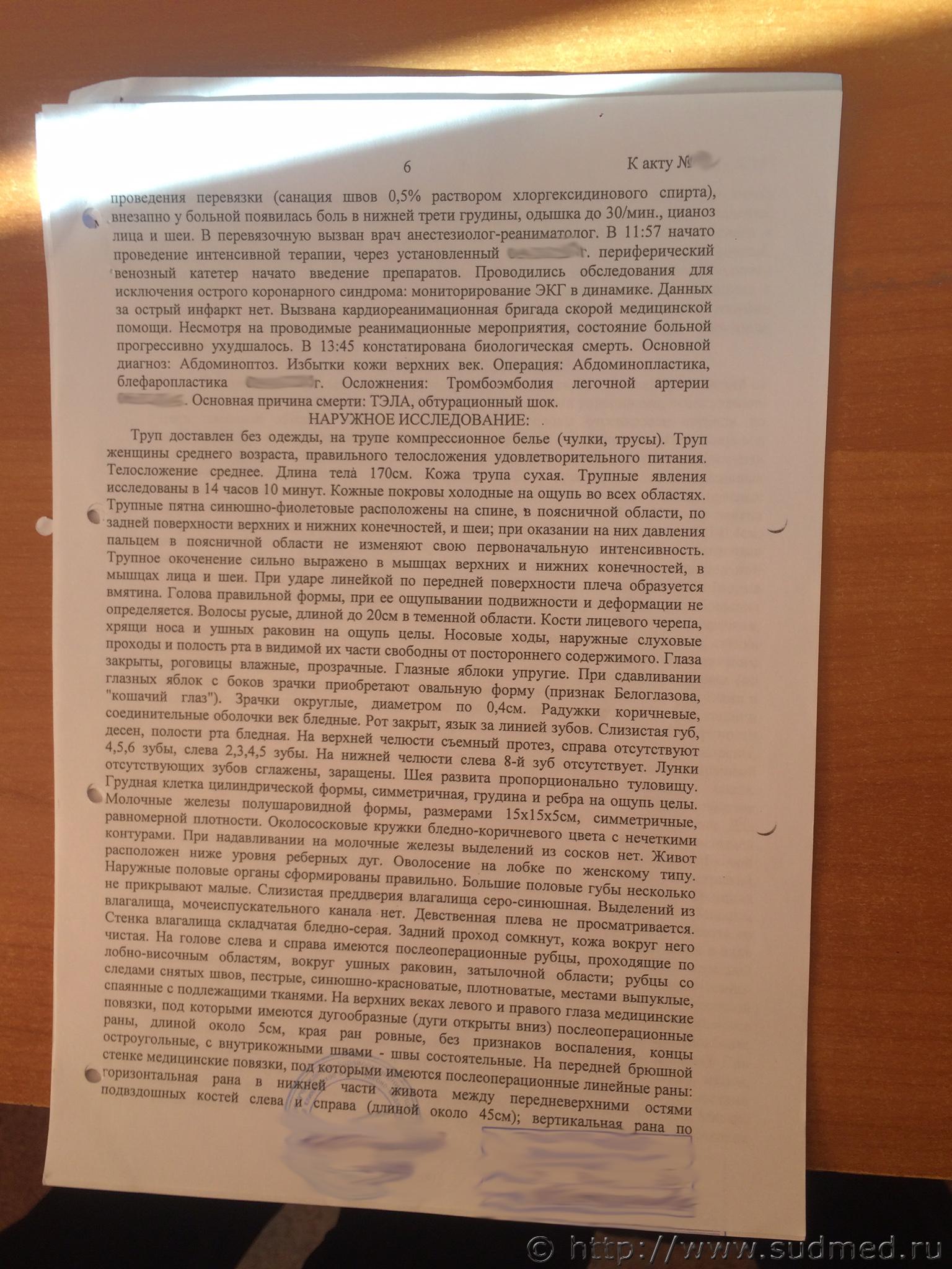 Надо читать исследовательскую часть Акта судебно-медицинского исследования трупа и гистологический Акт. Всё может быть. Это интересно.Глянуть бы каким образом доказан. Ув.Елена. Внимательно прочитайте пункт 7.3.1 правил нашего форума. Медик, спасибо огромное за ответ! Я завтра выложу все документы, убрав личные данные, явки, пароли... Нам с мужем очень важно разобраться(он оперирующий хирург и лечащий врач в этой ситуации, и на него заведено уголовное дело по ст 109/2) Надеемся с вашей помощью правильно сформулировать вопросы для третьей СМЭ... Решающей... |