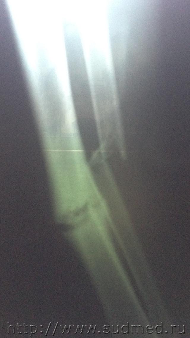 Изображения рентгенограмм оч.плохого качества, но внешний вид перелома большеберцовой кости указывает на её патологическое изменение, на месте которого образовался перелом. Кость резко уширена, её структура представляется неоднородной. В чем конкретная причина - нужно серьезно разбираться отдельно (врожденная особенность, заболевание).