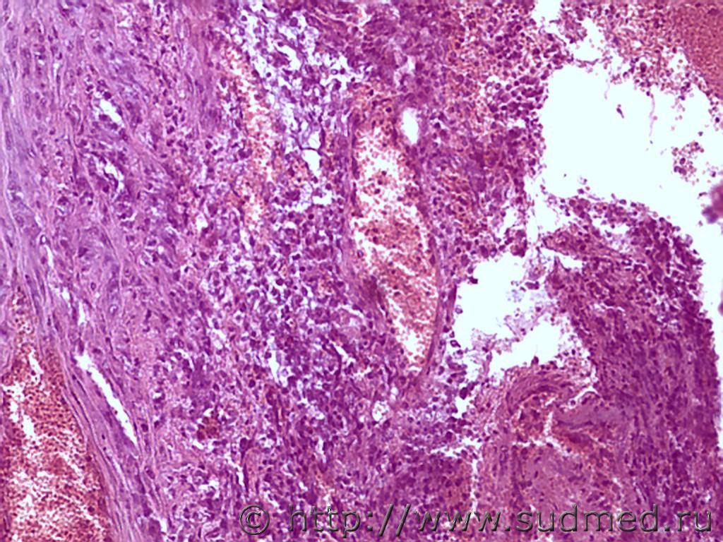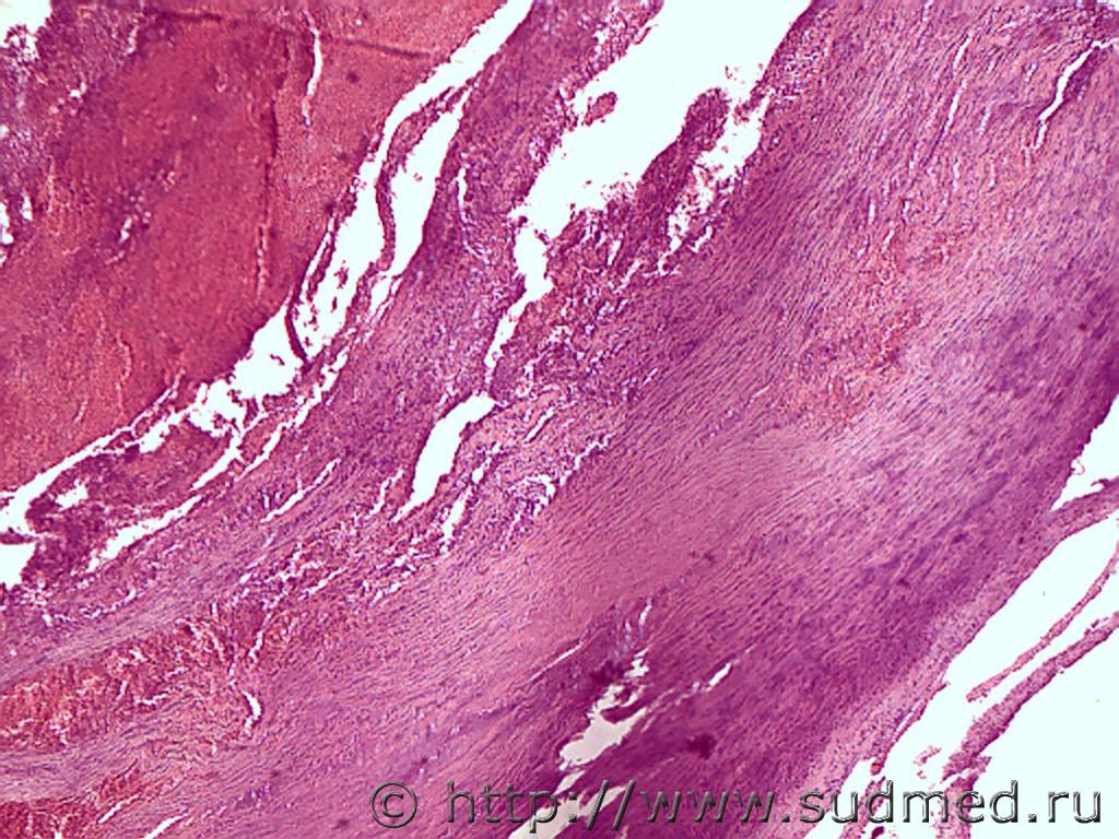 Но по микроморфологии аорты парень был не совсем здоровым т.к.продуктивный мезаортит с расслоением стенки аорты и разрывом стенки, кроме того огромная масса ни одного дня развития.