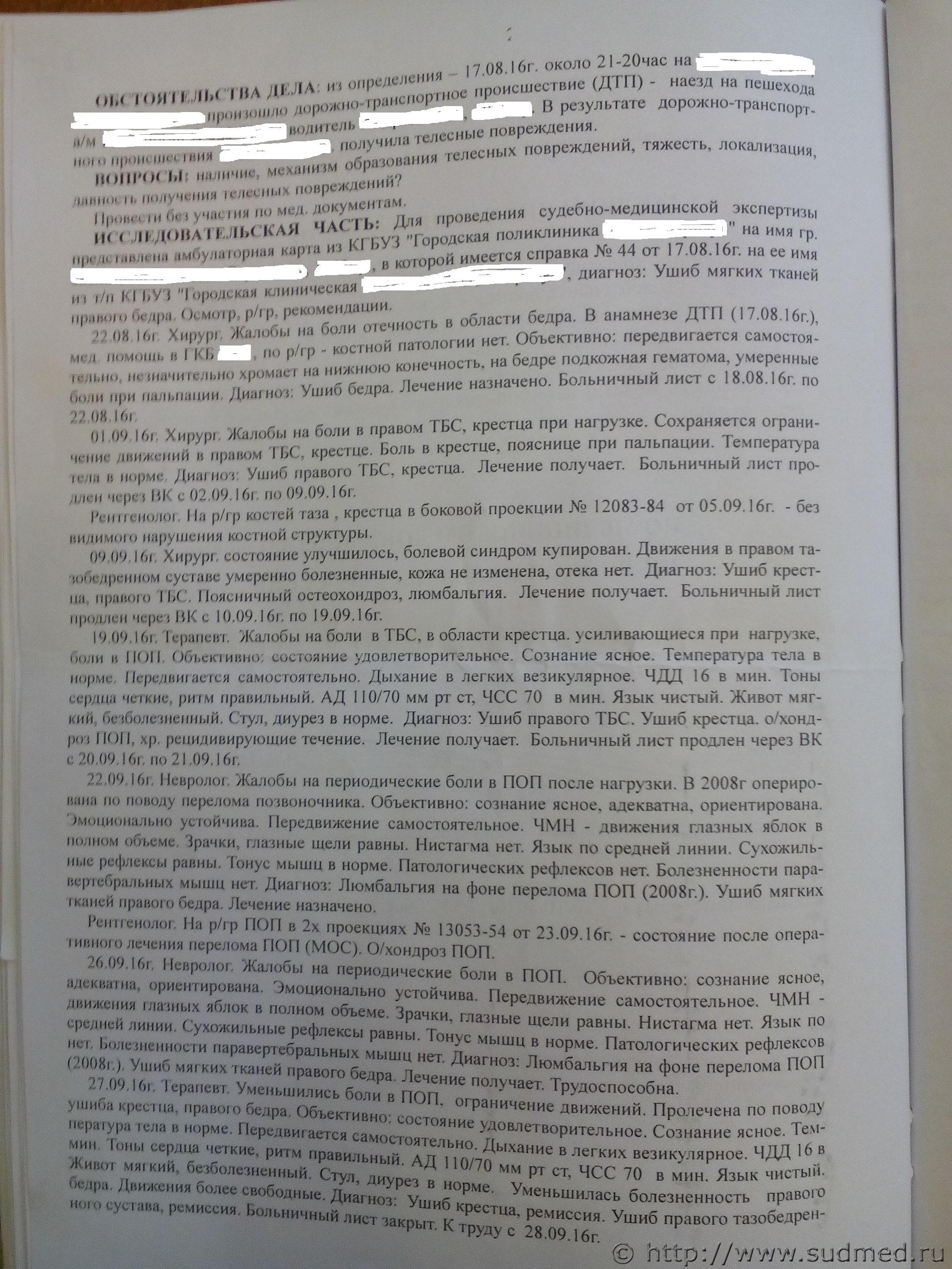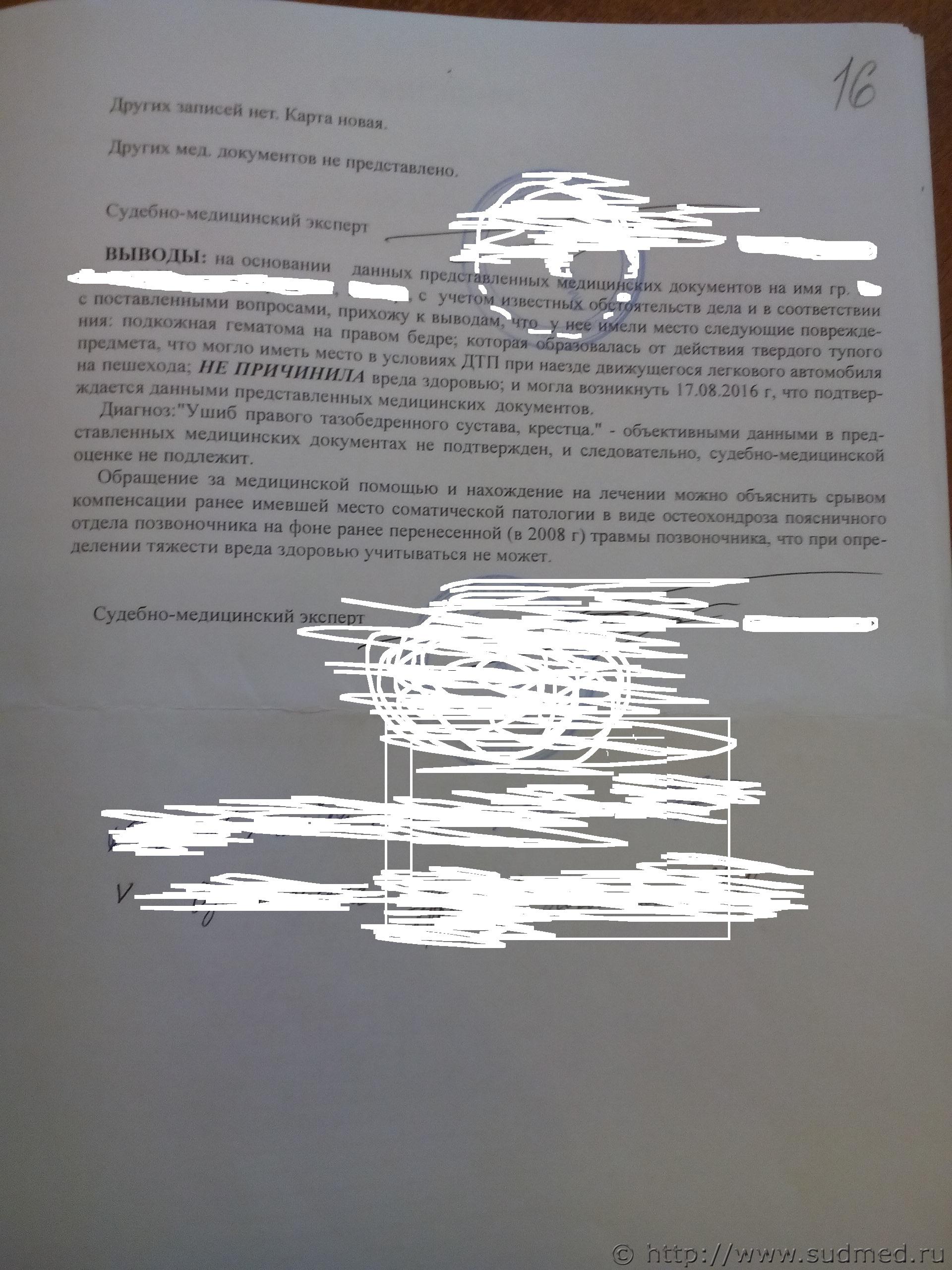 Здравствуйте! Прав ли эксперт? Могу ли я оспорить решение? : в августе 2016г. на пешеходном переходе меня сбил авто, провела 1,5 мес. на больничном, первую неделю не могла ходить совсем, затем хромала, на данный момент жалобы на "прострелы", боли в крестце и т.д. 8 лет назад перенесла операцию на поясничном отделе позвоночника, реабилитировалась, вела полноценный образ жизни, жалоб не было. На мои настоящие жалобы невролог не отреагировала, сказав, что я хожу, все в порядке, все мои "боли" у меня в голове - больничный закрыла. Я собрала все документы - передала на СМЭ. Заключительный диагноз - ушиб бедра, ушиб крестца. Эксперт написал в выводах, что данные ушибы могли быть нанесены авто в указанный период времени - ушиб не имеет "конкретного характера", ушиб - это не вред здоровью, а продолжительность моего больничного - это следствие операции на поясничном отделе позвоночника. Вред моему здоровью не нанесен. Документы рассматривались без моего присутствия. Заранее спасибо за комментарии, ответы.. Очень надеюсь на вашу помощь.