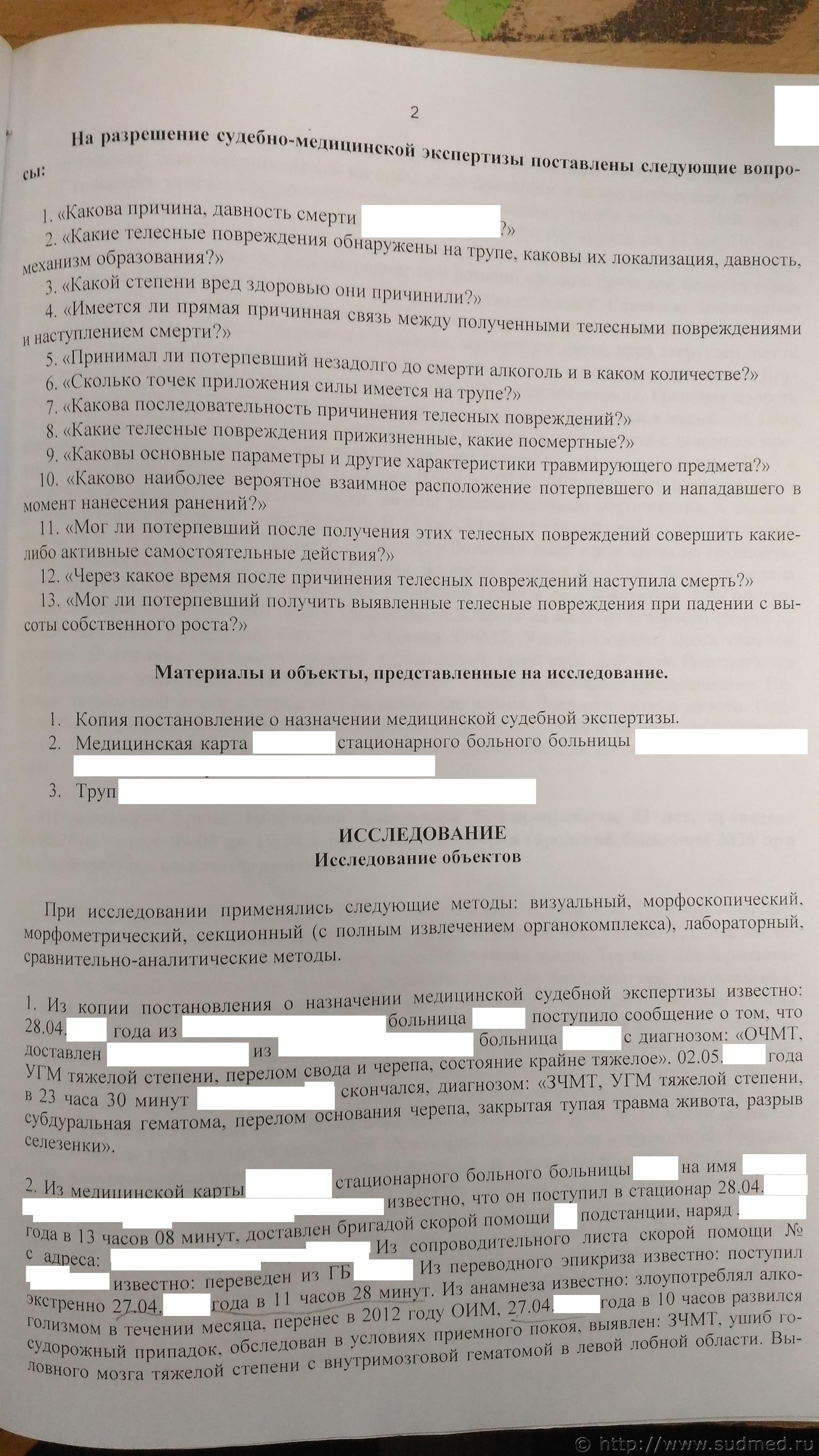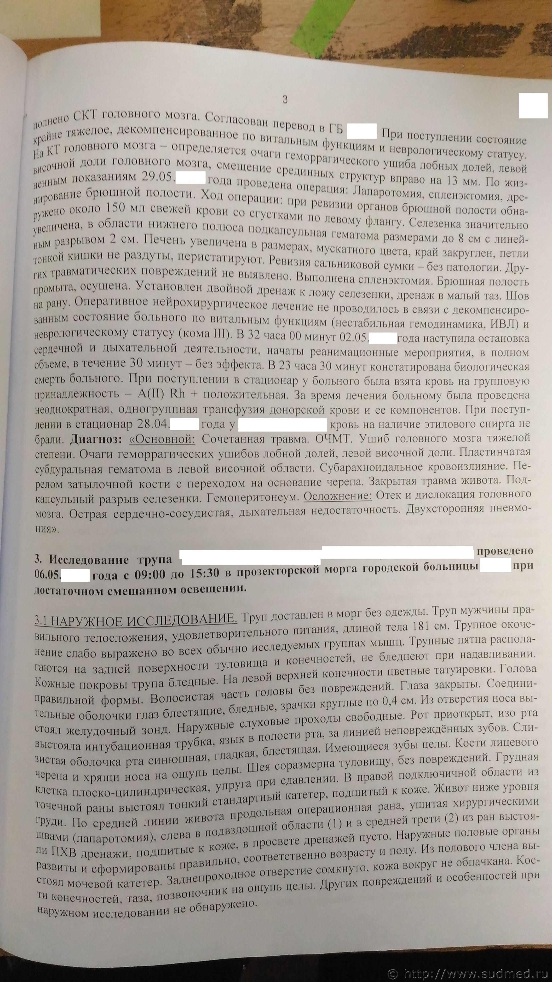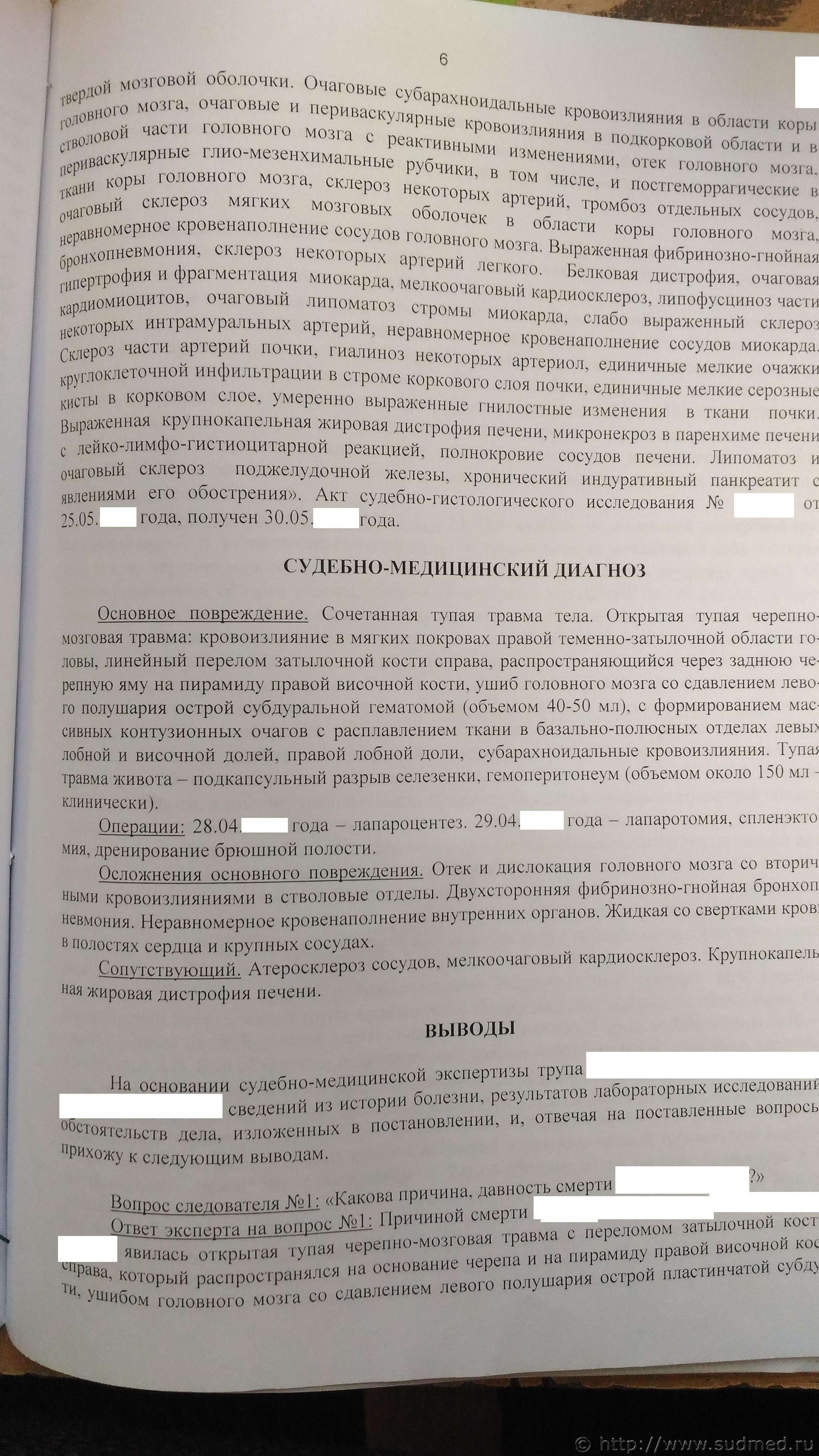 Я согласна с выводом эксперта,там всё написано сухим медицинским языком.По этой причине у меня и возникли вопросы.Подскажите ,пожалуйста, ОЧМТ подразумевает рану на голове,правильно я понимаю? Откуда могло взяться столько крови,если он из дома ушёл без повреждений?  |