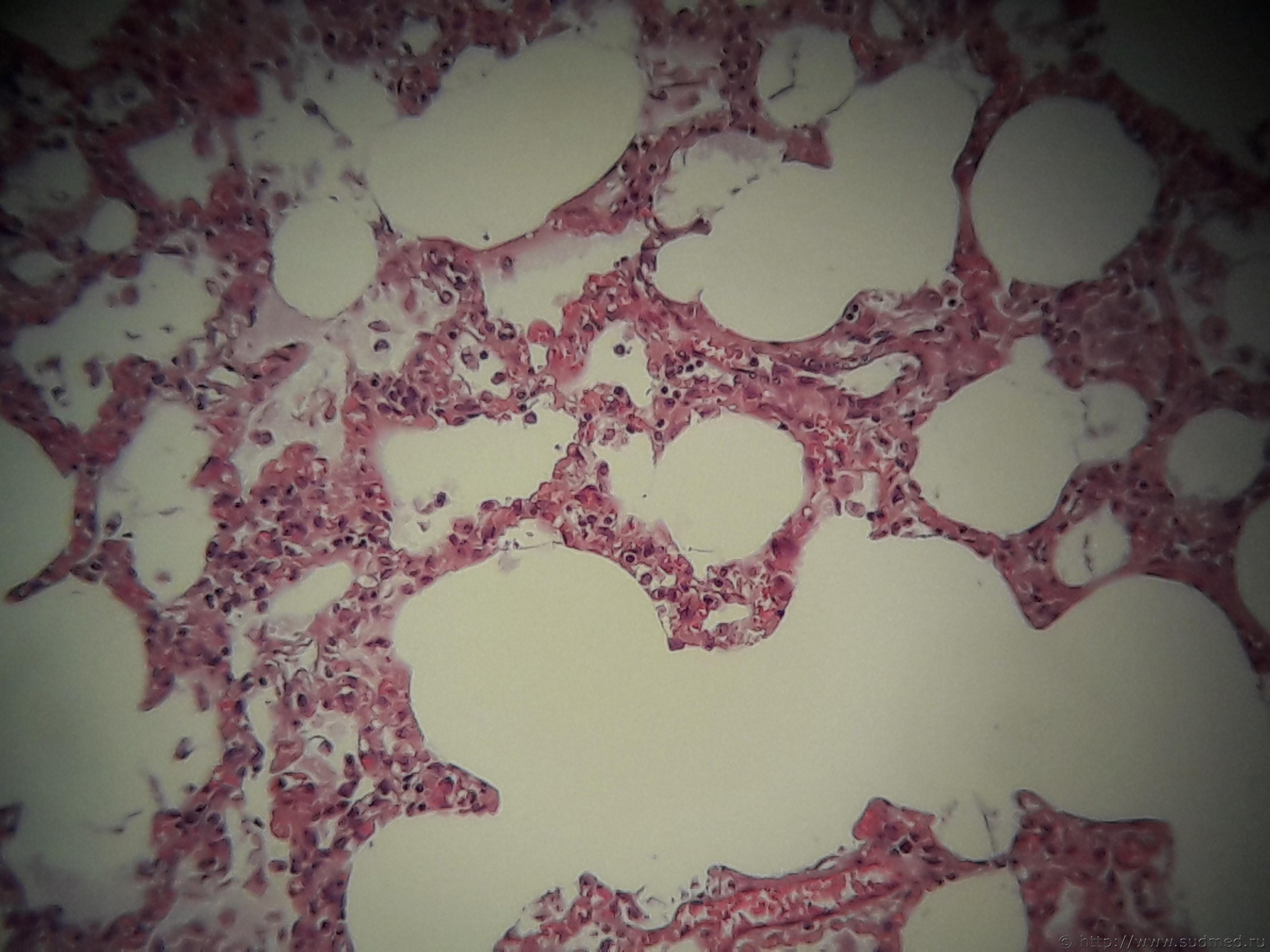 А мне непонятны крупные клетки в альвеолах -макрофаги?- (очень хорошо видны на втором снимке).Разъясните, пожалуйста! Спасибо! |