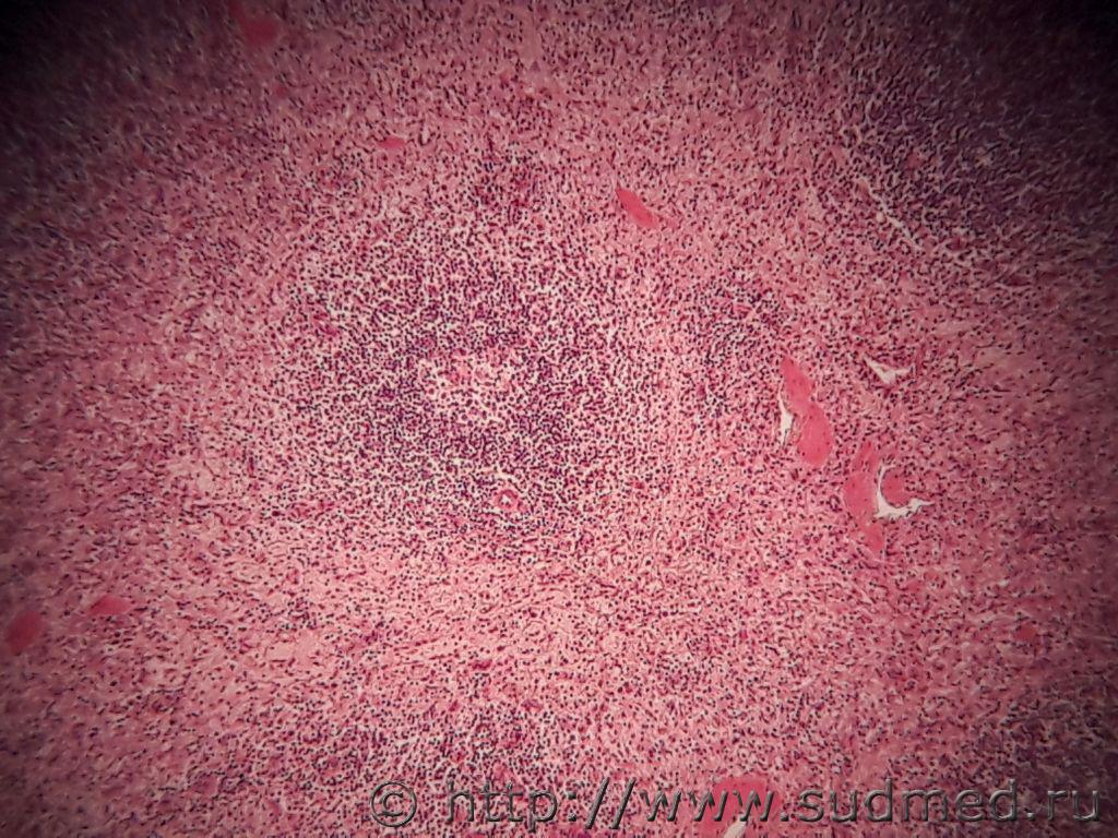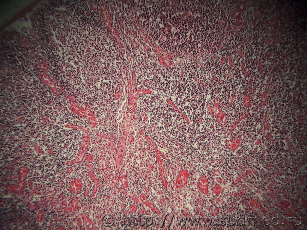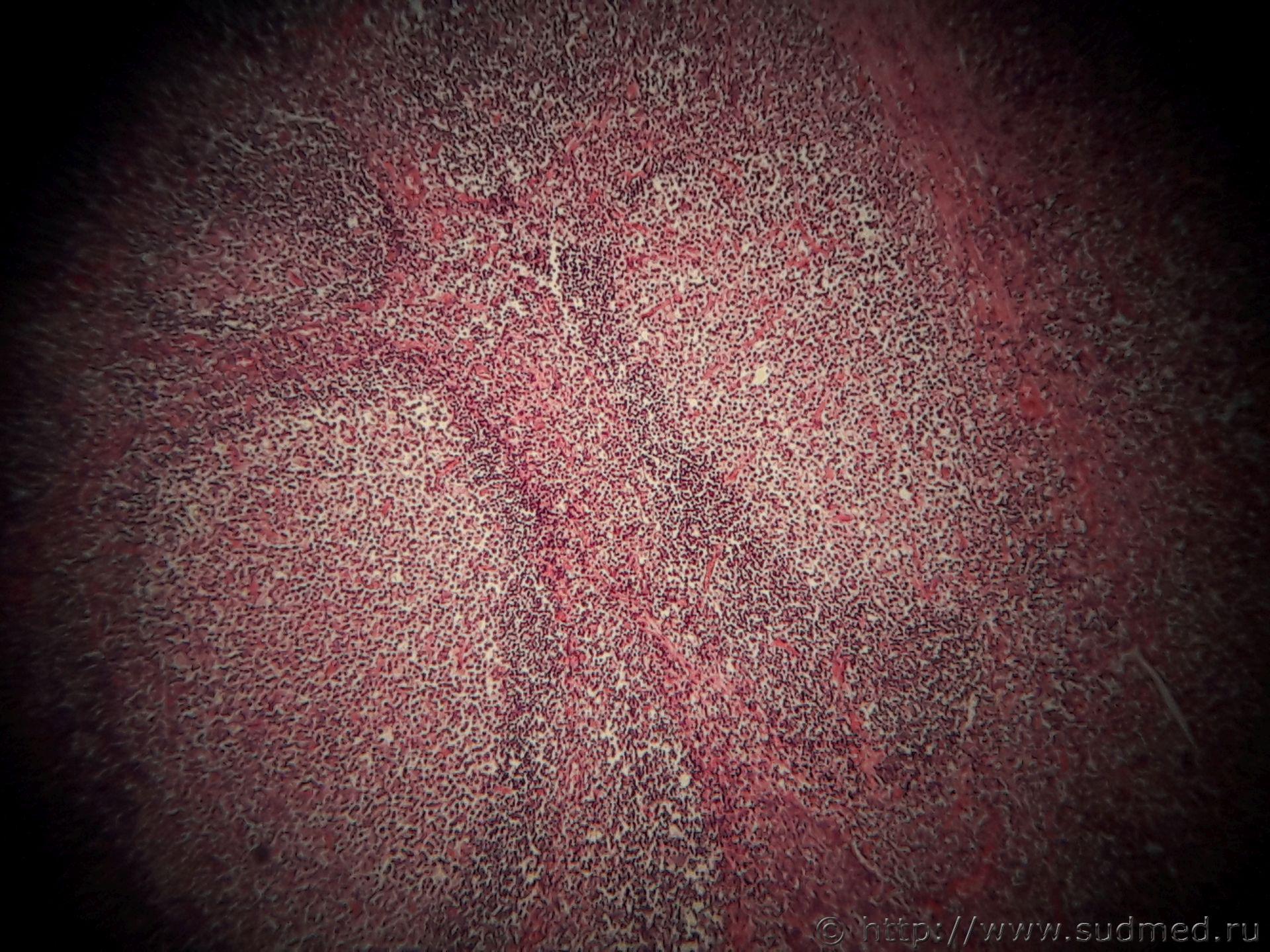 На вскрытии эксперт отметил отставание в весе и росте, несколько увеличенные шейные лимфоузлы. К сожалению, не могу больше фото прикрепить, хотел еще лимфатический узел, селезенку и печень добавить. |