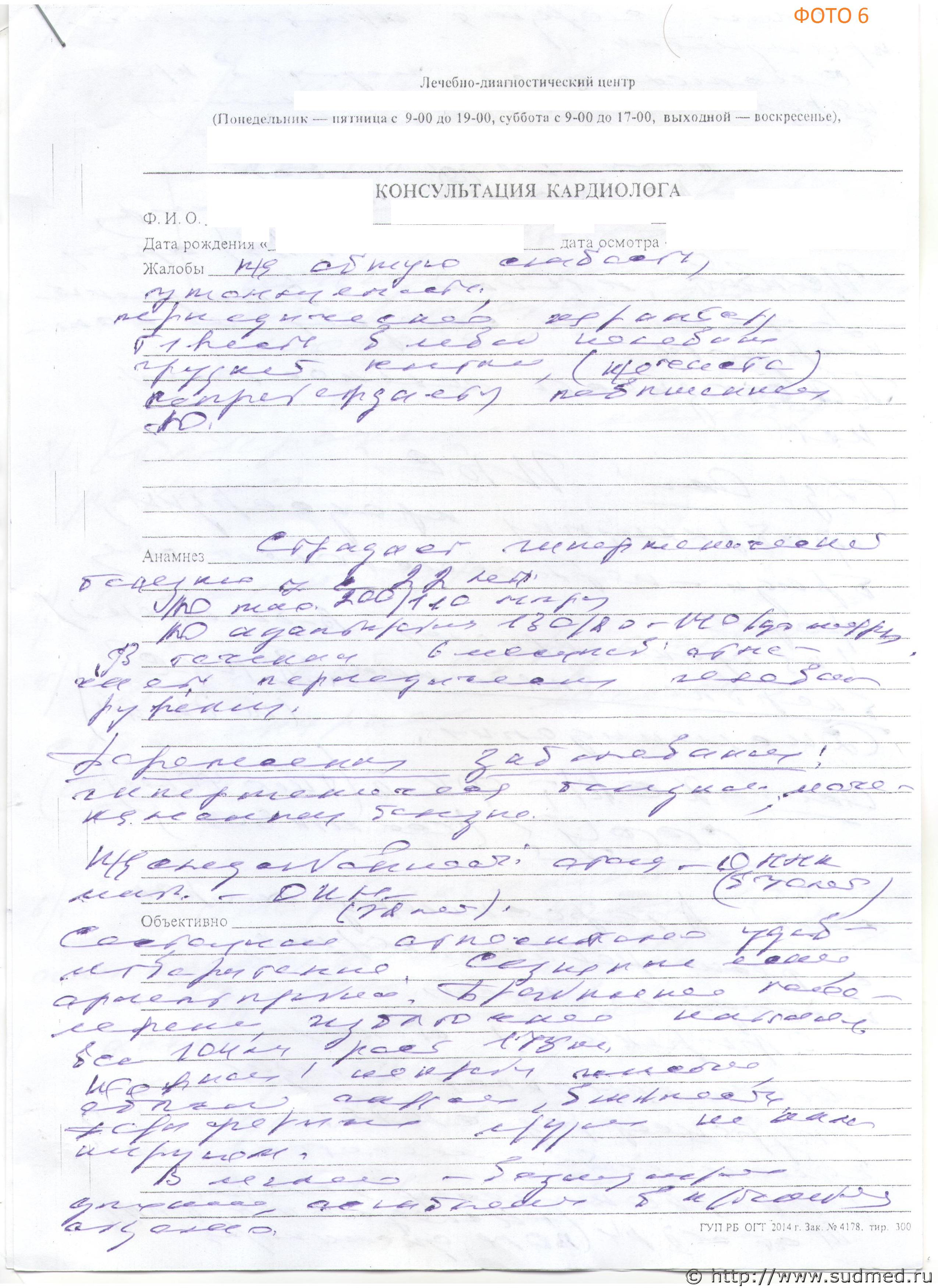 У моей семьи случилось горе, умер папа (55лет). Хочу разобраться не было ли халатного отношения врачей... В декабре 2015г. папа обращался к кардиологу, врач написал рекомендацию пройти каронарографию (фото №3-9). Он встал на учет у кардиолога в местной больнице. И поехал в Республиканский кардиологический центр на прием к врачу. Врач халатно и невнимательно относился к папе (разговаривал по телефону долгое время, не обращая внимания на него) и сказал, что каронарографию делать не нужно, а только следить за мерцательной аритмией (фото №1-2). Раз в квартал папа ездил на обследования (фото №10). В феврале 2017г. на работе, перед обедом, у него закололо плечо и появилось жжение в груди. После обеда он обратился с жалобами в мед.пункт. Ему замерили давление (было высокое) сделали укол магнезии и сульфокамфокаин и дали таблетки от давления. И отпустили работать. После работы он приехал домой, прилег отдохнуть. Через пол часа когда к нему подошли он уже не дышал. Вызвали скорую, спасти не смогли. После вскрытия в заключении о смерти написали - Атеросклеротическая болезнь сердца. Помогите разобраться, виноваты ли: врач не назначивший каронарографию и медики в мед.пункте не вызвавшие скорую, а отпустившие его работать? Куда обратится что бы наказали виновных? |