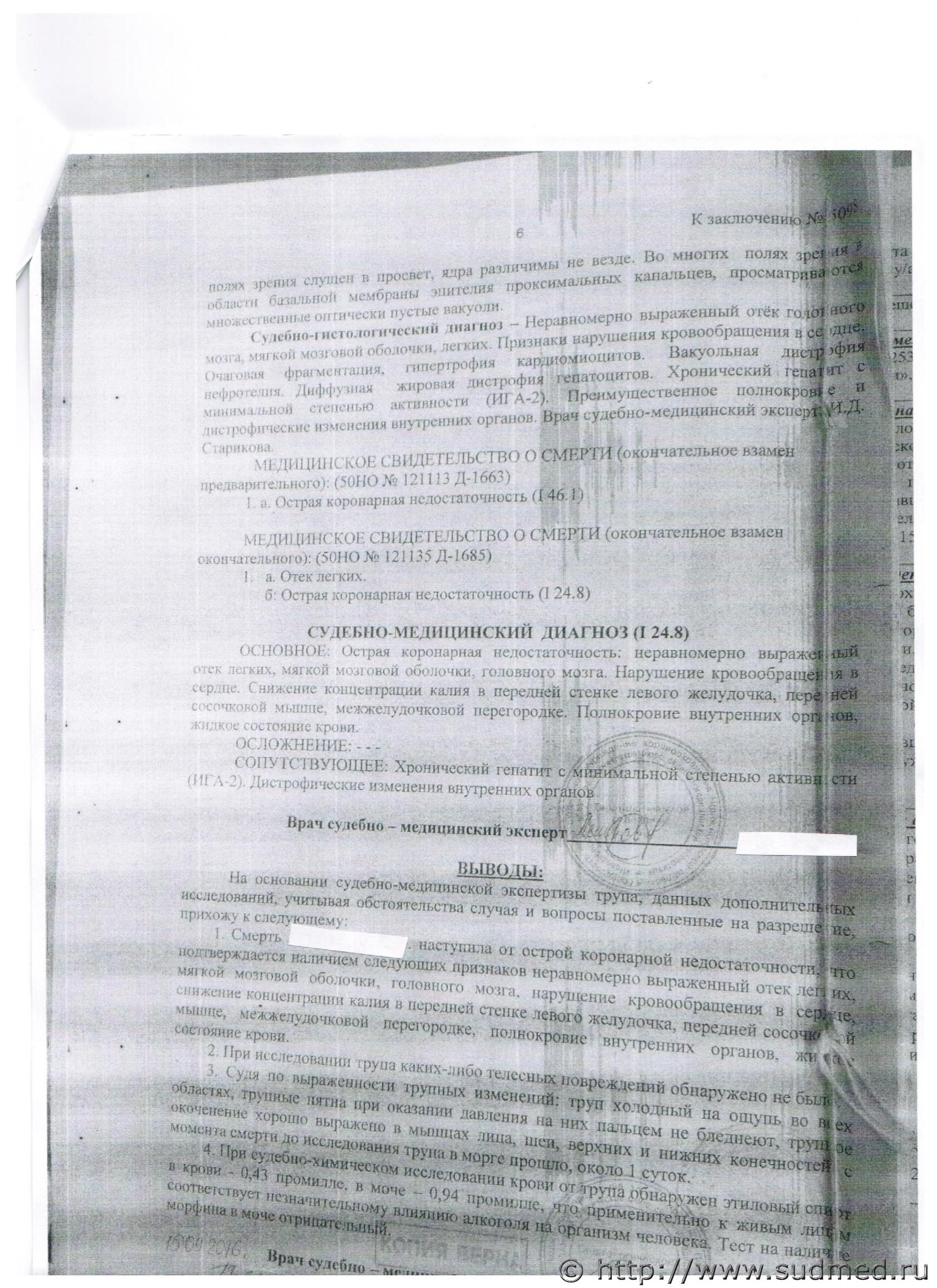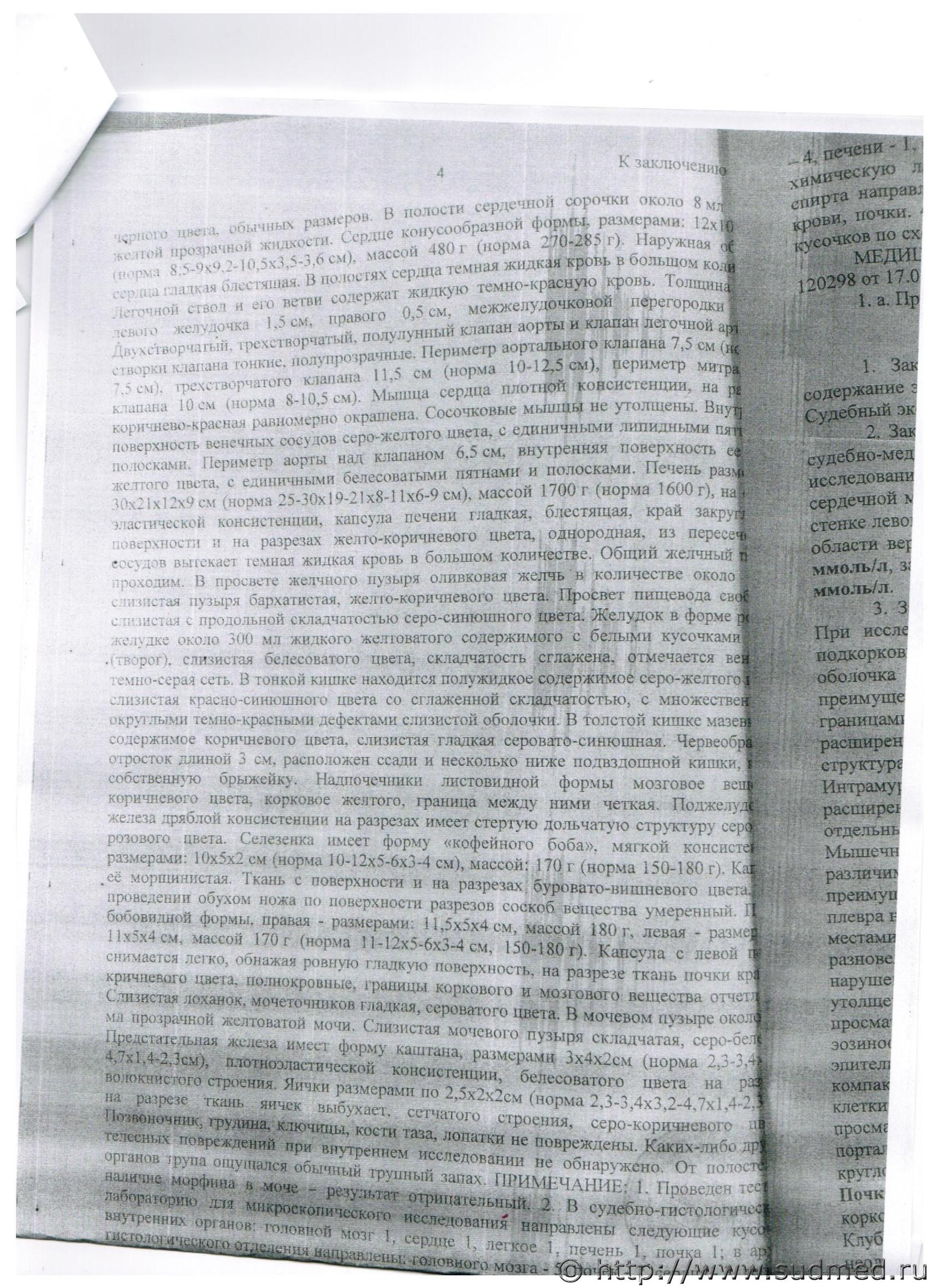 За данную патологию свидетельствуют результаты судебно-биохимического и гистологического исследований.Макроскопия миокарда и коронарных артерий описана плохо (мышца сердца плотной консистенции...,равномерной окраски + из описания следует,что стенозирующего коронарного атеросклероза нет).Таким образом,макроскопическое описание миокарда и коронарных артерий противоречат результатам судебно-гистологического исследования.Однако гистология дополнила макроскопию + результат биохимии = причина смерти. |