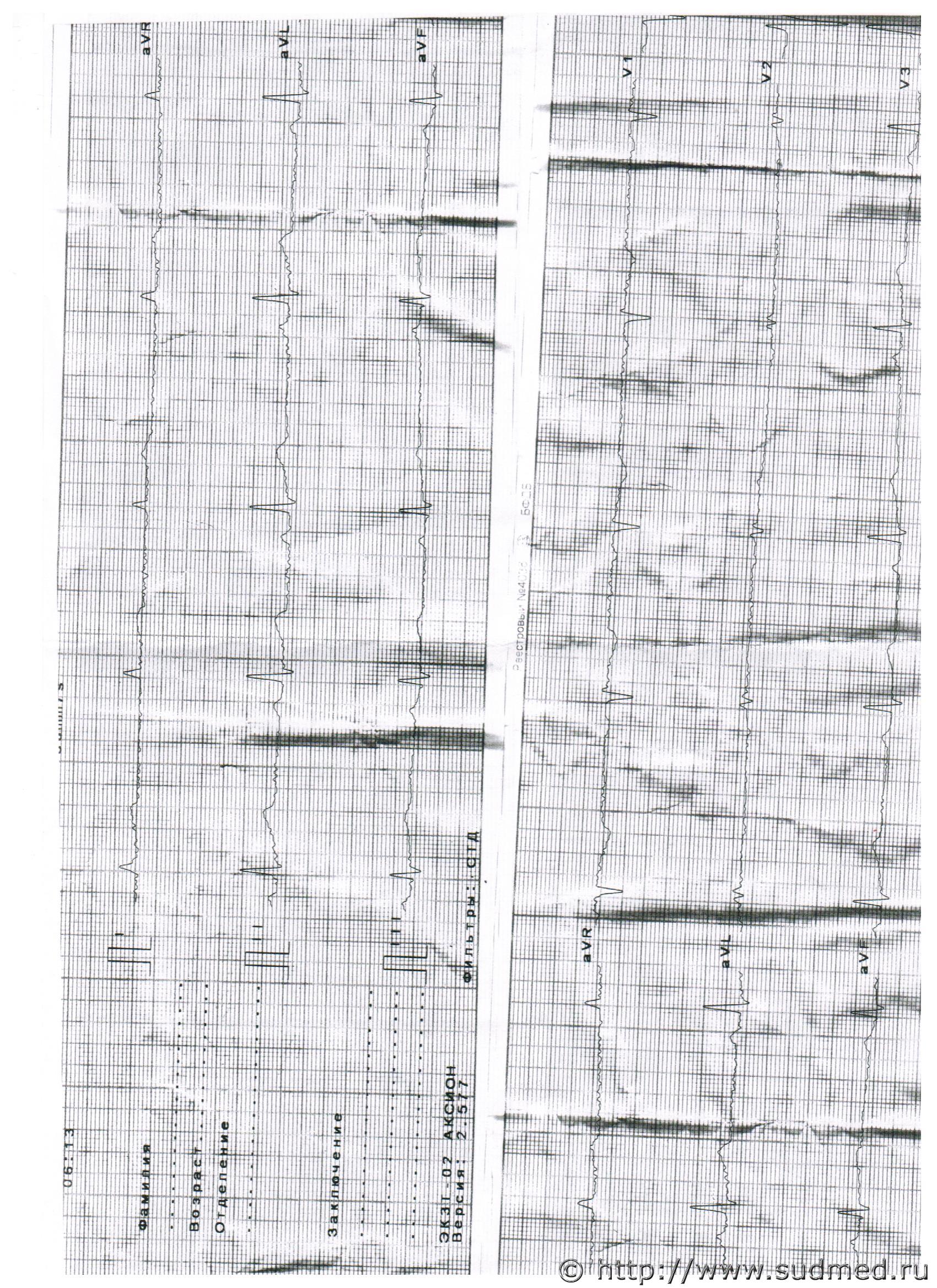 Пациент заболел ночью, из симптомов - многократная рвота, жжение за грудиной, одышка, холодный пот. Первый экипаж приехал в 6 утра, в карте вызова СМП описаны только жалобы на рвоту, по обследованиям все в норме, экг не делали ( но описание в карте есть, типа все нормально, данных за ОКС нет). Дз Абситнентный синдром. Назначен метоклопрамид + NaCl в/в. В 8.30 вторая скорая - аналогично и жалобы, и диагноз, и назначения.В общей сложности были у больного 11 мин. На последнем судебном заседании притащили пленки ЭКГ, которые до этого якобы были утеряны или утилизированы. Даже не знаю, как к ним отнестись. ЭКГ не выполнялось в-принципе.Описание в карте СМП не совпадает с данными пленки. Однако к материалам дела их приобщили, боюсь, что их будут рассматривать в рамках экспертизы. Вами представленном ЭКГ данных за ОКС не наблюдается. |
