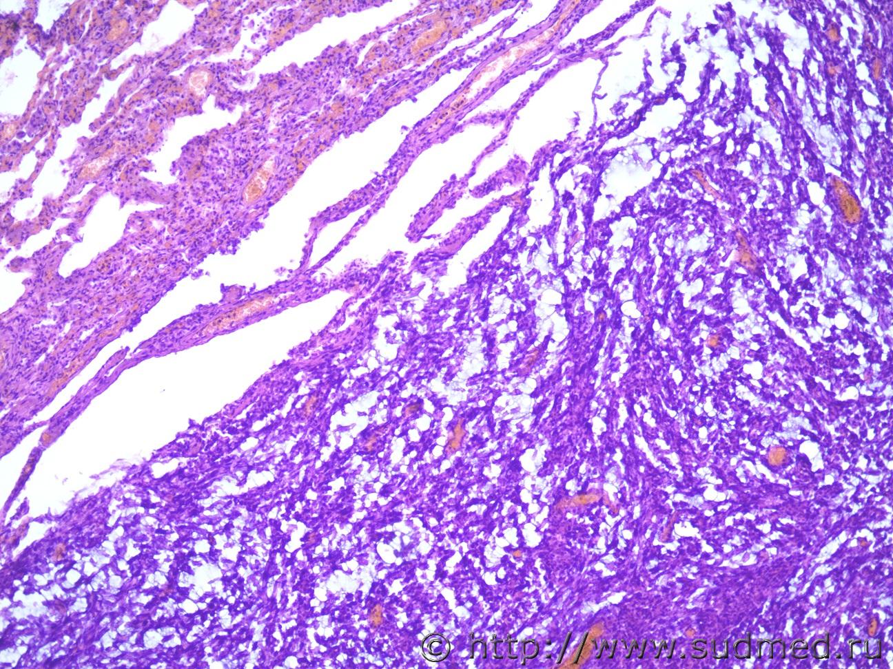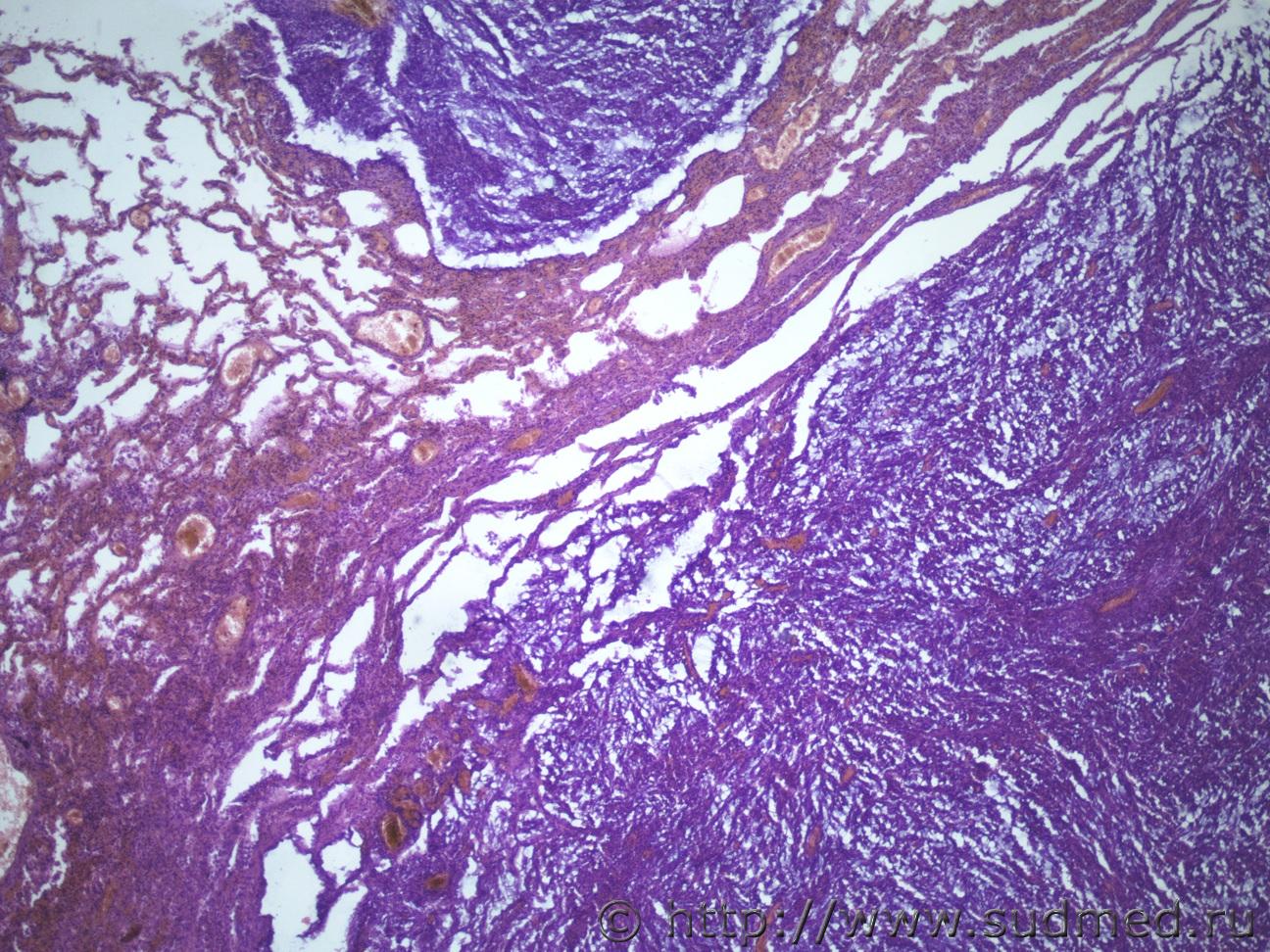 Посмотрите на просвет соседних альвеол и на межальвеолярную перегородку между "образованием" и соседними альвеолами. Мне видятся они полностью интактными, что не очень укладывается в воспалительную природу. Из-за отсутствия информации о возрасте и поле не хотелось бы говорить и об опухолевидной природе. Но есть одна болячка, которая может выдать Вам очень интересные и противоречивые находки - это ВИЧ. Резюме: позвоните танатологу и затребуйте максимально возможную информацию. Полагаю она Вам (и ему) поможет. |