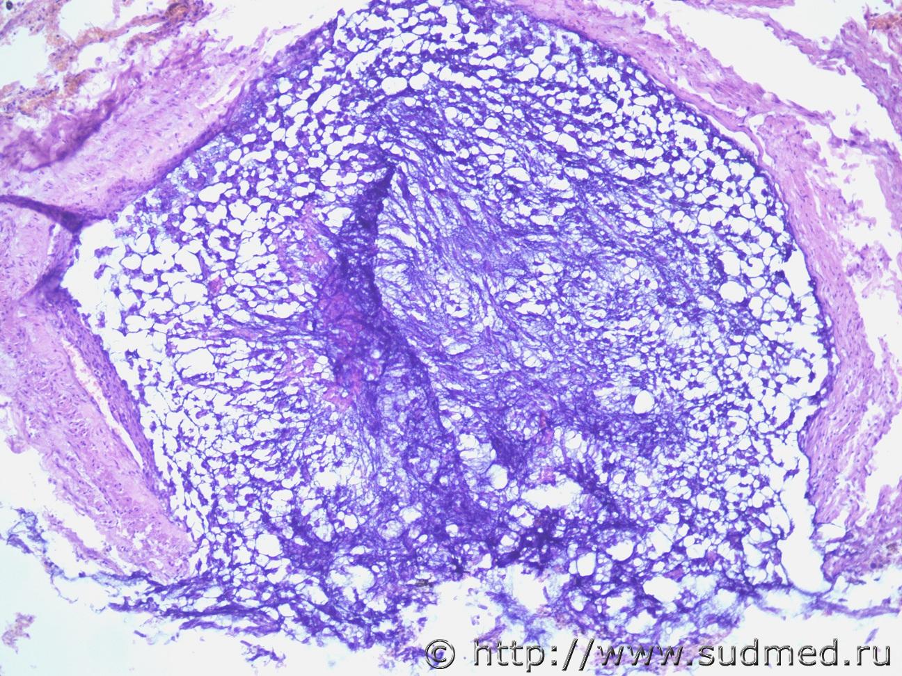 это что-то из слизеобразующих опухолей Предлагаю выход из создавшегося положения. В Международной гист.классификации опухолей лёгких есть так называемый муцинозный рак (8480/3). Возможно,это он и есть."Картинки" похожи. (метастазы, тромбы?) Раковые эмболы. |