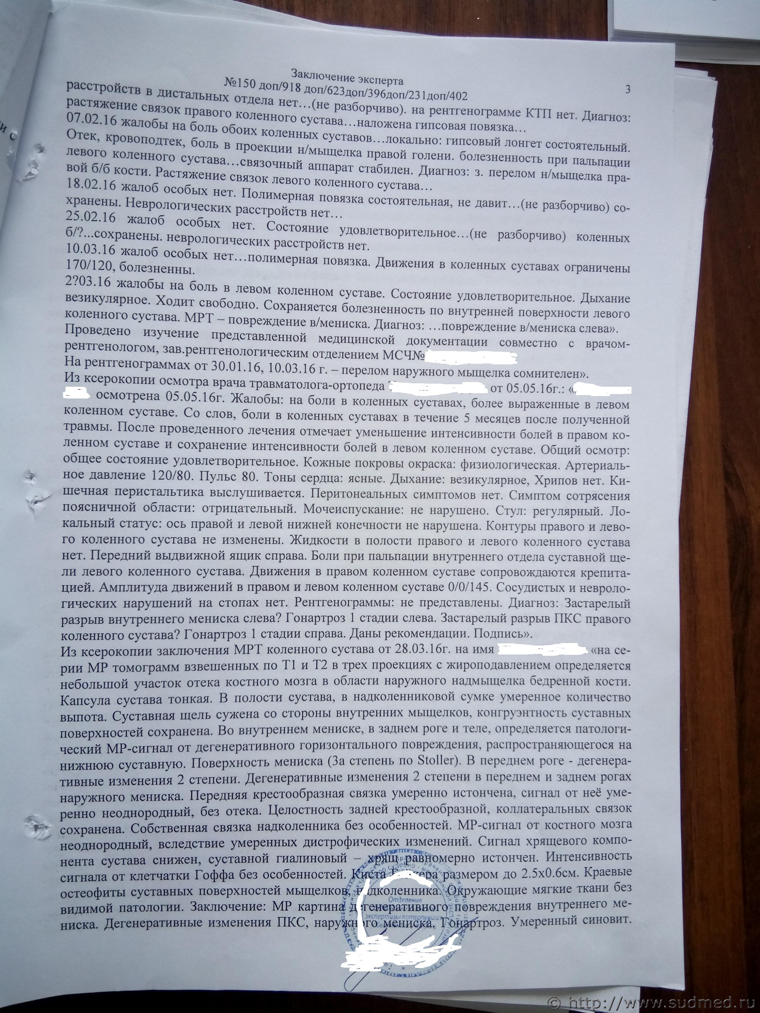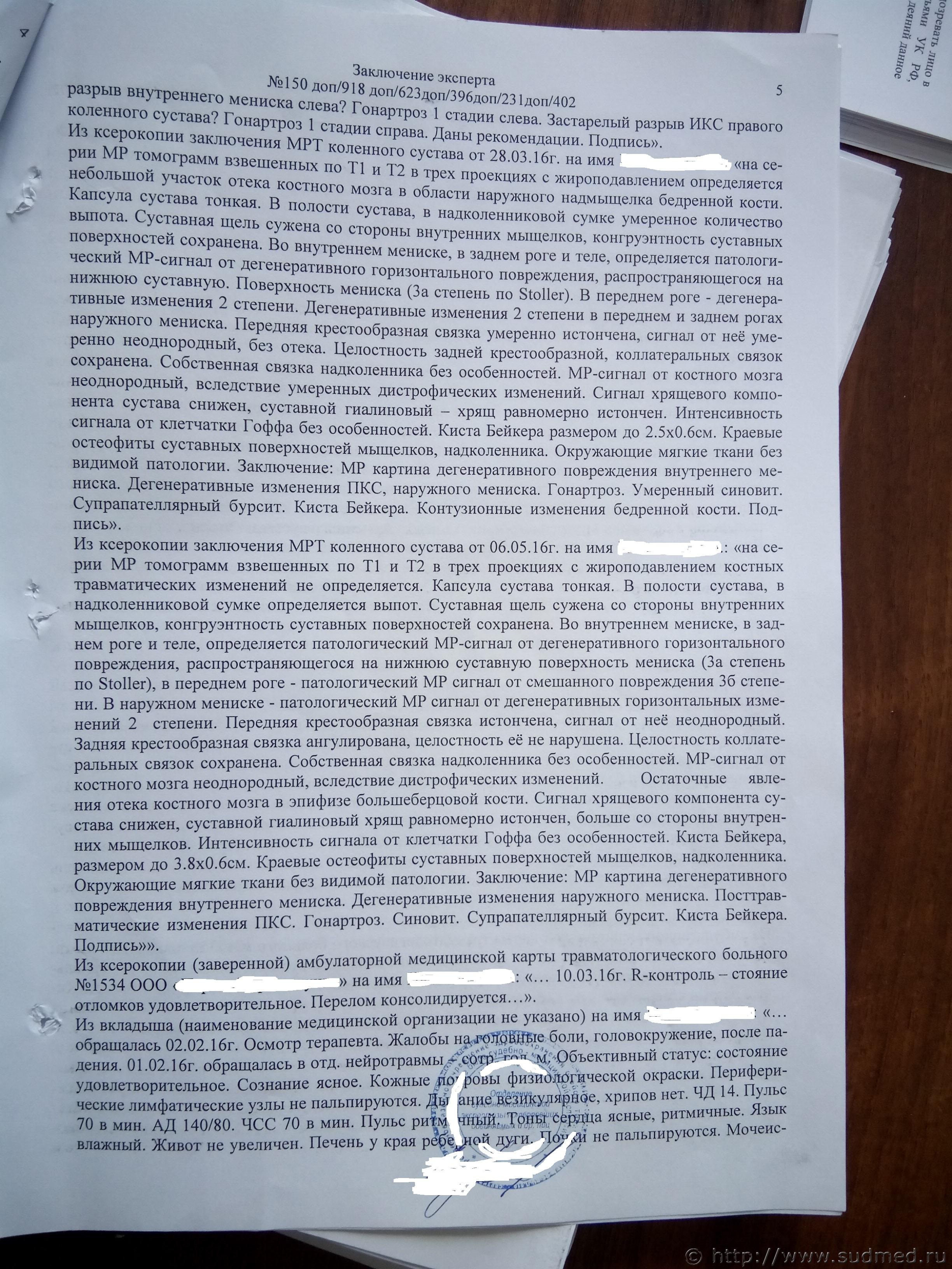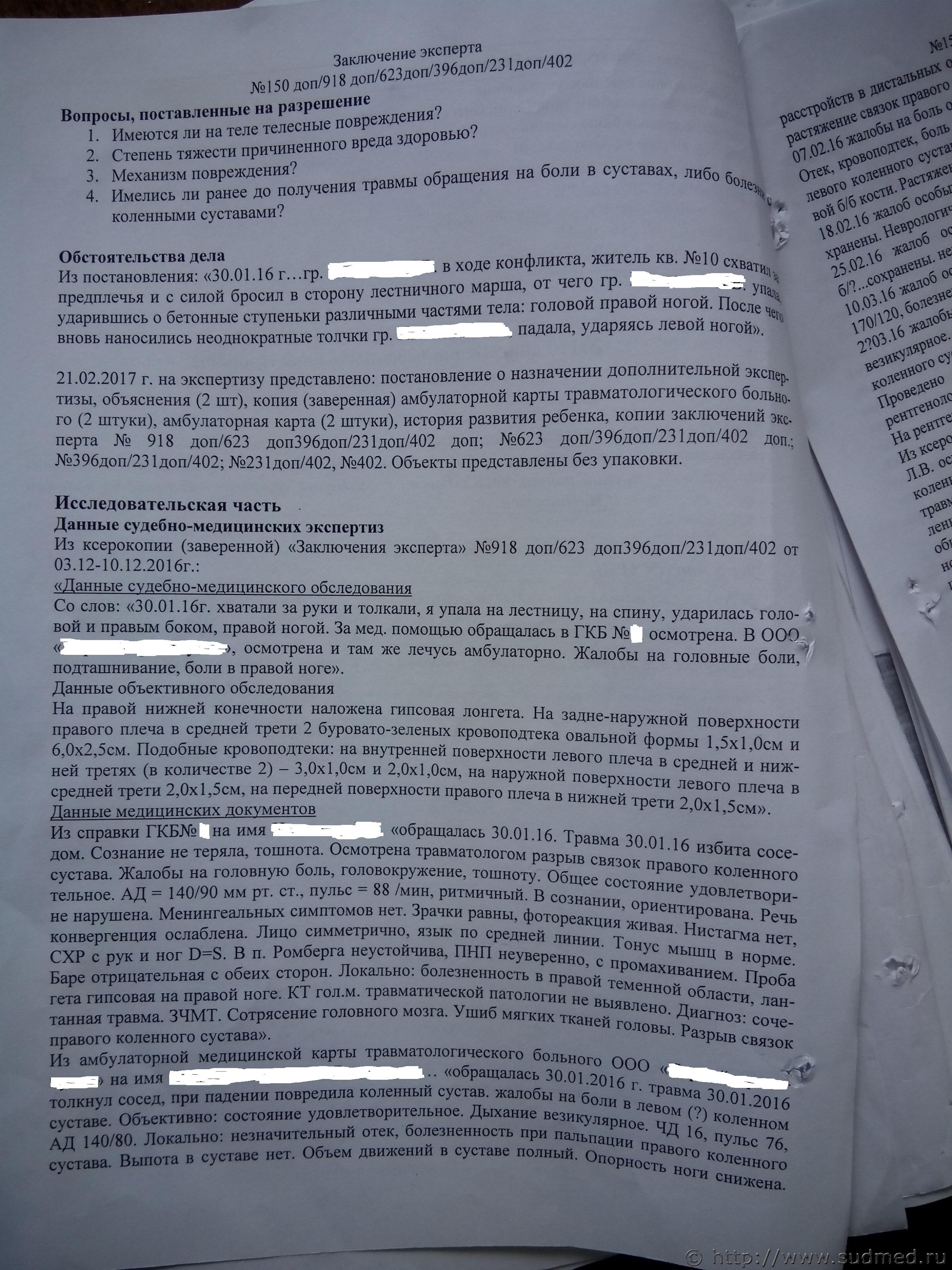 Суд отказал мне в вызове эксперта и присудил два с половиной года условно. Я подал апелляцию, сейчас суд принял решение вызвать эксперта. Заседание назначено на 15.11.2017г. Все 6 заключений СМЭ есть в теме, поэтому сразу пойду дальше. 1. Первые показания потерпевшей гласят , дословно -Не выслушивая меня , взял меня двумя руками за кофту в области груди и толкнул на лестничную площадку. От падения я ушибла или растянула колено правой ноги. (В дальнейшем она дважды, диаметрально меняет свои показания, на которых и было построено все обвинение). Вопрос – исходя из первых показаний конфликта, могла потерпевшая получить сочетанную травму тела в виде: сотрясения головного мозга, ушибов коленных суставов, повреждения внутреннего мениска левого коленного сустава, повреждения наружного мениска правого коленного сустава, кровоподтеков в количестве 6 штук на верхних конечностях ? 2. На суде, я поймал потерпевшую на лжи. Она заявила что 2.02.16г. в травмпункте ей сделали рентген и поставили диагноз – перелом коленной чашечки и разрыв внутреннего мениска слева. Одели гипс и отправили домой. На следующий день 3.02.16г. она лично идет в бюро СМЭ и жалуется только на правое колено. Хотя визуально эксперт описывает повязку на нижней конечности правой ноги, а не колене. В объективном исследовании эксперт не видит гипс на левой ноге, не пишет про рентген снимок и не приводит жалоб потерпевшей на левую ногу. 3. Вопрос – исходя из заключений СМЭ чем подтверждаются выводы эксперта: А) Сотрясение головного мозга . Б) Ушиб коленных суставов. В) Повреждение внутреннего мениска левого коленного сустава. Г) Повреждение наружного мениска правого коленного сустава. 4. Вопрос – Могла ли потерпевшая ходить с порванным мениском левого колена полтора года. Т.е до операции, которую ей сделали через полтора года после конфликта ? 5. Вопрос – исходя из материалов СМЭ какие вопросы нужно задать эксперту, что бы убедить суд в необоснованности выводов ? 6. Вопрос – о проведении какой лучше экспертизы просить суд : А) Дополнительной. Б) Повторной. В) Комиссионной разных экспертов. |