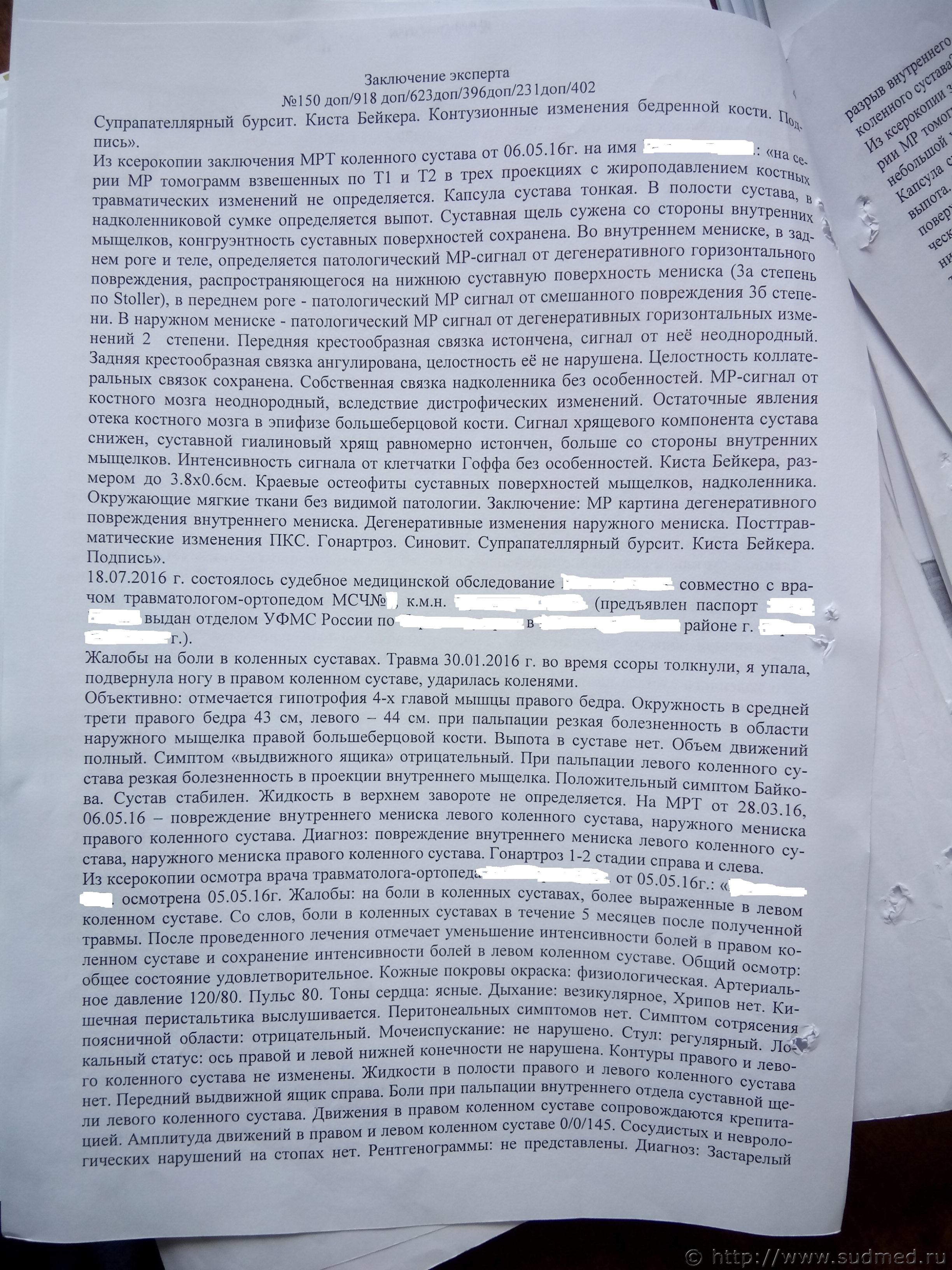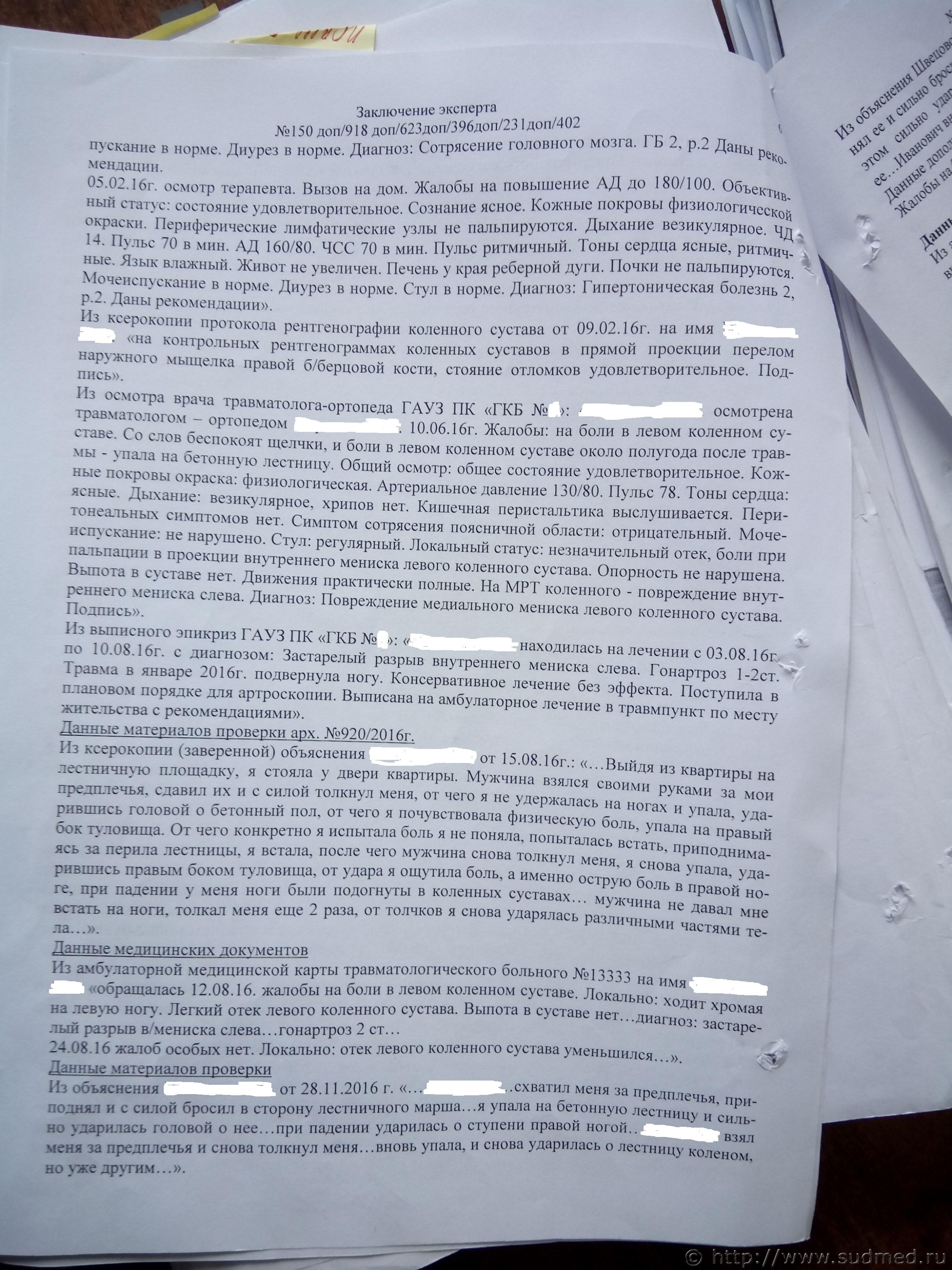 1. Следователь не дала полного текста обстоятельств, чем могла ввести в заблуждение эксперта. В объяснение написано: взял ее за предплечья, приподнял и бросил на третью ступеньку бетонного лестничного марша идущего вверх. Т.е. я поднял истицу на 50 см. и бросил в длину на 80 см. минимум. При этом я выше ее на 5 см. Мой вес 80 кг, ее 60 кг. У меня физически не хватило бы роста для такого броска. 2. Как понять формулировку : Локализация и свойства повреждений, в совокупности, не характерны для травмы полученной при падении потерпевшей на плоскости из положения стоя ? 3. Не нашел описания на что опирается эксперт по поводу ЗЧМТ. 4. В больнице 30.01.16г. был поставлен диагноз - растяжение связок правого коленного сустава ,у эксперта в заключении почему-то в разрыв связок. На освновании чего эксперт сделала такой вывод не понятно. 5. Все остальные повреждения (мениски и мыщелчки) согласно СМЭ появились 7.02.2016г. Посмотреть саму амбулаторную карту пока не представляется возможным.Т.е. через 8 дней после конфликта. 5. Во всех диагнозах по МРТ нет травматических изменений, есть только дегенеративные. 6. Вместе с адвокатом будем подать на повторную экспертизу. На что следует обратить внимание ? |