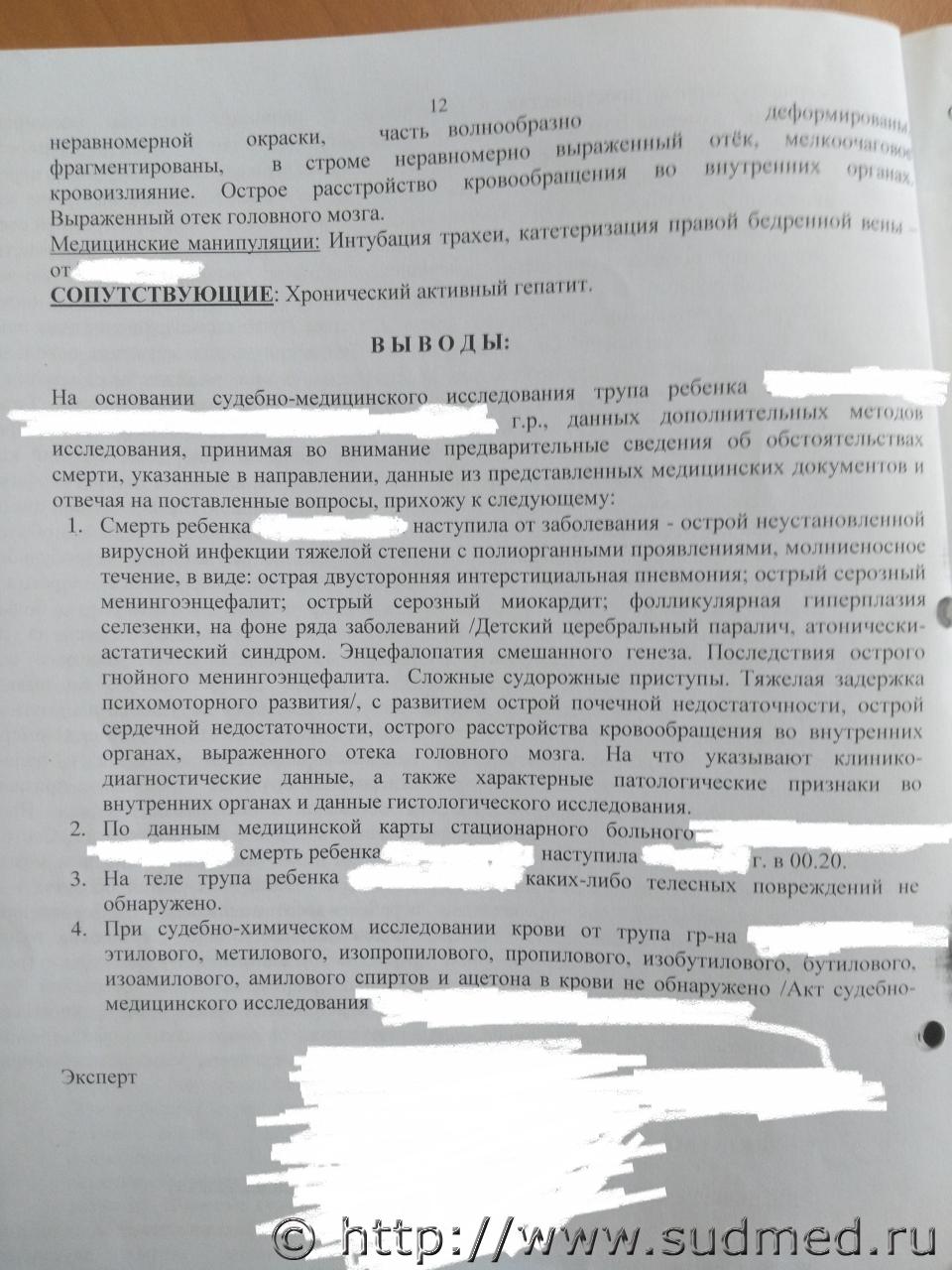 Здравствуйте. У ребенка в 3 года после проведения МРТ головного мозга под наркозом примерно через 14 часов наступила смерть. После проведения МРТ обратили внимание, что у ребенка посинел носогубный треугольник и тыльная сторона левой кисти. Врач осмотрел и сказал, что налицо низкое давление, такое состояние может быть после введенного лекарства, предупредил, что такое состояние у ребенка может быть до суток, кроме того может быть повышение температуры тела, сонливость и отправил домой. Всего в больнице находились около 2 часов, хотя направление было получено для госпитализации на сутки. По дороге домой ребенка один раз срыгнул желто-зелеными массами. Когда приехали домой, примерно через три часа после наркоза начала подниматься температура, которую сбивали только обтиранием. Созванивались с больницей, где проводили МРТ, там еще раз сказали, что такое состояние нормальное после наркоза и сбивать температуру лекарствами нельзя. Ребенок весь день спал, примерно через 9 чаов проснулся, выпил около 350 мл воды и снова уснул. Через некоторое время начались какие-то посинения, после этого вызвали скорую, доставили в больницу, где несмотря на реанимационные мероприятия ребенок скончался. Анамнез: в 7 месяцев ребенок перенес пневмонию, через 2 недели после выписки из стационара заболел менингитом. В период лечения менингита выявили субдуральную гигрому головного мозга слева. Которая впоследствии после лечения ушла и не обнаруживалась при дальнейших обследованиях. Ребенок начал отставать в развитии (задержка речи, психо-моторного развития). Физически (рост, вес) был немного крупнее своего возраста. Был поставлен диагноз: энцефолапатия смешанного генеза, последствия перенесенного острого гнойного менингоэнцефалита, тугоухость, в связи с судорогами на фоне температуры - эпилепсию под вопросам. Установлена инвалидность. В течение примерно года постоянно болел респираторными заболеваниями. Прошел обследования на состояние имунного статуса, основные генетические заболевания, обследования сердца, никаких отклонений не было выявлено. Проходил реабилитационные мероприятия. Через полтора года после перенесенного менингита диагноз-тугоухость был снят. В связи с тем, что ребенок переболел менингитом в возрасте до одного года поставили диагноз, ДЦП, атонически-астатический синдром. Примерно в два года первый раз сел самостоятельно и в этот же период перестал болеть респираторными заболеваниями (более года ничем не болел). Далее развитие начало прогрессировать, стал уверенно сидеть, начал ползать, обращать внимание на игрушки, окружающую обстановку. После последнего посещения реабилитационного центра у ребенка было несколько приступов как будто он чего-то пугался, он вскрикивал. Обратились к неврологу, который предположил, что на фоне физической активности у него были эпилептические припадки. Отменил все физические нагрузки, массаж и порекомендовал сделать повторно МРТ головного мозга для сравнения с ранее сделанным МРТ (за два года до этого). Вывод эксперта предполагает основной диагноз:острую неустановленную вирусную инфекцию тяжелой степени с полиорганными проявлениями, молниеносное течение и т.д. Вопросы: 1. Правильный ли вывод сделал эксперт? 2. Если неправильный, то в чем? 3. Каким образом должен быть обоснован вывод наступив