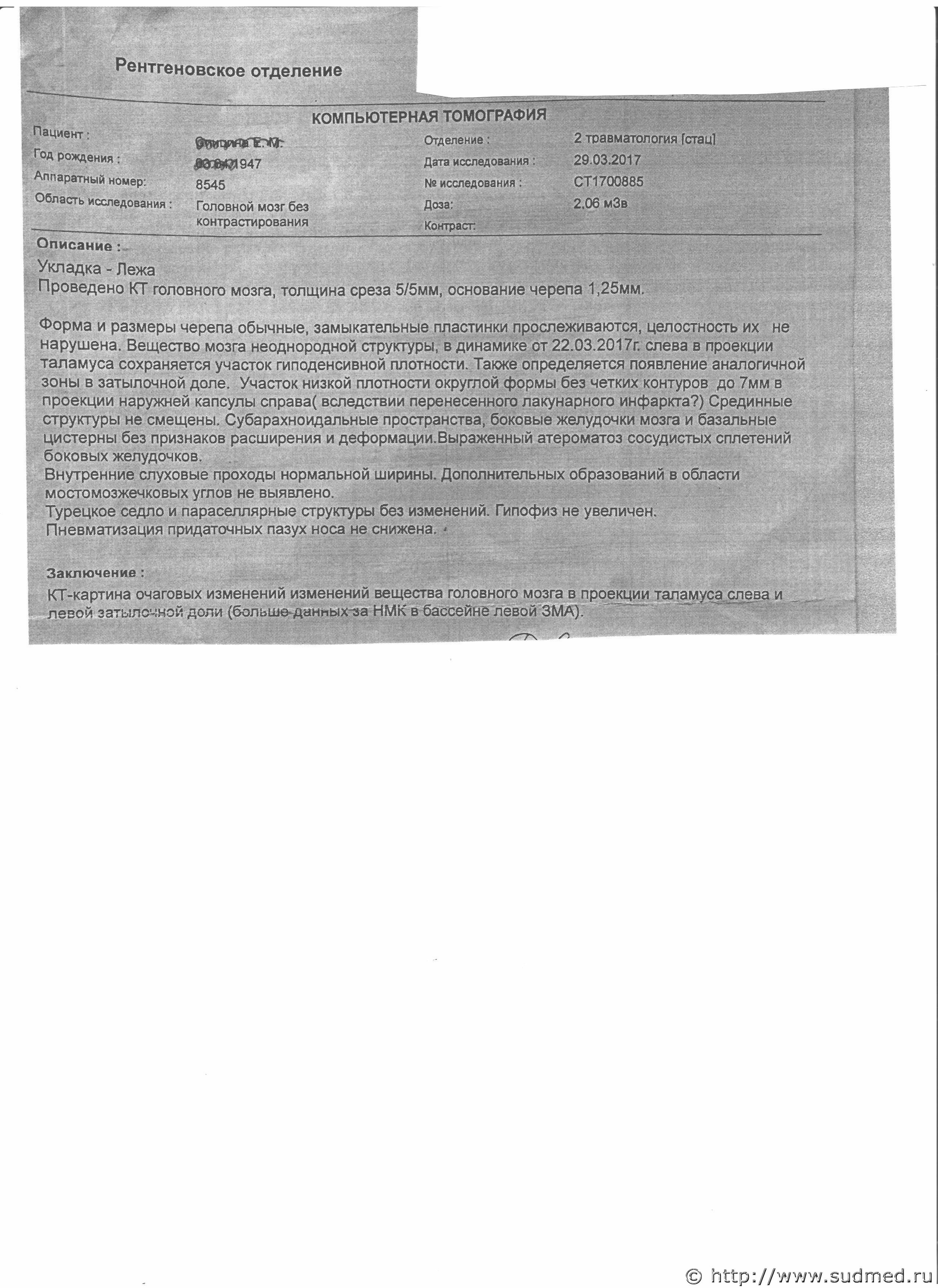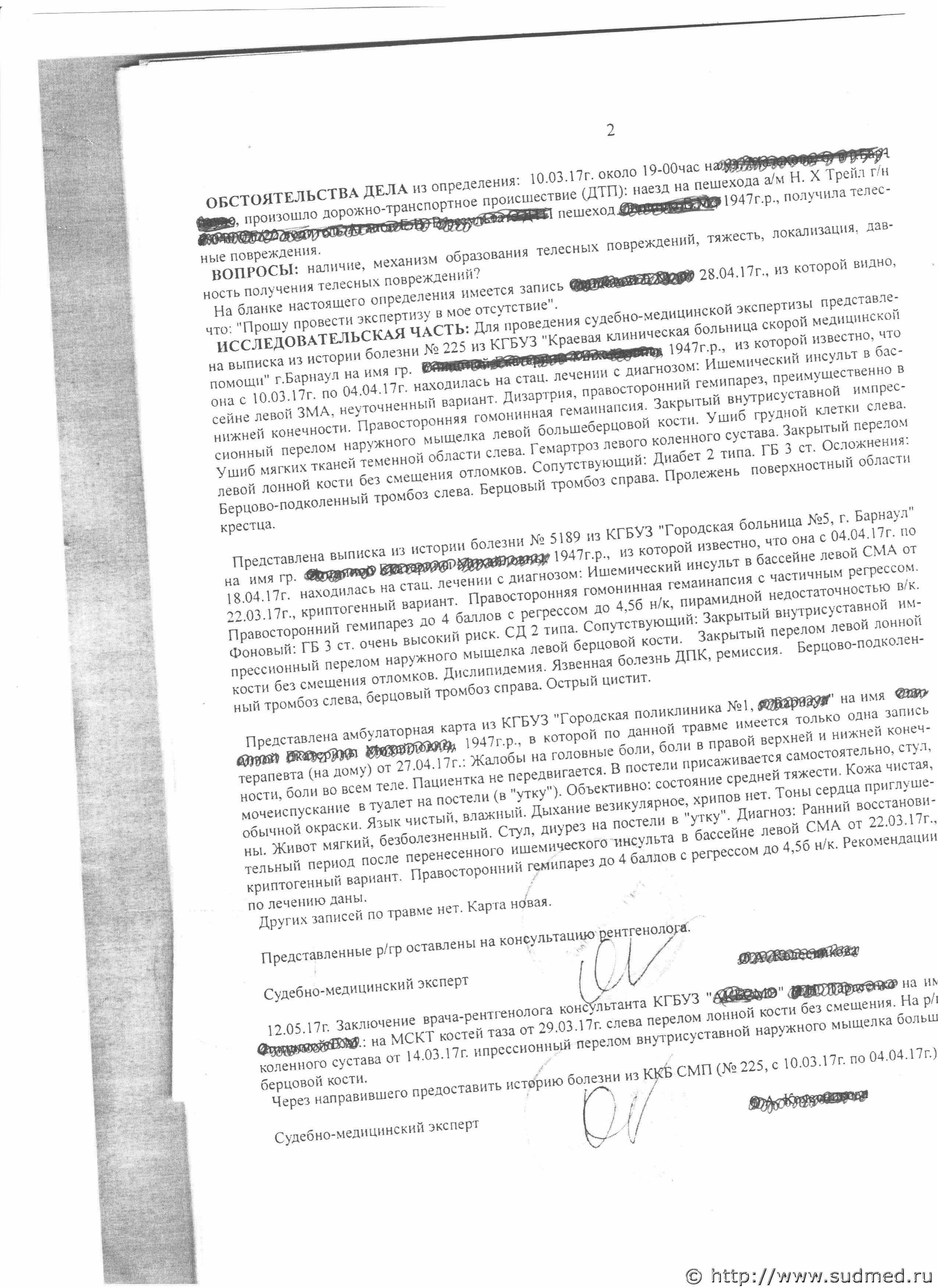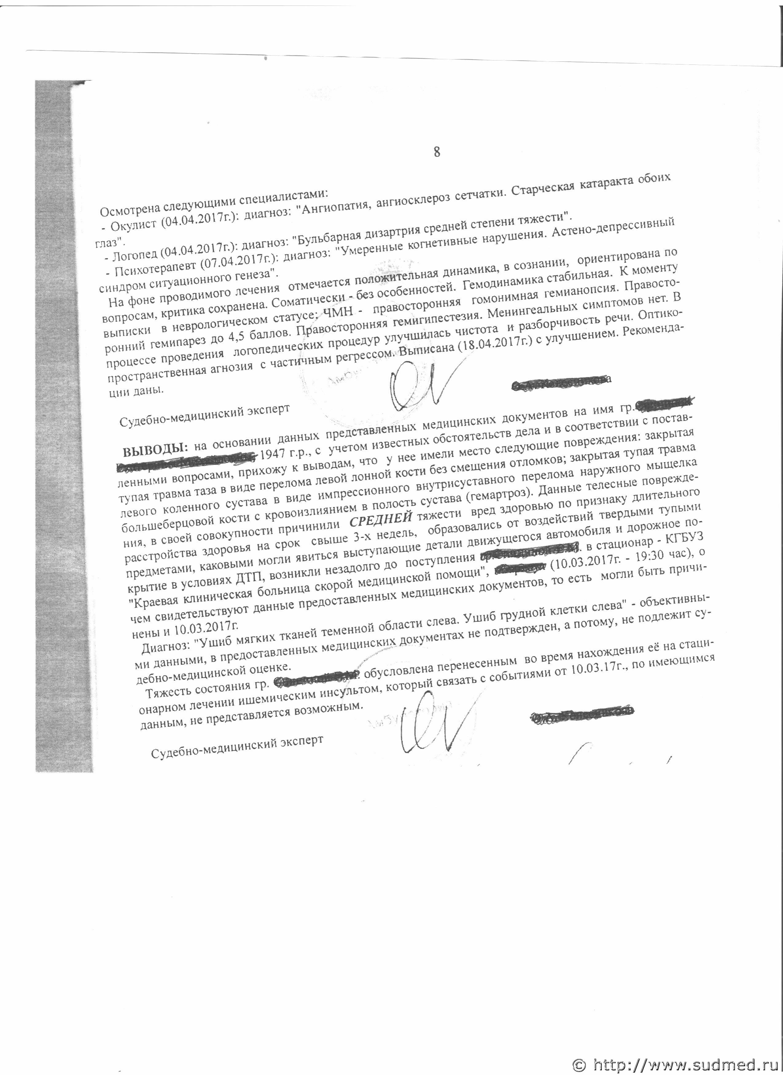 Мою маму сбила машина на пешеходном переходе на зеленый свет. В больнице СМП были поставлены диагнозы: перелом лонной кости, перелом наружного мыщелка левой голени со смещением, ушиб мягких тканей теменной области слева, ушиб грудной клетки слева. Первоначально ставился также диагноз закрытый вколоченный перелом шейки левого бедра. Во время операции на голени по установке винтов случился инсульт. Мама лежала в больнице с момента травмы до операции 13 дней. После инсульта ей сделали дуплекс вен и обнаружили берцово-подколенный тромбоз слева (в месте травмы). В проведенная СМЭ инсульт не связывают с последствиями ДТП. Эксперт также игнорирует диагнозы лечащих врачей: ушиб мягких тканей теменной области слева и ушиб грудной клетки слева, которые могли быть причиной инсульта. В выписке БСМП прямо указано на то, что инсульт-это осложнение травмы. Никогда ранее до травмы никаких проблем с тромбами или мозговым кровообращением у мамы не было. После инсульта у мамы парез всей правой части тела, выпадение поля зрения справа. Была очень активным человеком до ДТП, сейчас из дома даже не выходит, боли, слабость. Лечили инсульт еще в двух больницах. Лечимся на дому постоянно. Толка почти нет. Эксперт относит травмы лишь к средней степени тяжести. Можно ли отнести инсульт к последствиям ДТП? Возможно ли квалифицировать повреждения, как тяжкие?