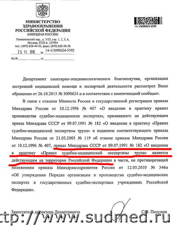 ПРИКАЗ 9 июля 1991 г. N 182 О ВВЕДЕНИИ В ПРАКТИКУ "ПРАВИЛ СУДЕБНО-МЕДИЦИНСКОЙ ЭКСПЕРТИЗЫ ТРУПА" 3. Хранение и выдача носильных вещей, ценностей, документов умершего и других предметов, доставленных с трупом или обнаруженных при его исследовании 3.1. Одежда и обувь, доставленные в морг вместе с трупом, после окончания исследования трупа хранятся в морге в опечатанном металлическом шкафу или в сейфе при комнатной температуре, в сухом виде в полиэтиленовых или бумажных мешках с биркой. Ответственность за хранение возлагается на одного из санитаров морга. Контроль за правильностью хранения осуществляет заведующий отделом судебно-медицинской экспертизы трупов или заведующий городским, районным, межрайонным отделением судебно-медицинской экспертизы. 3.2. Ценности, документы и другие предметы, доставленные с трупом или обнаруженные при его исследовании и могущие стать вещественными доказательствами, хранятся в опечатанном металлическом шкафу или сейфе у заведующего отделом судебно- медицинской экспертизы трупов или заведующего городским, районным, межрайонным отделением судебно-медицинской экспертизы. 3.2.1. В случае обнаружения при судебно-медицинской экспертизе трупа предметов, которые могут быть, по мнению судебно- медицинского эксперта, вещественными доказательствами, заведующий отделом судебно-медицинской экспертизы трупов или заведующий городским, районным, межрайонным отделением судебно-медицинской экспертизы обязан известить об этом органы внутренних дел или прокуратуры, 3.3. Носильные вещи, ценности и документы выдаются родственникам или близким умершего либо другим лицам под расписку только с письменного разрешения органов внутренних дел или прокуратуры. В "Журнале регистрации носильных вещей, вещественных доказательств, ценностей и документов в морге" производится соответствующая запись. 3.4. Изъятие одежды, обуви, ценностей и документов умершего работниками органов внутренних дел или прокуратуры оформляется соответствующим протоколом. 3.5. Одежда, обувь, ценности и другие предметы, доставленные с трупом и неистребованные в течение одного месяца, а также в случаях насильственной смерти, передаются органам внутренних дел или прокуратуры либо по их письменному предписанию уничтожаются с оформлением соответствующего акта. Эскизы прикрепленных изображений |
