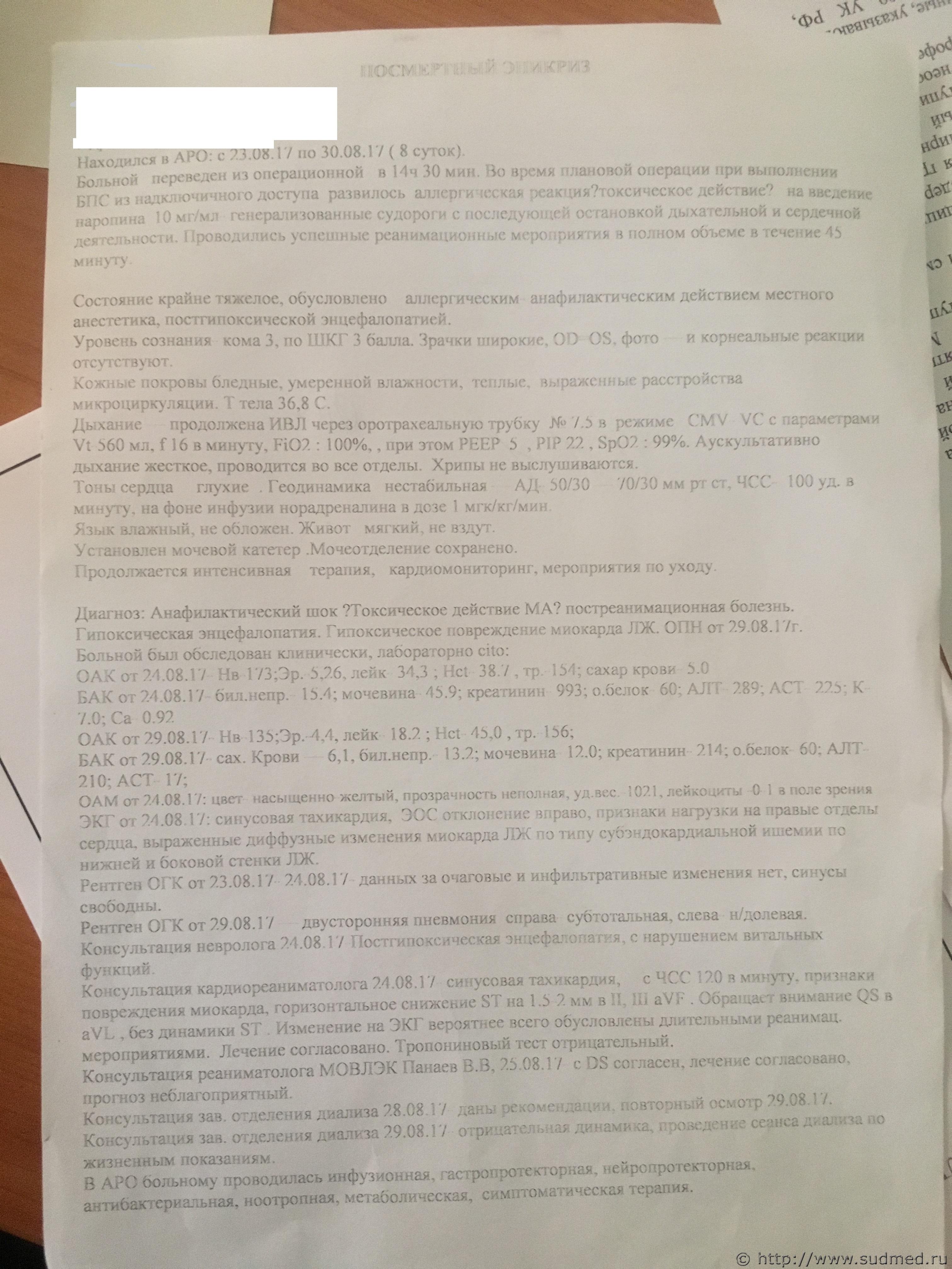 М 22 при выполнении проводниковой анестезии препаратом наропин в дозе 10 мг\мл\кг из надключичного доступа, развилась токсическая реакция на препарат (судороги, остановка дыхания, сердечной деятельности) реанимационные мероприятия в течении 40 мин дали эффект. Был переведен в АРО где получал симптоматическое лечение. На 6 е сутки начат острый диализ. На 8 е сутки скончался. Анестезиолог, выполнявший блокаду клянется что аспирационная проба была отрицательная. Акт вскрытия еще не готов. Но мед свидетельство о смерти выдано. В нем указано что смерть наступила в следствии анафилактического шоке. Так же в мед свидетельстве не указано время смерти. Точный диагноз не установлен, по словам СМЭ он не знает от чего он умер. Вопрос: в следствии чего наступила токсическая реакция? Ошибочное попадание в сосудистое русло? передозировка препарата? PS: в инструкции к препарату,в случае попадания в сосудистое русло, описаны идентичные симптомы: генеральзованные судороги, брадикардия и тд. Эскизы прикрепленных изображений |