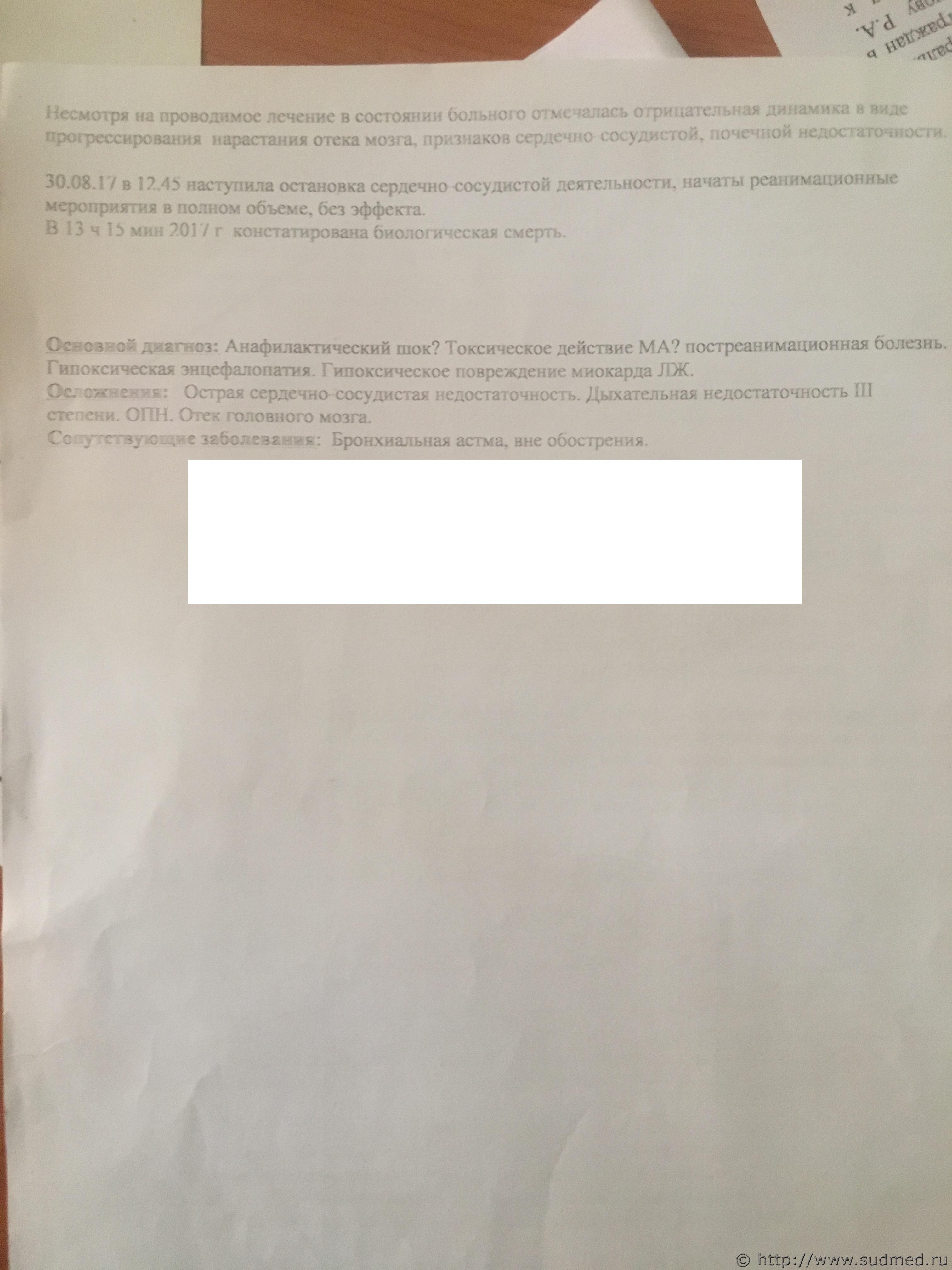 Акт вскрытия еще не готов. Но мед свидетельство о смерти выдано. В нем указано что смерть наступила в следствии анафилактического шоке. Так же в мед свидетельстве не указано время смерти. Точный диагноз не установлен, по словам СМЭ он не знает от чего он умер. 1.Когда будет готов Акт,прочитайте его и если у Вас будут вопросы,представьте нам. 2.В медицинском свидетельстве о смерти указана причина смерти - это анафилактический шок. Время смерти отмечено в истории болезни и в представленных Вами файлах.Если эксперту будет задан вопрос о давности наступления смерти - он ответит в заключении.От того,что время смерти не вписано в МСС - ничего не изменится. 3.СМЭ много говорит и противоречит сам себе. Ждите Акт. Пока тему закрыл. По Акту появятся вопросы,обратитесь к любому модератору с просьбой открыть эту тему. |