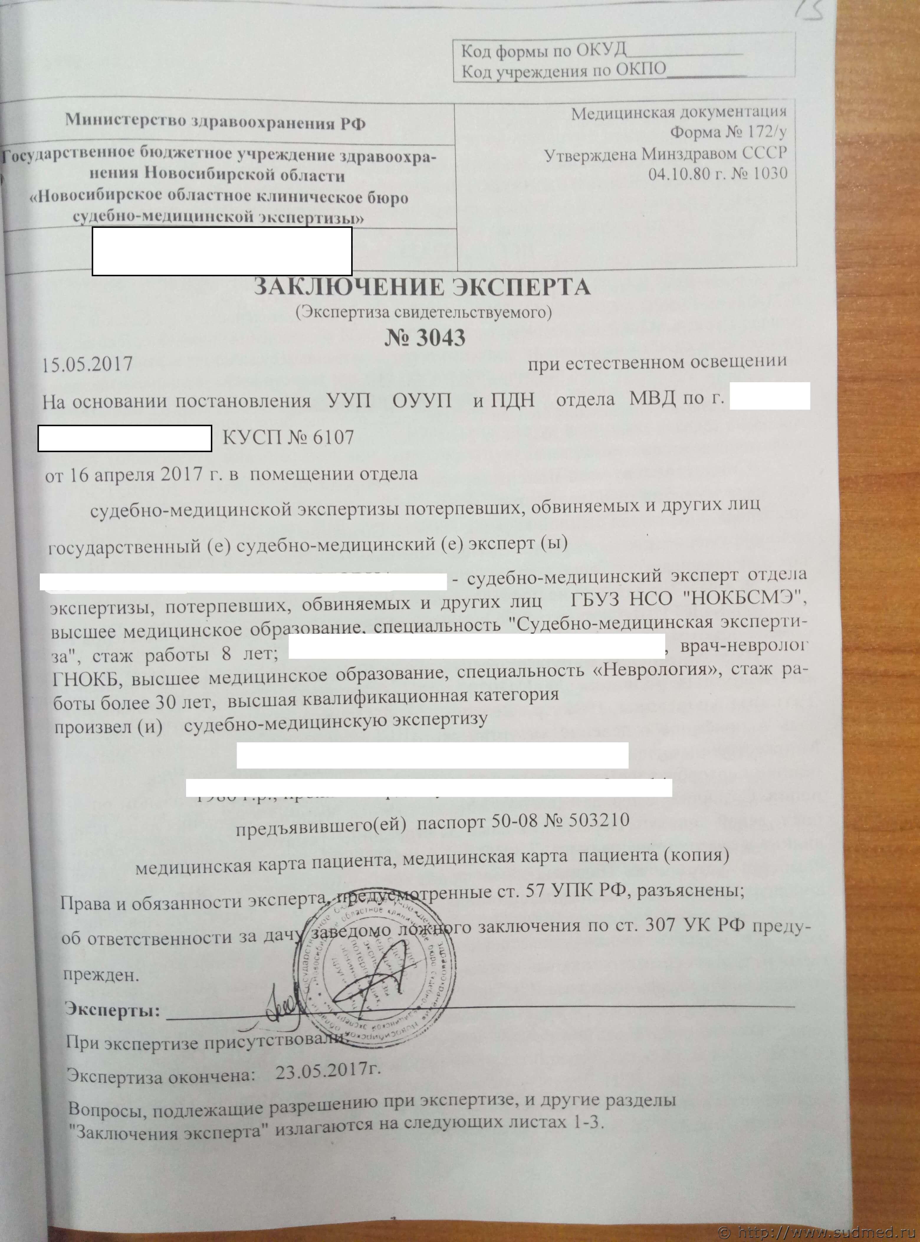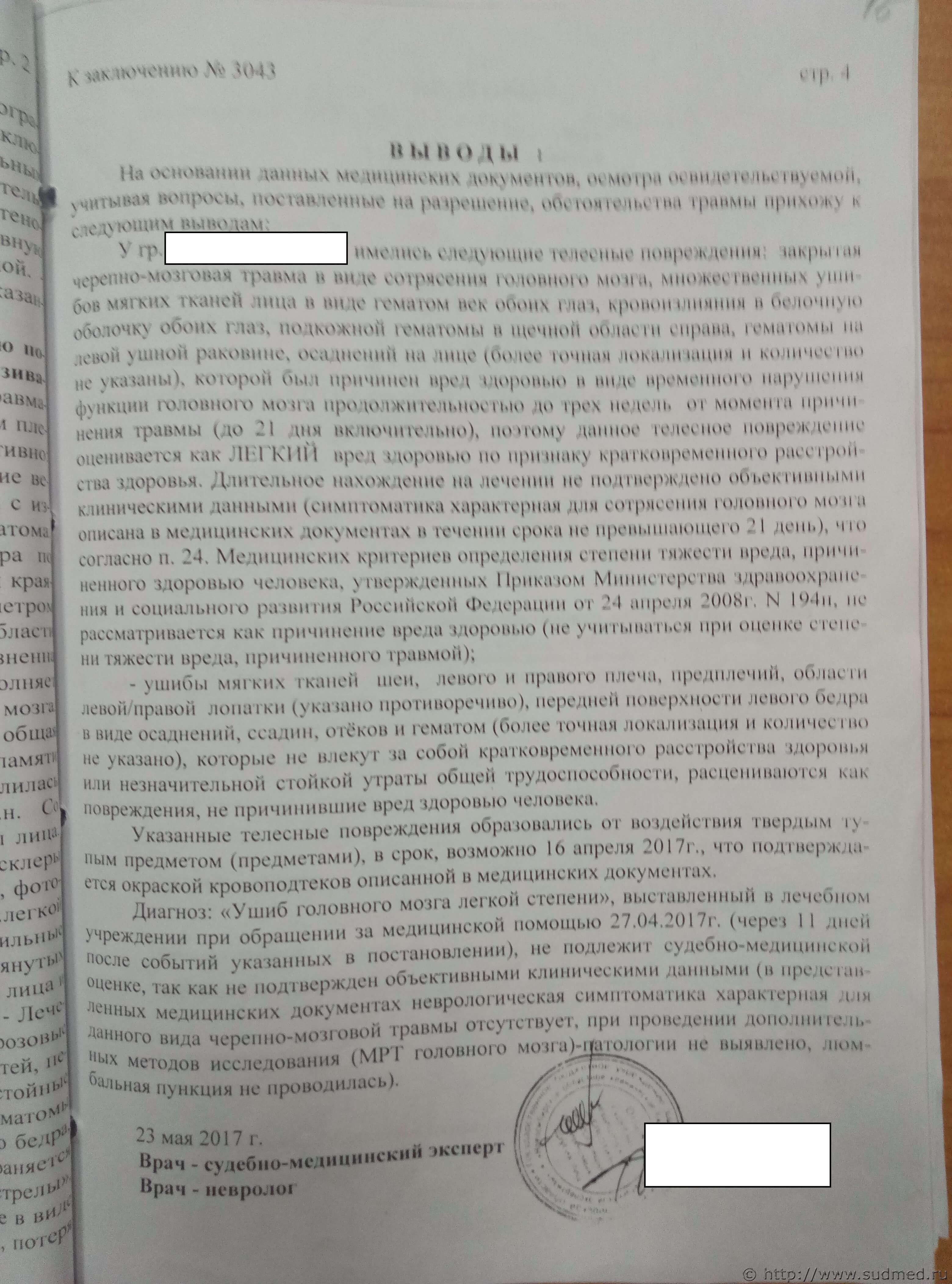 1. на момент осмотра в травмпункте человек находился в алкогольном опьянении 2. с момента проишествия и до выздоровления передвигался на автомобиле. 3. второе учереждение частная клиника, с весьма сомнительной репутацией, предоставило в органы судмед экспертизы копию карточки заверенную администратором Ув, 'kuzivanov. На момент первого осмотра неврологом 17.04. у пациента никаких данных за наличие черепно-мозговой травмы (в т.ч. сотрясения головного мозга) в медицинской документации не отражено. Однако при осмотре 19.04. уже в другой клинике подробно расписана неврологическая симптоматика, характерная для сотрясения головного мозга. Эксперты работали с представленной документацией, где "красиво" расписан диагноз сотрясения, кроме того имеются повреждения на голове, лице (т.е. какое-то травматическое воздействие в область головы имело место). В этом и заключается все коварство диагноза сотрясения головного мозга, если красиво расписано врачами-клиницистами в мед.документации, исключить наличие СГМ бывает достаточно сложно, т.к. этот диагноз в основном ставится только на основании осмотра невролога и наличия неврологических симптомов. Смущает только появление симптомов СГМ через двое суток, после травмы. Обычно симптоматика СГМ наиболее развита в первые сутки после травмы и протекает без "светлого промежутка", более характерного для внутричерепных кровоизлияний, данных за которых в представленной мед.документации не имеется. |