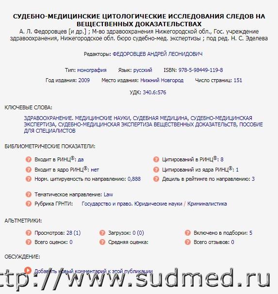 Добрый день, уважаемые коллеги! Для работы очень нужна монография "СУДЕБНО-МЕДИЦИНСКИЕ ЦИТОЛОГИЧЕСКИЕ ИССЛЕДОВАНИЯ СЛЕДОВ НА ВЕЩЕСТВЕННЫХ ДОКАЗАТЕЛЬСТВАХ" А. Л. Федоровцева и коллег. Тираж небольшой, в печатном формате найти не удалось. Если у кого есть pdf копия или ссылка на скачивание буду благодарен. Подробная информация по монографии в прикрепленном файле.