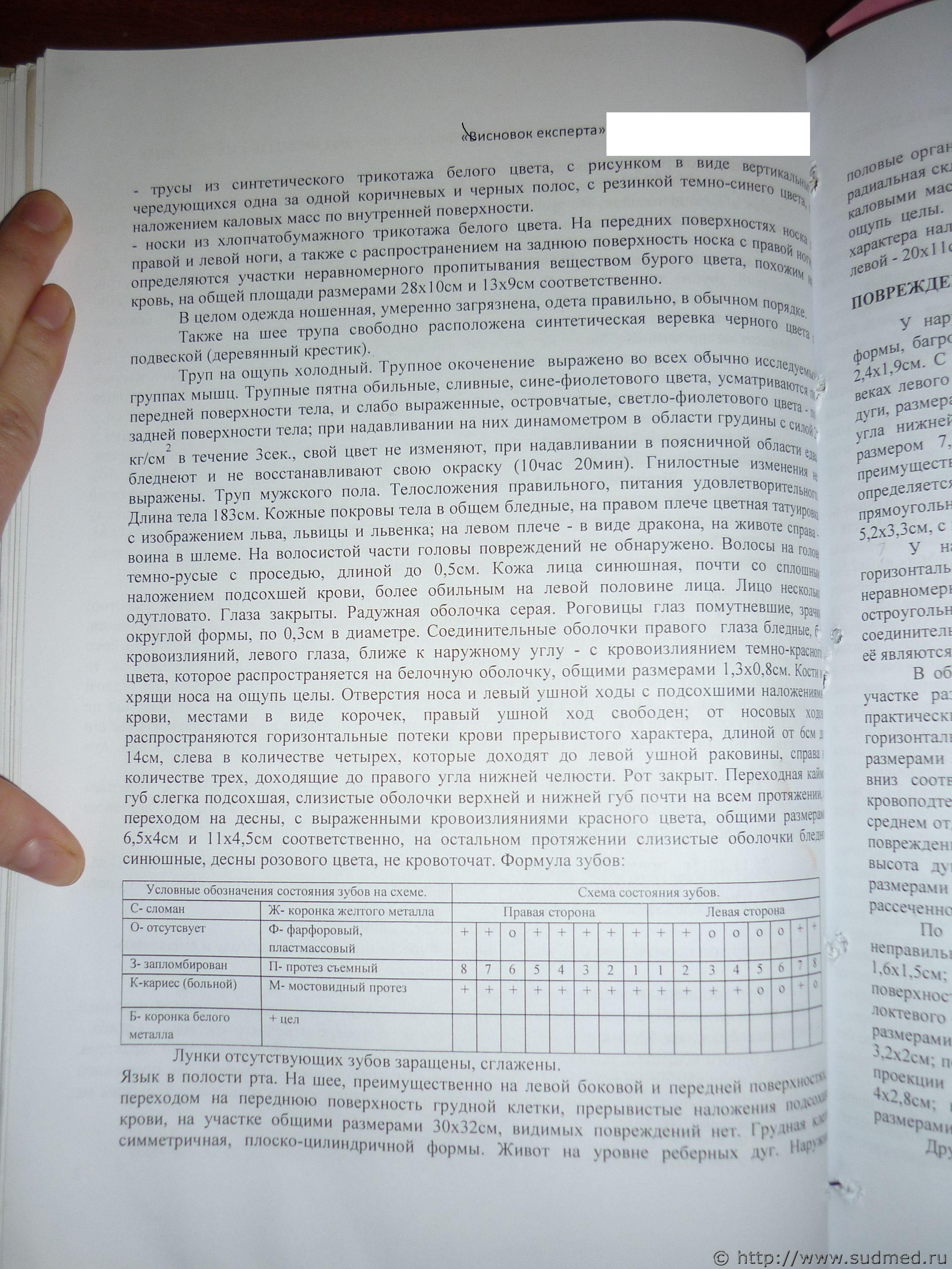 1. При проведении экспертиз (3 шт.) эксперт каждый раз указывает разное время смерти.почему?. Есть ли для таких выводов объективные причины? ----- 2. У убитого много телесных повреждений. Есть версия, что обвиняемый и потерпевший совместно выпивали, обвиняемый действительно вступил в конфликт и нанес удар, после чего ушел.(потерпевший на тот момент был вполне живой). После этого через некоторое время к потерпевшему пришли еще собутыльники, о чем свид-т большое количество разных окурков. посуды, отпечатков, и.т.д. возможно, с ними также был конфликт, который перерос в драку, во время которой потерпевший получил дополнительные телесные. Судя по телесным, возможно были пытки с целью получить деньги. (это предположение) Есть ли объективные данные, из описанных в экспертизах , позволяющие ответить на вопрос о хронологии образования телесных повреждений? Возможно ли на основании данных, описанных в экспертизах , сделать новые выводы (или опровергнуть уже сделанные выводы) в пользу версии, получения телесных повреждений с промежутком во времени несколько часов? Эксперт изучает силу удара, необходимую для причинения повреждения. Возможно ли экспертным путем проверить максимальную силу удара, которую может нанести обвиняемый (он не заморыш, но значительно меньше и моложе потерпевшего ) Возможно ли установить экспертным путем, исходя из имеющихся данных, какого роста был нападающий? Спасибо Эскизы прикрепленных изображений |