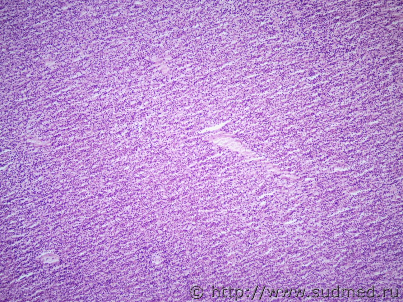 Для эпендимом характерны периваскулярные псевдорозетки и истинные эпендимальные розетки,чего нет на представленных фото. На одном из фото видны петрификаты.Принято считать,что они являются одним из признаков олигодендроглиомы. Совершенно верно розеток нет, я тоже склоняюсь к олигодендроглиоме. Спасибо за ответ. |
