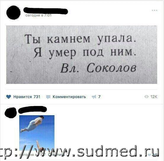 - Давно избыточный вес? - После вторых родов. - Когда были вторые роды? - Через четыре года после первых. - КОГДА БЫЛИ ПЕРВЫЕ? - Через год после свадьбы. - КОГДА ТЫ ВЫШЛА ЗАМУЖ, (СССУКА)? - На втором курсе. - В КАКОМ ГОДУ ЭТО БЫЛО? - ЧЕРЕЗ ГОД ПОСЛЕ ОКОНЧАНИЯ ШКОЛЫ. - ЕСЛИ ТЫ НЕ НАЗОВЁШЬ ГОД, Я ТЕБЯ УБЬЮ!! Врач: — Как ваше самочувствие? Пациент: — Великолепно! Что это вы мне дали? — Мы дали вам поспать. - В вашей допинг пробе нашли 0 промилле мельдония. Вы дисквалифицированы - Но ведь 0 промилле. - Но ведь мельдоний. - Миленький, иди ко мне, я соскучилась. - Подожди, я только Apple Watch сниму. - Зачем, мой пупсик, они же такие классные. - У меня жена - врач. Она по кардиограмме сразу поймёт, что ни в каком министерстве на совещании я не был. Господи! Пошли мне феназепам, вытерпеть то, что я изменить не могу. Пошли мне пирацетам, чтобы я понял, как изменить то, что могу. Пошли мне танакан, чтобы я помнил, когда принимать феназепам, а когда пирацетам.  |