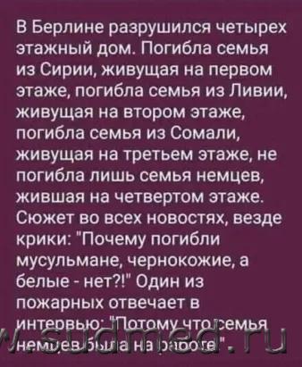 _- Алексей, не возвращайтесь в Россию. Что вам там делать? Там Путин, там мордер, вернётесь, вас там точно укокошат._ Навальный спрашивает: - А у вас - безопасно? Немцы отвечают: - Конечно! Под Берлином, есть шикарный бункер. Спец охрана. Кстати, там уже 2 года Скрипаль тусуется. Всё, вам компания. У него номер 1, у вас будет номер 2. Навальный отвечает: - Ну, ладно, уговорили. Еду в бункер. Ночь. Бункер. Номер 2. Навальный просыпается. И тихонько идёт в номер 1. Наклоняется к спящему Скрипалю и тихо на ухо говорит: - Ну, что сука, думал не достанем? |