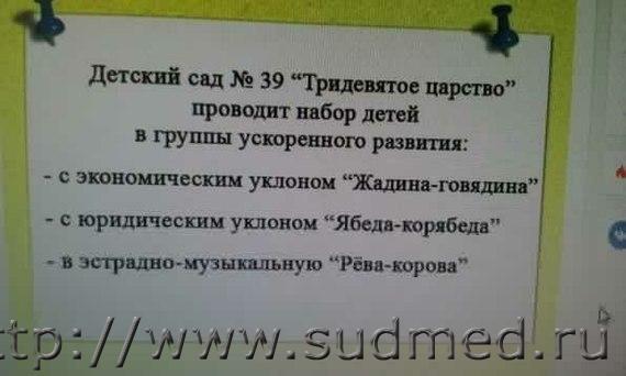 Дорогая, ты прекрасна как сказка! А я ее счастливый конец! За столом двое режут хлеб. Один - пекарь, другой - токарь по металлу. У обоих ножи погнулись. Пекарь: - Вот ножи делают, и хлеба не отрежешь! Токарь: - Вот хлеб пекут - нож не берет! В цирке: - А сейчас!.. Номер для настоящих мужчин!!! Записывайте: 8-067-112-98-54. Настя. Великий и Могучий Русский язык. Помимо слова с шестью согласными подряд (подвзбзнуть), есть еще слово с семью буквами "О" - Обороноспособность. - Вы слышите молчание? Это молчит пиранья Баскервилей. Можно тебя чмокнуть? - Валяй! - Чмо! - Какая разница между гениальностью и тупостью? - Гениальность имеет границы. Директор вслух читает резюме молодого парня, который пришел устраиваться к нему на работу: - "Молод, креативен, талантлив, полон энергии и желания развиваться в выбранной профессии"... (смотрит на него)... Как же я Вам завидую! Да, тяжело работать под руководством человека, которого сама бы на работу никогда не взяла. Они заставили меня заполнить анкету с указанием причины моего поступка. Затем попросили пояснить, что я намерен делать дальше. Потом весь день уговаривали меня по телефону, просили передумать и оставить все, как было вчера. — А что ты натворила-то? — Просто решила закрыть свой вклад в этом банке… |