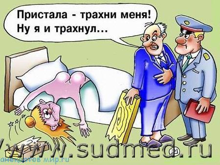 — Вот! Иванов против Петрова! Возьметесь? Адвокат просматривает бумаги, встает, пожимает клиенту руку: — Поздравляю вас, господин Иванов! На вашей стороне закон! Тот возмущенно отдергивает руку: — Я не Иванов! Я как раз Петров! Но адвокат не отпускает его: — Не волнуйтесь, господин Петров! На вашей стороне судебная практика! Студент юрфака сидит на лекции, ковыряет в носу и размышляет: — Вещественные доказательства сокращенно называют вещдоками. Кроме вещественных есть еще и письменные доказательства. Но почему их никогда сокращенно не называют? Надо спросить профессора… — В глаза мне смотреть, я сказал, в глаза, сволочь!!! — Послушайте, господин следователь, вы все-таки не у себя в кабинете, а на приеме у проктолога… Следователь: — У вас с мамой разные фамилии — разные отцы? — Ну-у… Да. Зима. К припаркованной машине подходит мент, вглядывается сквозь запотевшие окна. Видит какие-то ритмические мелькания и слышит пыхтение, вздохи. Стучит в окно. Оно приоткрывается, оттуда выглядывает мужик. Мент: — Гражданин, вы чем тут занимаетесь? — Ну, командир, ну это… понятно чем, любовью занимаюсь. — В общественном месте… совсем обнаглели… выписываю штраф, сотню. Тут в окно высовывается женская голова: — За что штраф-то… есть у нас свобода или нету? Мы ж ничего не нарушали… — А, так вас двое! Двести тогда. |