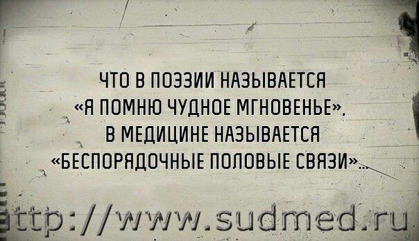 Женщины, которые ведут беспорядочную половую жизнь, выгоднее для эволюции, нежели недотроги, утверждают ученые. Из новостей ....Замучили беспорядочные и неконтролируемые половые связи?! Попробуйте новые стальные прокладки "Allways-Antispam"! "Да не связывайся ты с кем попало" Заболел живот, привезли на скорой в больницу, отправили на обследование к пожилому гинекологу. Г:Половую жизнь ведете? Я:Нет. Смотрит на меня с подозрением. Г:Уверена? Я:Да. Г:Точно уверена? Я:Да! Г:Так и запишем:"Отрицает". xxx: Если про мою половую жизнь когда-нибудь снимут фильм, он будет называться "Наедине с вечностью" aka "CKA3KA" 1. Замужняя-обыкновенная. Имеет мужа, один-два-три ребенка, работу, кухню. стирку. Живет по заведеному распорядку подъем-завтрак-дети-в-школу-муж-на-работу-морду-мазнуть-и-кругом-бегом. Для культпоходов и совместного времяпровождения не пригодна. Злобно-лениво идет на половой контакт ради мести мужу за невыжатое во вторник белье. Оргазма никогда не достигает, потому что в середине акта вскакивает с криком "у меня картошка не чищена" и убегает, громыхая сумками с консервами. 2. Полузамужняя. Муж используется только как машинка для доставки денег. На половой контакт идет легко и развязно. Для культмассовых мероприятий непригодна, потому что постоянно знакомит партнера с бывшими мужьями, их женами и любовницами. Оргазма никогда не достигает, потому что в самый ответственный момент вспоминает, что должна ехать к другому любовнику. Убегает как вихрь, забыв надеть нижнее белье. 3. Замужняя-замужняя. Не пригодна ни для чего. Массовых мероприятий избегает, чтоб не просили помочь в уборке. В кино ходит в надежде выспаться. Одевается раз и навсегда. Не раздевается никогда. Интимными отношениями считает обмен мнениями в очереди за детским питанием. 4. Матрона. На всех смотрит свысока. Гордо рассекает толпу массивным бюстом, волоча на поводке мужа, обвешенного детьми, кошками и собаками. На встречи с любовником приводит детей и мужа, оставляя их поиграть в гостинной, пока она "поговорит о деле" в спальне. Для интимных отношений малопригодна из-за привычки регулировать процесс властными приказами. Оргазма достигает, когда слышит осторожный стук в дверь и тихий голос мужа "Дорогая, мы опаздываем". 5. Разведенка-обыкновенная. Однокомнатная квартира, маленький ребенок, некрепкий чай с печеньем, диван-кровать, ситцевая ночнушка. На публику не выходит, не с кем оставить ребенка. Половую жизнь ведет редко, в полной звукоизоляции, чтоб не проснулся ребенок, спящий в той же комнате. Оргазма не достигает, так как поминутно вскакивает поправить на ребенке одеяло, закрыть-открыть форточку, снять-поставить чайник, завести будильник на утро. 6. Разведенка-змея. Детей нет. Шикарная квартира-тачка-ювелирка, отсуженные у бывшего мужа. Про сволочей мужиков знает все. Всеми пользуется. У всех требует денег, ресторанов, развлечений. В культпоходы ходит исключительно на шикарные презентации и посольские приемы. Мужиков оценивает по бумажнику. Для интимных отношений малопригодна из-за размышлений о том, что бы дорогого и хорошего вытрясти из любовника. Оргазма достигает только вытряхнув из любовника все. 7. Разведенка-фиалка. Верит в существование верной и чистой романтической любви в 43-й раз. Носит шляпки, шарфики, серебряные кольца. Для выходов на публику малопригодна, из-за вечной востор