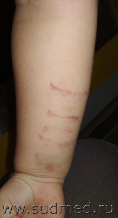 Пишу в продолжении предыдущей темы Есть такое заключение экспертизы. Документ на украинском языке, поэтому перевожу. Исследуемая часть. За разгибательных поверхностях правого предплечья от основания до уровня средней трети есть ряд 9 полосчатых ссадин, параллельных между собой, при этом 5 ссадин больше выражены, а 4 расположены в промежутках между ними, немного меньше выражены, представлены красными поверхностями, расположены практически на уровне окружающей кожи, размером от 1,2*0,3 до 4,2*0,3 см Выводы: На основании данных судебно-медицинского осмотра ребенка прихожу к мнению, что у нее имеет место: ссадины на правой руке, которые образовались от действия тупых твердых предметов по механизму трение-скольжение и могли быть получены в срок 1-2 дня до проведения осмотра. Можно ли на основании этого документа со 100% вероятностью сказать, что это следы не от пальцев? Или эта версия имеет право быть? |