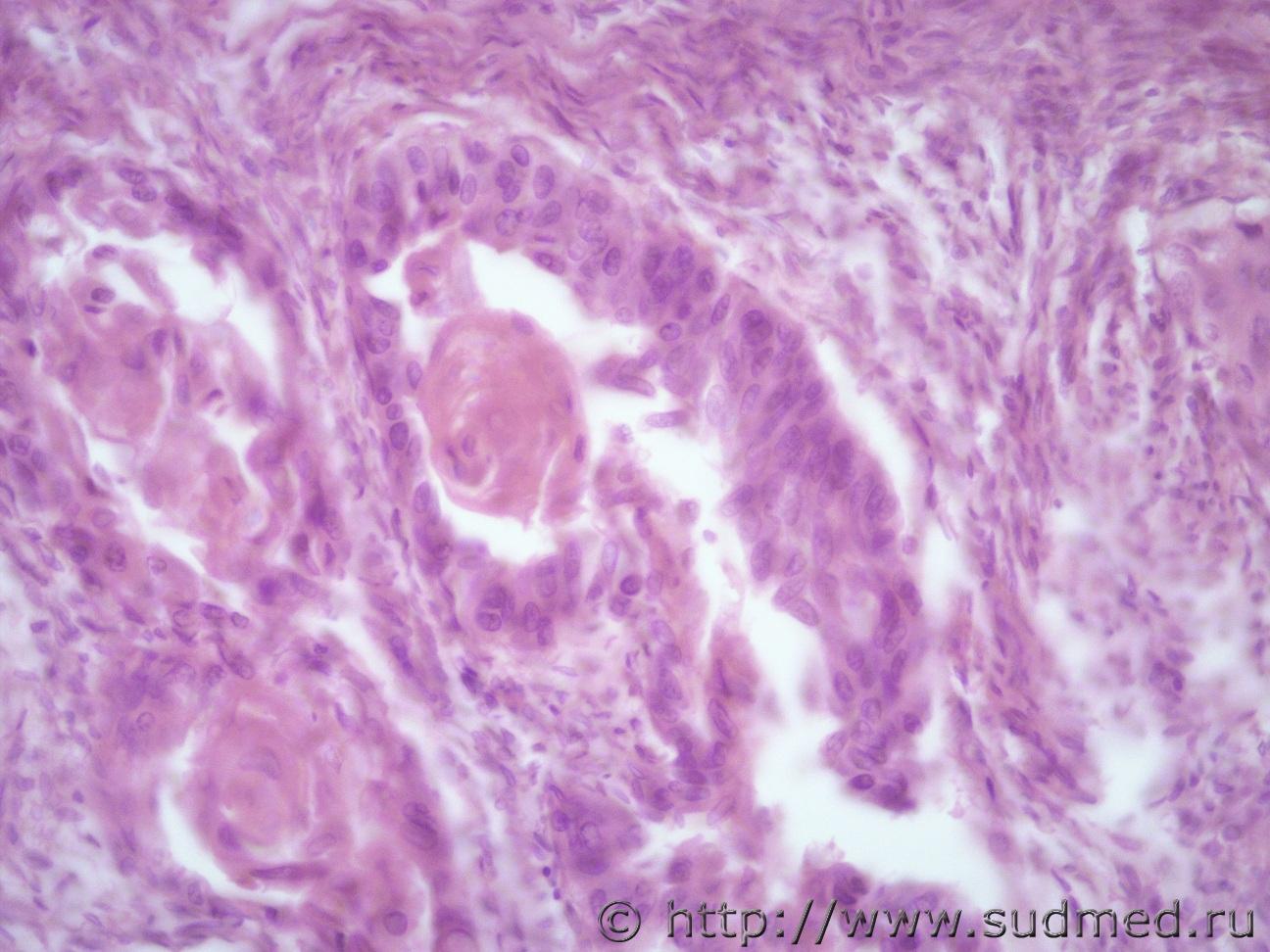 Плоскоклеточный умереннодифференцированный рак,инвазия в железы.