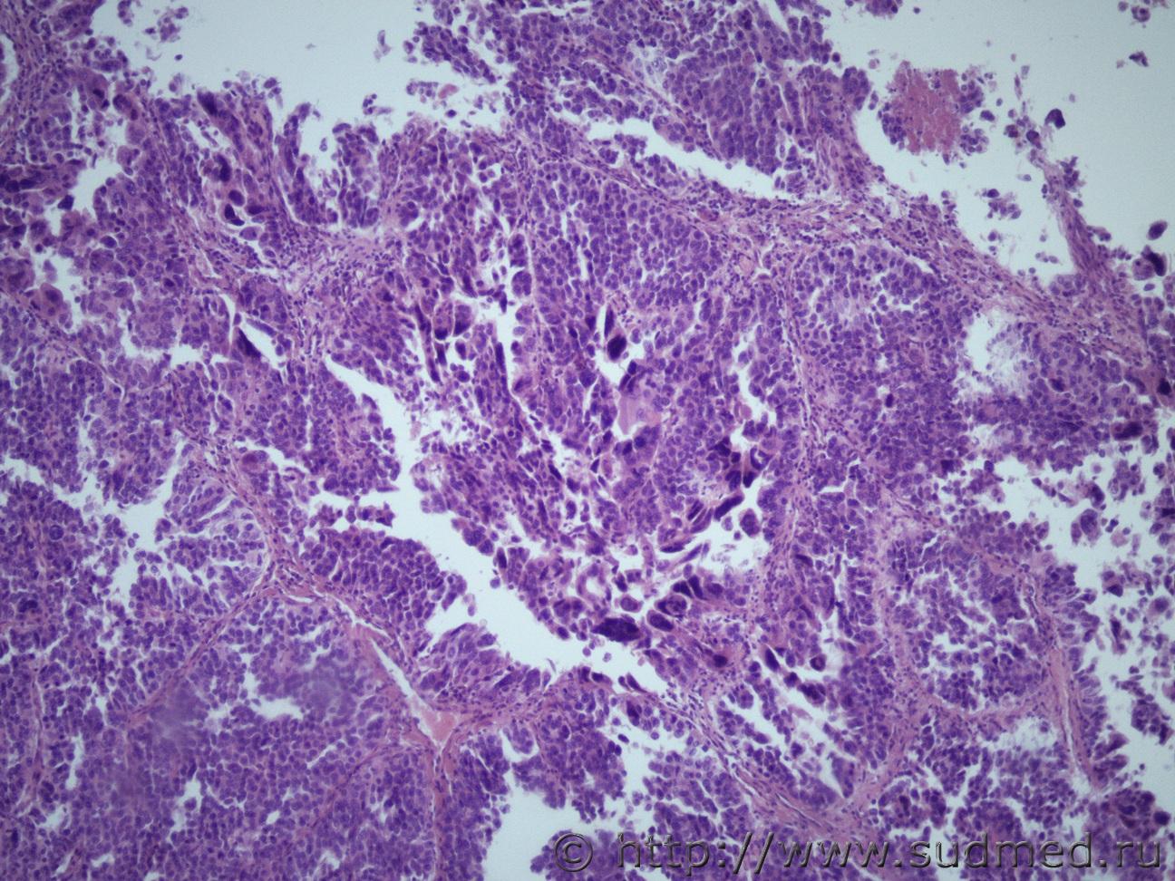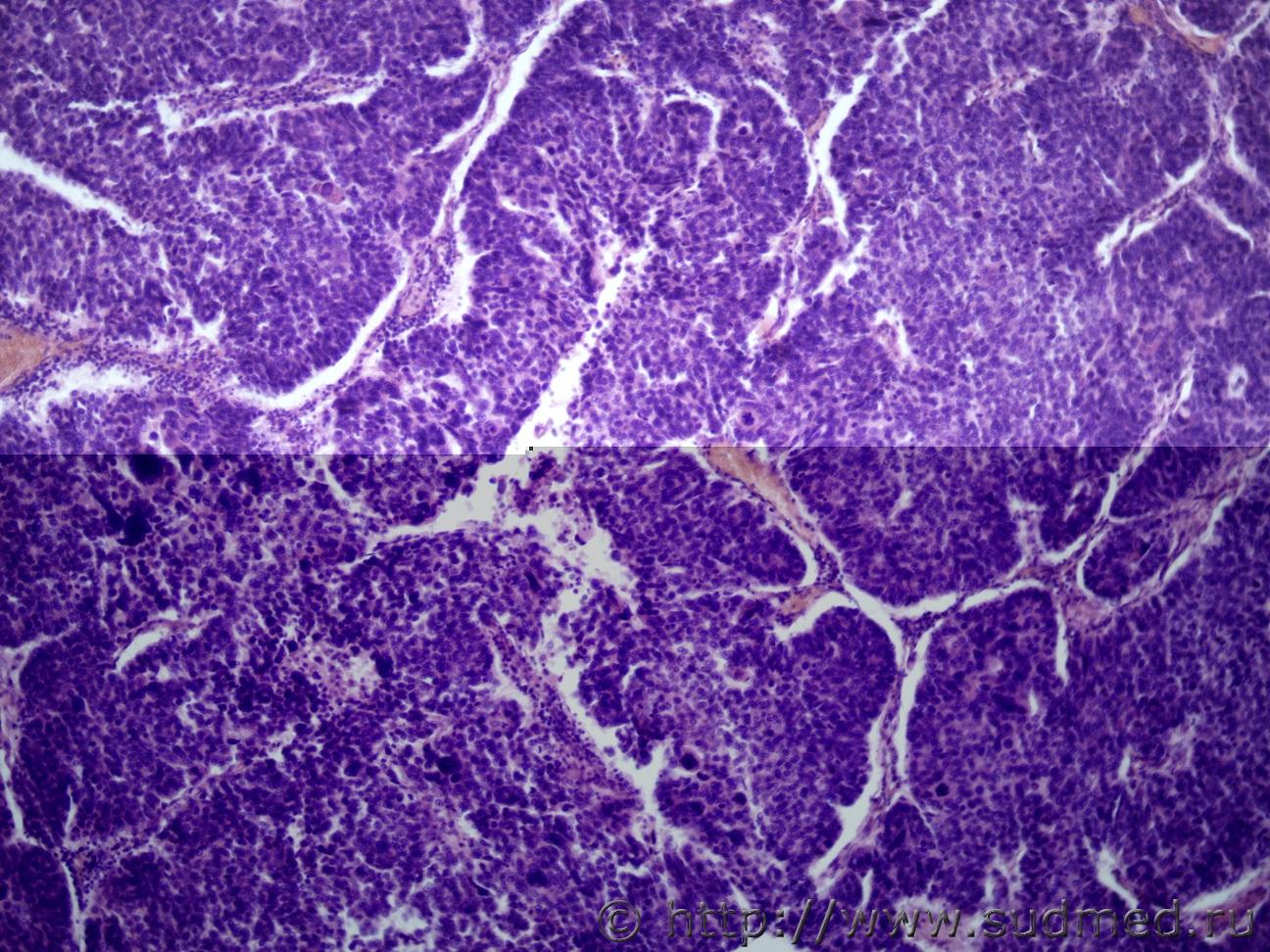 Ув. коллеги. Как и всегда необходима ваша профессиональная помощь. Жен 67 лет. На вскрытии - структура поджелудочной железы нарушена, гнойное распловление тела и хвоста пж, в области головки пж определяется плотноватый узел диаметром 5.5 см, богато васкуляризированный, на разрезе молочно-белого цвета с желтоватым оттенком, по консистенции близок к творожной массе. В области правой доли печени аналогичный узел. Метастатическая карциноидная ( нейроэндокринная)опухоль ( круглоклеточная монморфность с гиперхромными ядрами и некроз) |