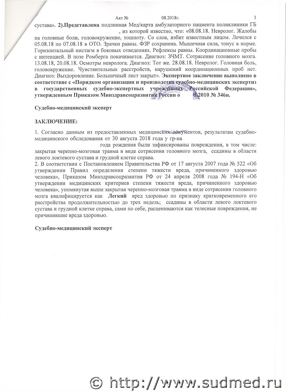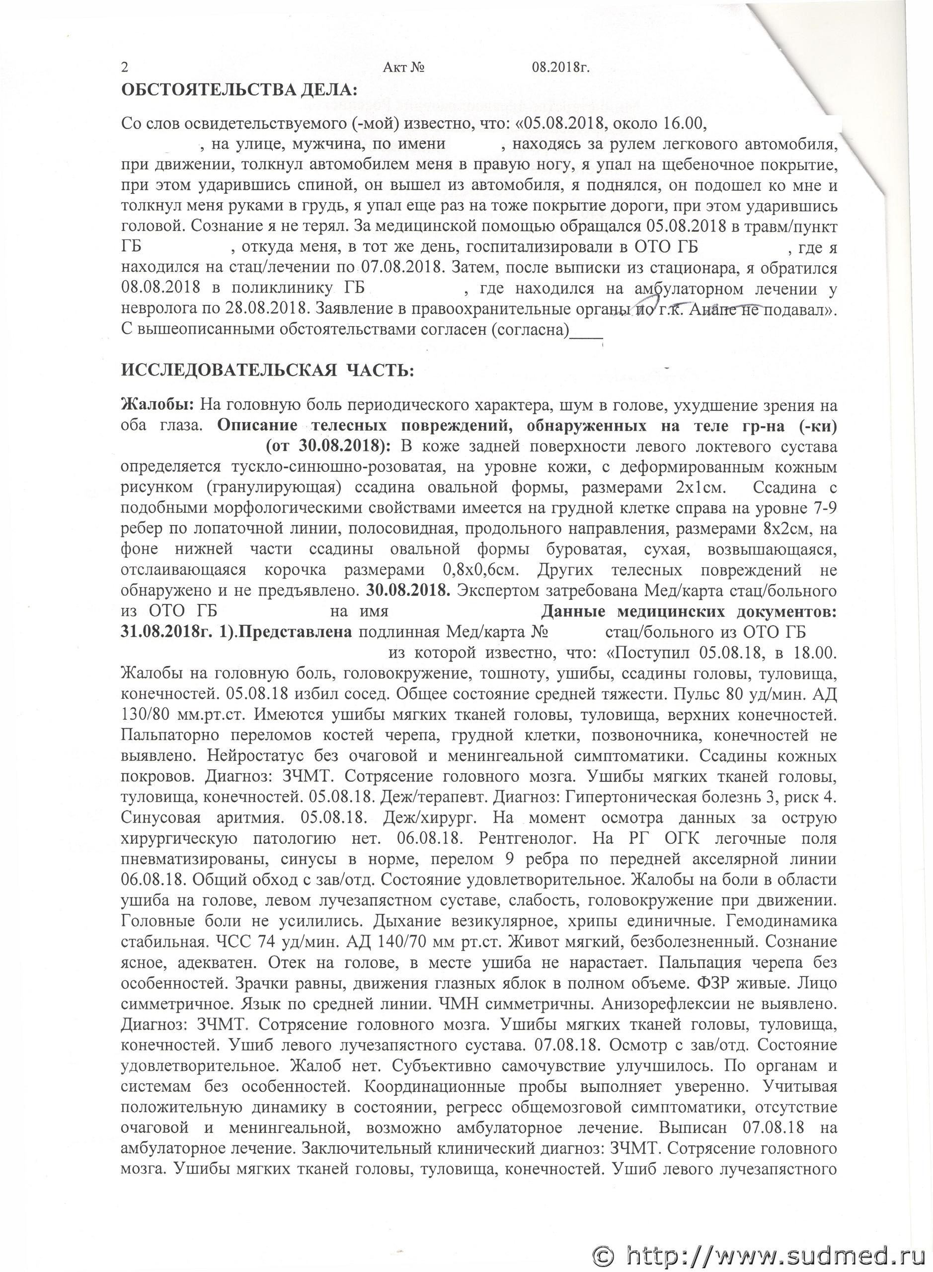 Ссадины в областях правой половины груди и левого локтевого сустава - повреждения, не причинившие вред здоровью (согласно п.9 вышеуказанного документа). Фактическая продолжительность лечения может быть связана с особенностями врачебной тактики при постановке диагноза "ЗЧМТ. СГМ" на фоне хронической патологии (Гипертоническая болезнь 3 стадии) и, сама по себе, не является основанием для экспертной оценки. Следов травмы в области головы нет (кровоподтек, гематома, ссадина, рана, перелом). При осмотрах в стационаре неврологической патологии не отмечалось. Появление неврологической симптоматики через несколько суток после травмы не характерно для СГМ. Горизонтальный нистагм и координаторные нарушения типичные проявления гипертонической болезни, а не строго дифференциально-диагностические признаки СГМ. Есть основания для назначения повторной судебно-медицинской экспертизы с участием в составе экспертной комиссии высококвалифицированных невролога и кардиолога (разумеется, потерпевшему не резонно ходатайствовать о назначении такой экспертизы). Цитата Судя по его мнению инвалидов можно избивать и так как они уже и так инвалиды, то больше чем легкий вред им не причинишь. Абсолютно ошибочное мнение. С точки зрения закона. С точки зрения экспертизы. Результат экспертизы напрямую зависит от самой травмы и от того, как врачи лечебных учреждений сумели выявить симптомы повреждений и зафиксировать их в медицинской документации. В данном случае, судя по отмеченному в больнице, весь срок нахождения там человек был полностью неврологически здоров. Как и все дни наблюдения в поликлинике, кроме 08.08.18г. |