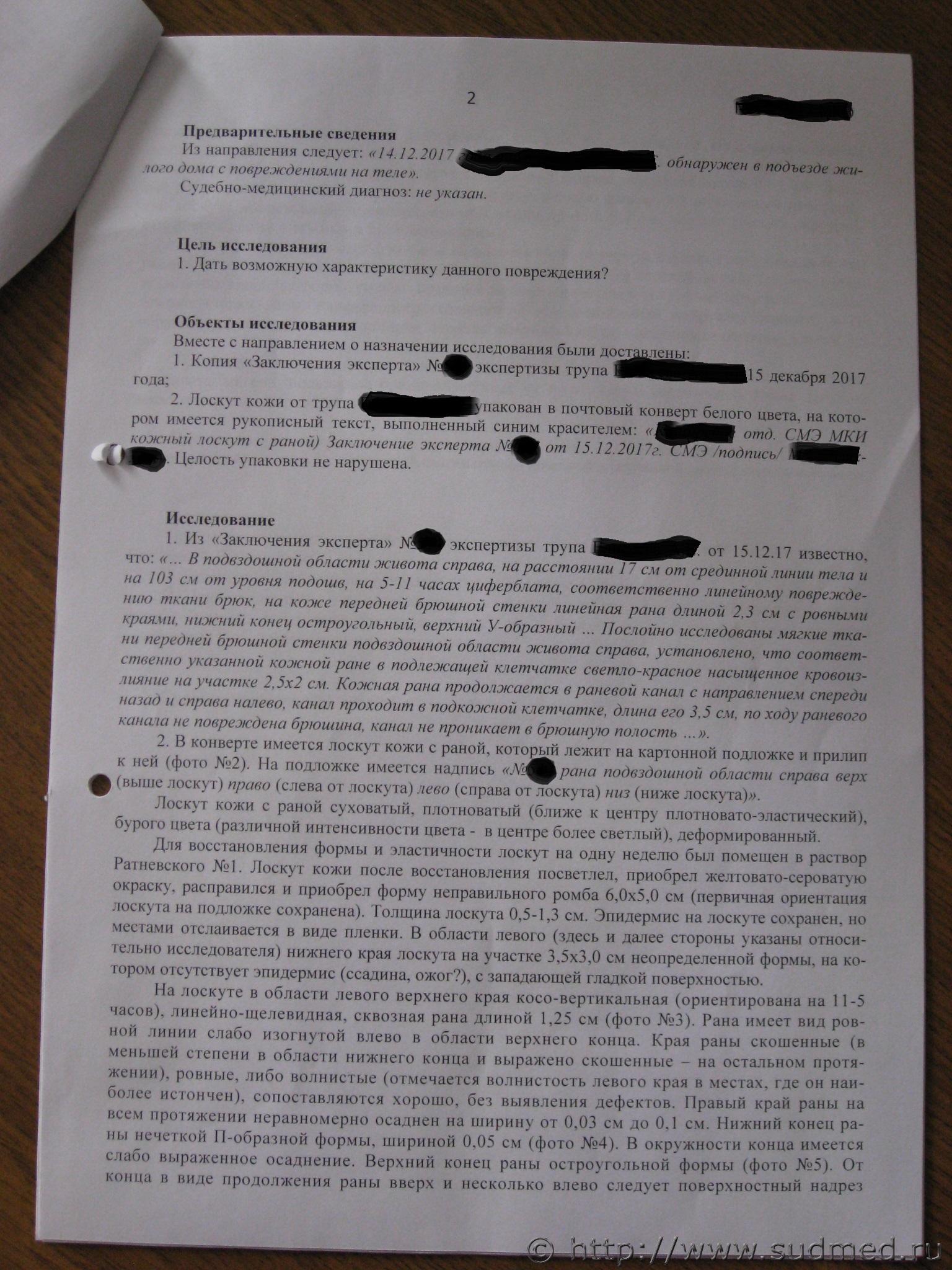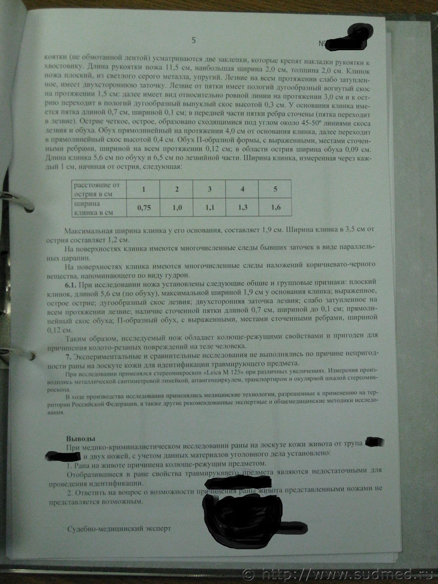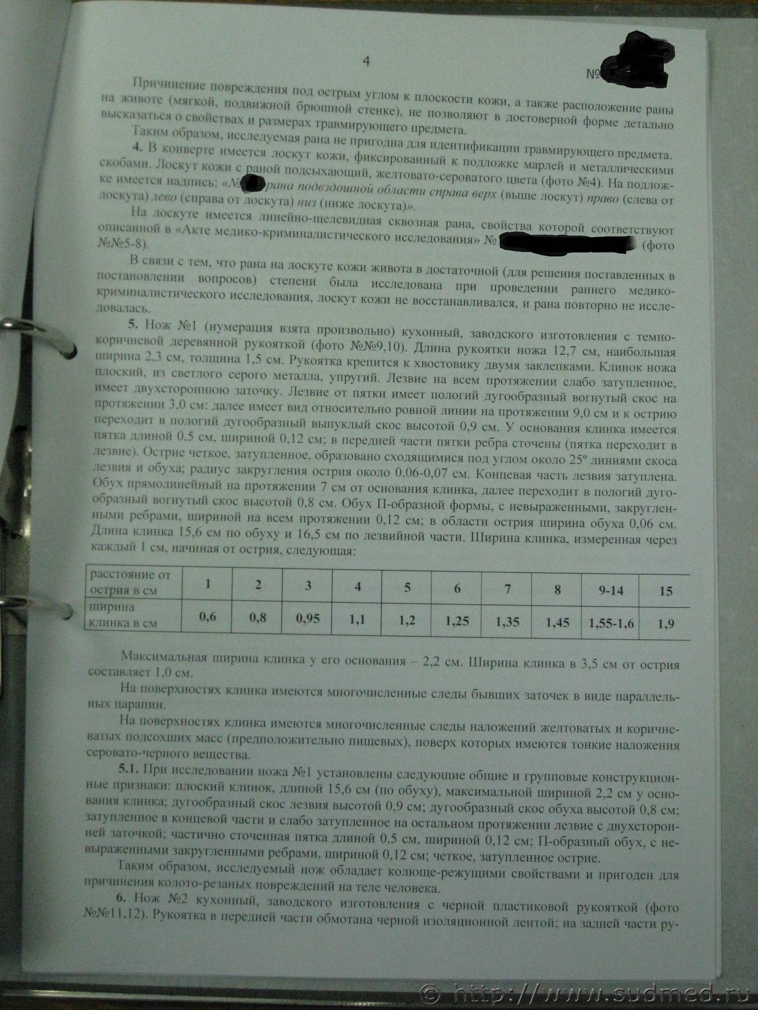 В смэ, эксперт пишет, что максимальная ширина погрузившейся части клинка составляет 2,3 см. Минимальная длина раневого канала составляет 3,5 см. Повреждение на брюках: в косопоречном направлении имеется сквозное повреждение ткани линейной формы длинной 1,8, правый конец остроугольный, левый Т-образный.