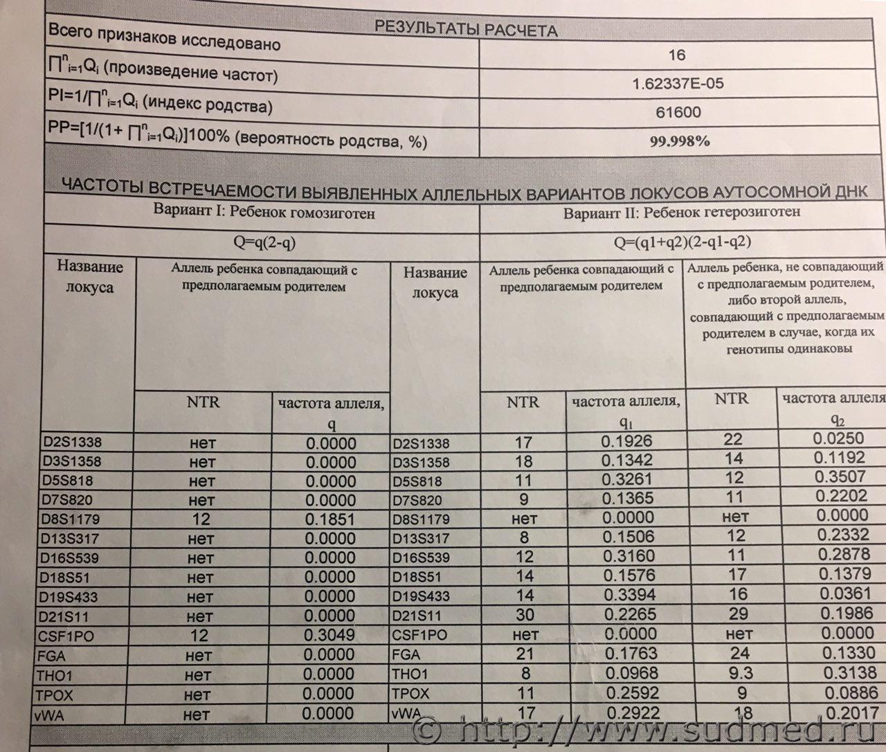 была проведена экспертиза на установление отцовства по суду, и вторая для себя. Результат один и тот же, но есть нюансы. Судебная экспертиза трио (мать/ребенок/предп отец) и вторая предп отец/ребенок. Таблицы расчета вероятности противоречивые, например, по локусу vWA в судебной экспертизе внесен аллель гомозиготного ребенка, а в экспертизе ”для себя” гетерозиготного. Частоты аллелей вроде и совпадают (на примере локуса vWA - 0, 2017) в обеих таблицах, но в экспертизе ”для себя” вносится и второй аллель, как ”совпадающий/не совпадающий в случае, если генотипы их одинаковы”. Но генотипы одинаковы только по 5 локусам (D8S1179, D7S820, D13S317, vWA и FGA). Кроме того, по локусам D7S820(9 и(или)11) D13S317(8 и(или)12) vWA(17 и(или)18) и FGA(21 и(или) 24). Но что значит ”и”? Ребенок наследует от каждого из родителей по одному аллелю, какое здесь может быть ”и”? И почему по локусу D8S1179 нет ”и(или)” если в таблице указано 12.12/12.12)? Я не эксперт, но какие-то странные экспертизы, то ребенок гомозиготный, другой эксперт пишет гетерозиготный. В одной экспертизе аллель отцовского происхождения, во второй материнского. И это непонятное ”и” в экспертизе, по четырем локусам оба аллеля отцовского происхождения. Я не эксперт, вторая экспертиза должна была поставить точку, но появилось только больше сомнений к уже имеющим: ”ты настолько лох, что даже экспертиза показала отцом ребенка, который не твой”. Получилось сумбурно, мой мозг взорван, простите. Первый расчет трио, остальные экспертиза ”для себя” |