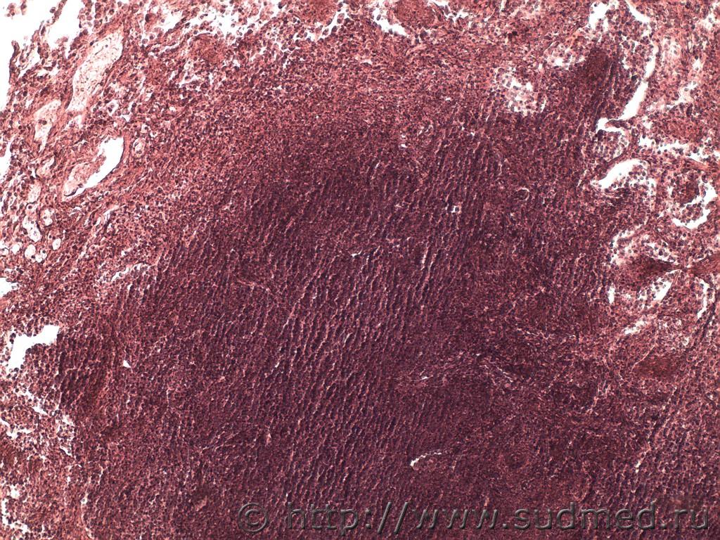 Уважаемы коллеги, нужна помощь. Не могу определиться с заболеванием. На секции женщина 1964 г, ВИЧ- инфицирована. В лёгких, печени, почках, надпочечниках, селезёнке многочисленные просовидные белесоватые округлые и овальные включения. Спленомегалия. В микропрепаратах во всех внутренних органах многочисленные гранулёмы с некрозом и нагноением, скудной эпителиальной и макрофагальной реакцией, отсутствием гигантских многоядерных клеток. Некроз несколько базофильный, похож на казеоз, но окраска по Цилю- Нильсено отрицательная, соответственно туберкулёз, микробактериоз исключаю. Мучают сомнения, может, это такие пиемические очаги у ВИЧ? Встречали ли вы что- то подобное? На представленных фотках- лёгкие, надпочечники, селезёнка. Фото не очень удачные, прошу прощения, камера старая.