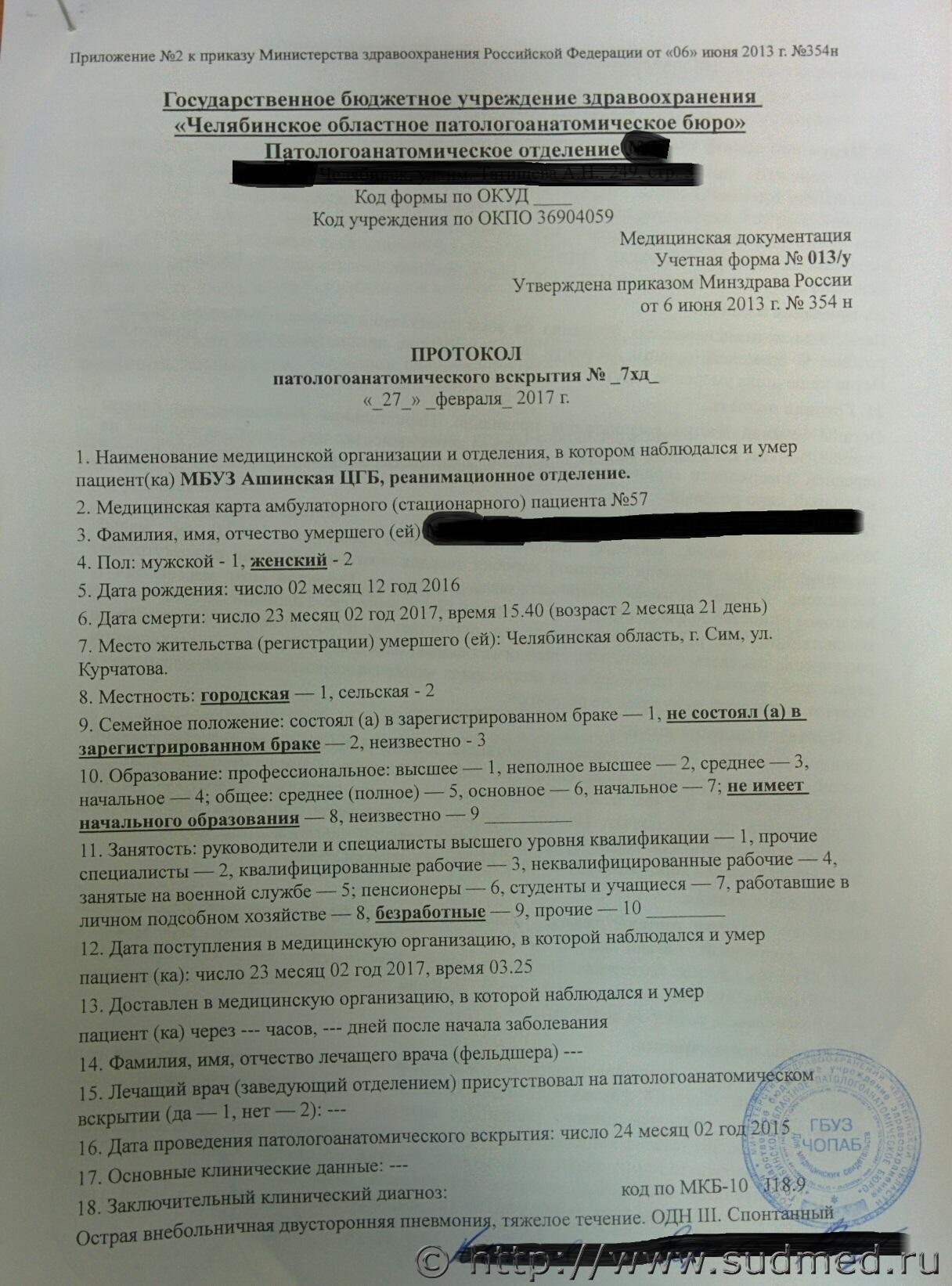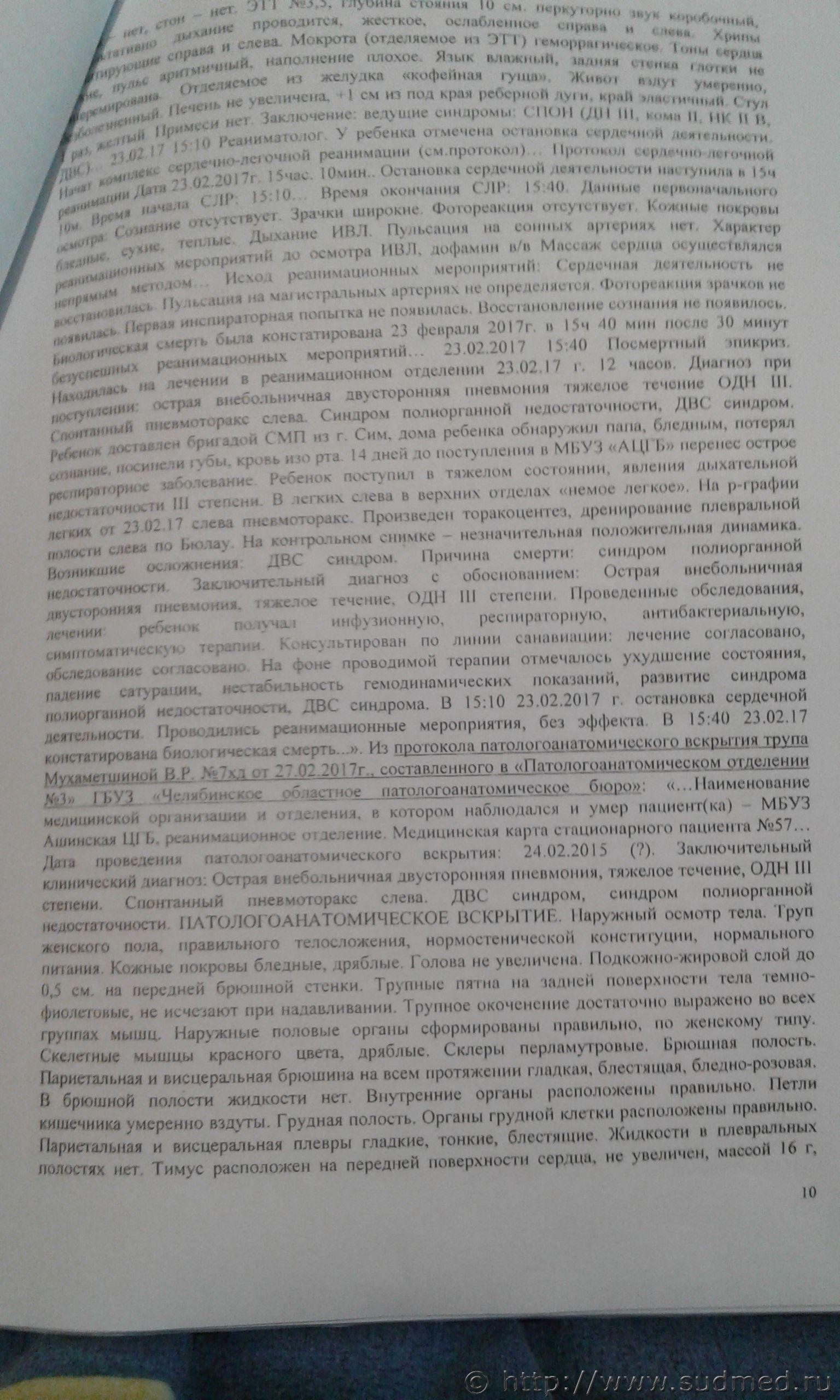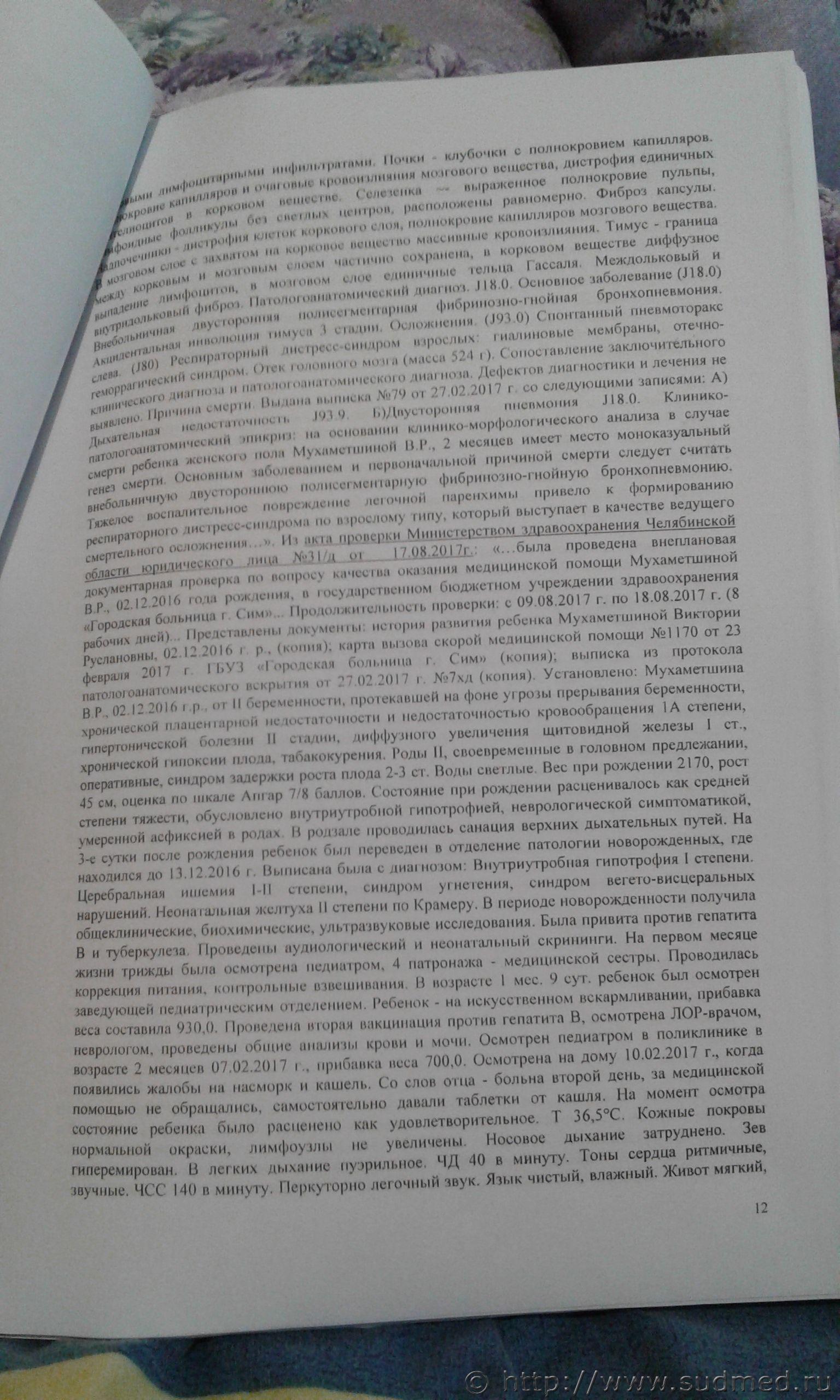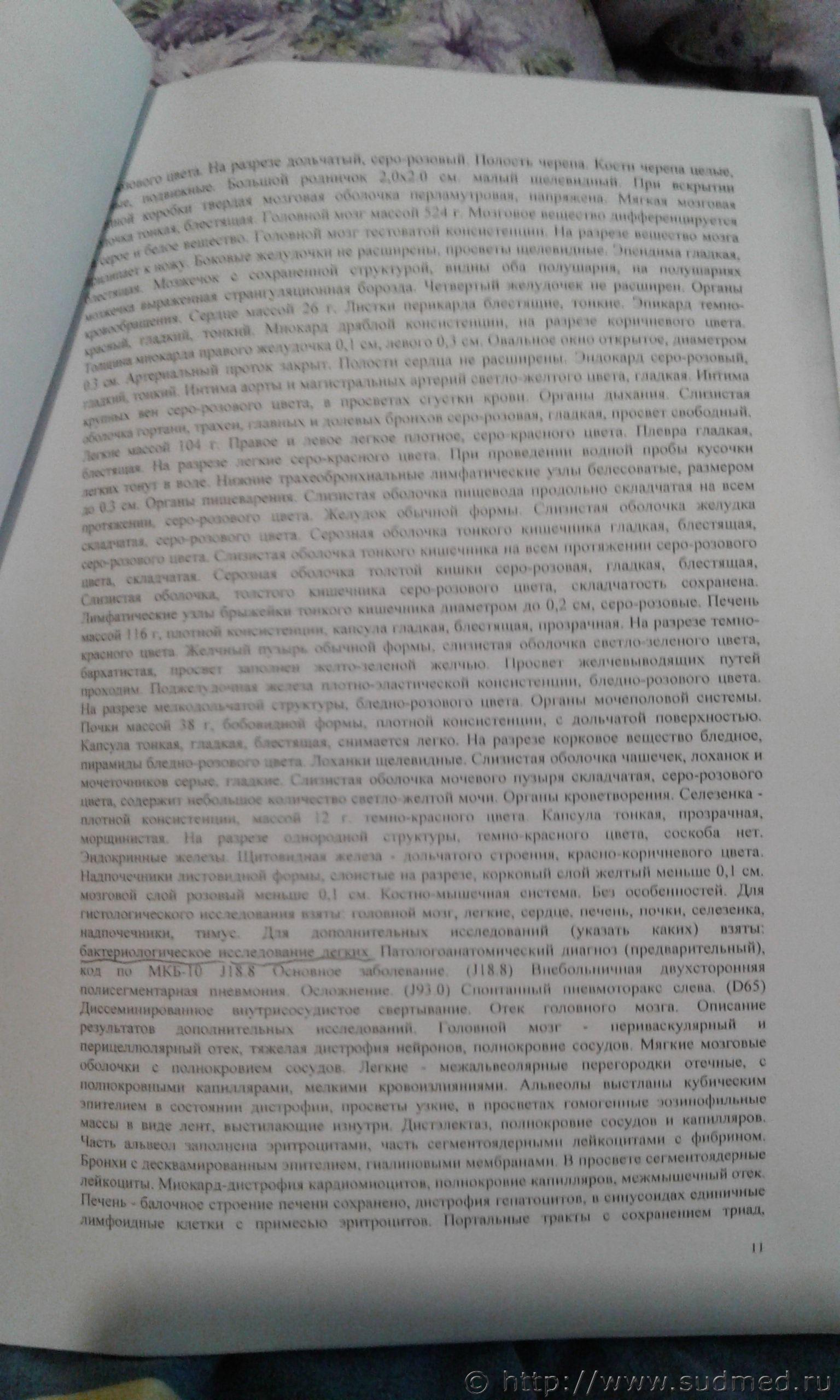 вообщем-то правильно сказали...эти сроки не имеют четких ориентиров-например. если при гистологии увидели клетку А- то это не менее 3-х и не более 5 дней..разнообразие человеческих организмов в их ответе на инфекцию практически никогда подобных ориентиров не дает...В вашем случае, скорей всего на ослабленный после вирусной инфекции организм попала какая-то вирулентная флора, организм не справился..бывает такое, примите соболезнования, но виноватых в этом искать- дело неблагодарное Всё это понятно и нельзя с вами не согласиться.Но сам собой встаёт вопрос,почему не был сделан баканализ на посев с целью определения природы инфекции?А также повторная комплексная суд.медицинская экспертиза проводится без исследования образцов(стёкла имеются в СК),на основе изучения мед.документации.Нет в деле выделенного гистологического акта или заключения,содержится лишь протокол вскрытия совмещённый с гистологией,хотя лично для меня не понятно кто,когда и где проводил данные исследования,должна же быть какая-то документально оформленная форма такого документа,отделяемая от заключения поталогоанатома? Жаль, что не весь материал. Диагноз патологоанатомический ошибочен. Бронхопневмония не бывает самостоятельным заболеванием. Это осложнение какого-то заболевания, возможно внутриутробного. Раздобудьте начало и конец представленных документов. Как я и писал до этого,ребёнок перенёс острый назофаренгит,окончившийся "полным выздоровлением". |