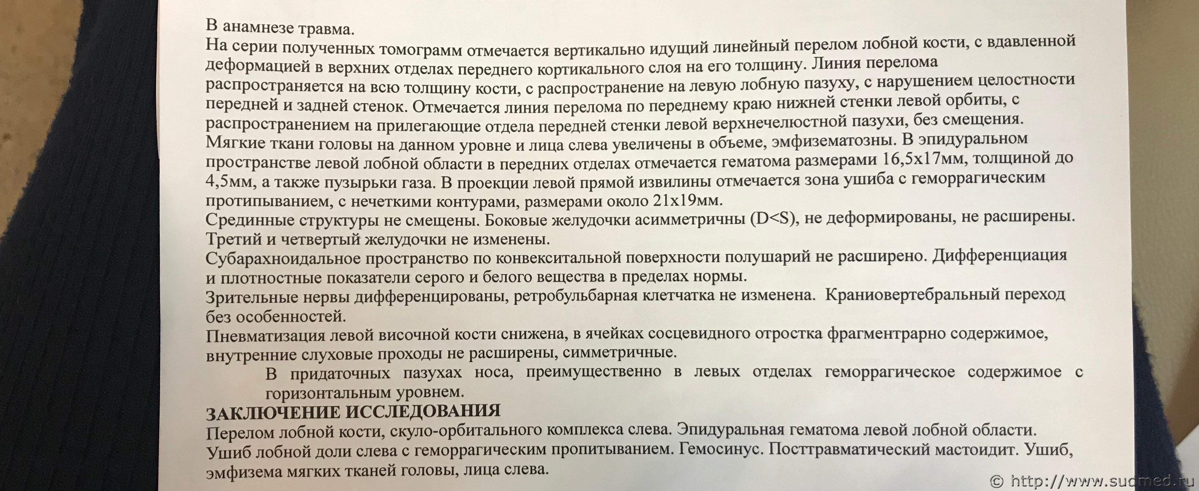 Через 8 часов после повреждения,было сделано КТ головы, на котором отмечается перелом лобной кости,скуло-орбитального комплекса слева.Эпидуральная гематома левой лобной области. Ушиб лобной доли слева с геморрогическим пропитыванием.Гемосинус.Посттравматический мастоидит.Ушиб,эмфизема мягких тканей головы и лица слева. Какова степень тяжести вреда здоровью причинена? и возможно ли получение этих травм от падения с высоты собственного роста с ускорением? |