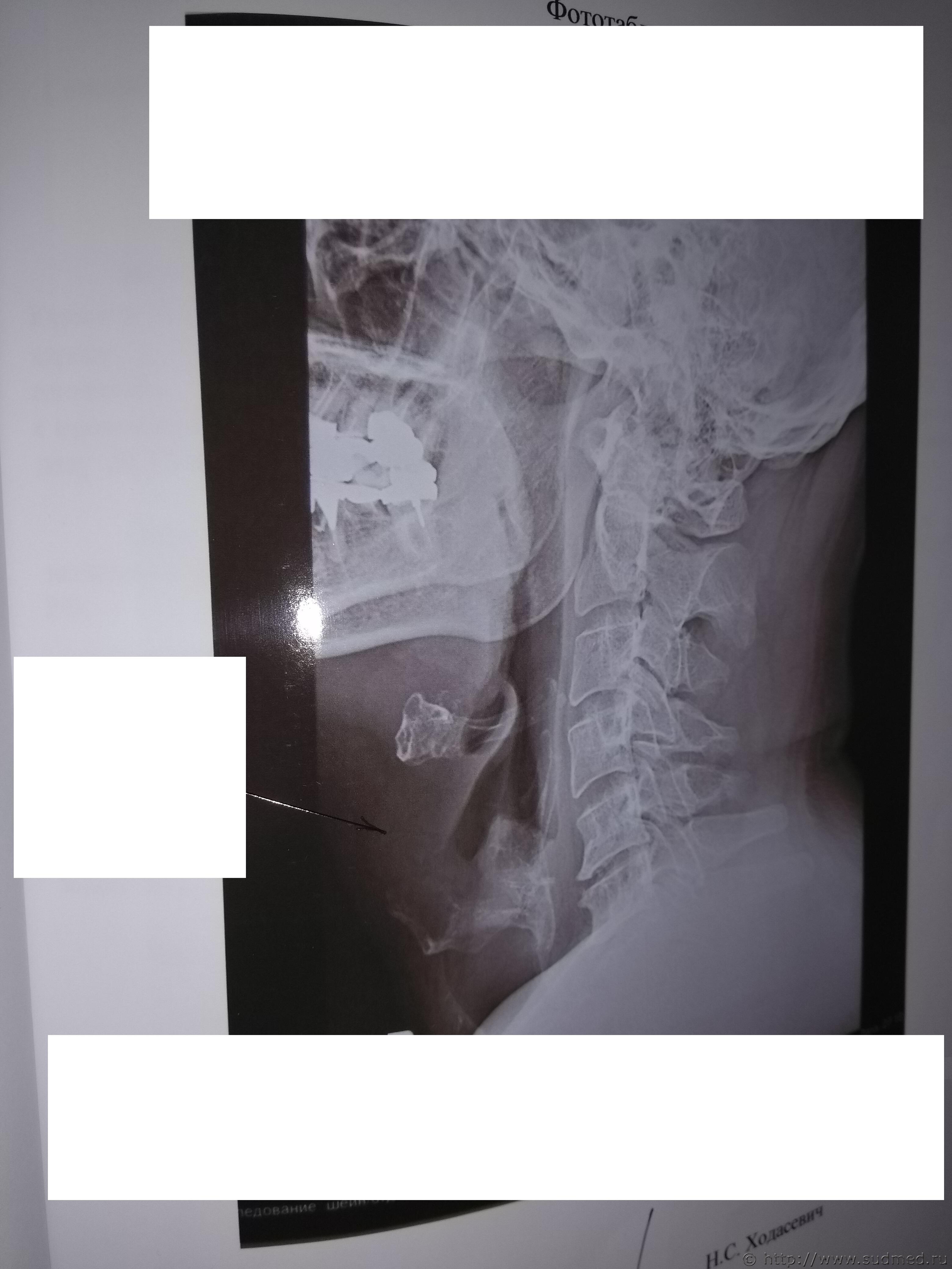 Между тем врач рентгенолог на суде сказал: 1. Снимок сделан для исследования костных структур шеи. Объясняется тем, что в центре снимка находится позвоночник, а не гортань. У рентгеновского аппарата два режима, один для исследования костных структур, второй для исследования мягких тканей. 2. На рентгеновском снимке не видно щитовидного хряща. Т.е. получается как в одном фильме. Ты суслика видишь. Нет. А он здесь есть. Кстати процитирую выдержку из атласа Кишковского: "...На снимке шейных позвонков в боковой про- екции хорошо видны тела шейных позвонков, межпозвоночные диски, межпозвоночные суставы, остистые отростки. Четко определяются соотношения зуба 1 1 шейного позвонка и передней дуги атланта {рис. 218). По снимку могут быть реконструированы передняя и задняя стенки позвоночного ка- нала. Снимок дает возможность оценить форму и структуру тел шейных позвонков, состояние межпозвоночных дисков, выявить дегенеративно-дистрофические их поражения. Снимок информативен при переломах и переломовывихах шейного отдела позвоночника (рис. 219), воспалительных изменениях и аномалиях развития. |