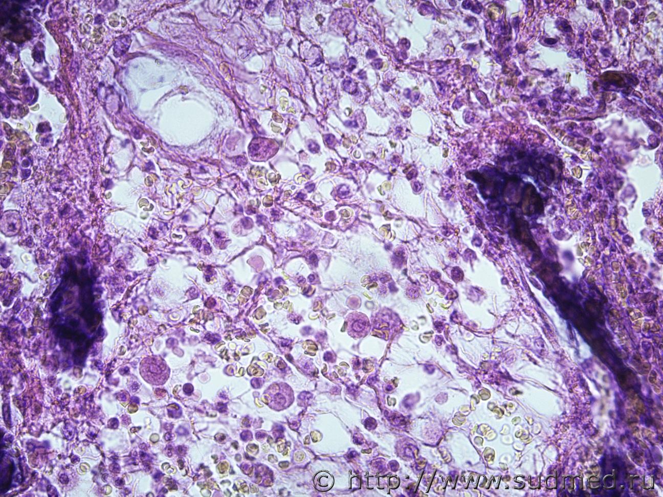 Уважаемый Медик, как всегда в точку попадает. Это грибковая пневмония или пневмония , вызванная грибковой инфекцией рода Nocardia и возможно микст инфекция. Покрасить бы по Гимзе!