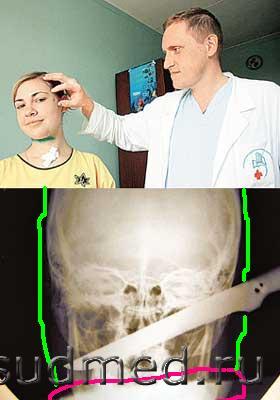 Во-первых, если нож попал слева в висок, прошел через нос и вышел под челюстью справа, то врет либо RTG-снимок, либо автор. Вход ножа на снимке находится не в височной, а в скуловой или околоушножевательной области слева. Острие лезвия на снимке находится над нижней, но под верхней челюстью (а значит в щеке) или за правой ветвью нижней челюсти (не под нижней челюстью). Если придать толщину мягких тканей, которых на снимке не вижу, острие ножа едва-едва появится наружу в правой части головы. Во-вторых, при таком положении ножа в лицевой части головы потерпевшая не могла открыть рот, не то что вымолвить "помоги!" или звать на помощь. В-третьих, на RTG-снимке хорошо видны гайморовы пазухи и чистая носовая полость, совершенно без затенения (накопление крови), я уже не говорю о том, что не видны отломки верхней челюсти, которая должна быть прободнута с обеих сторон по ходу ножа. Поэтому у меня есть вопрос: а что скажут по этому поводу челюстно-лицевые хирурги Андрей Пасельский и Сергей Шевцов из Воронежа, которые потерпевшую оперировали? |