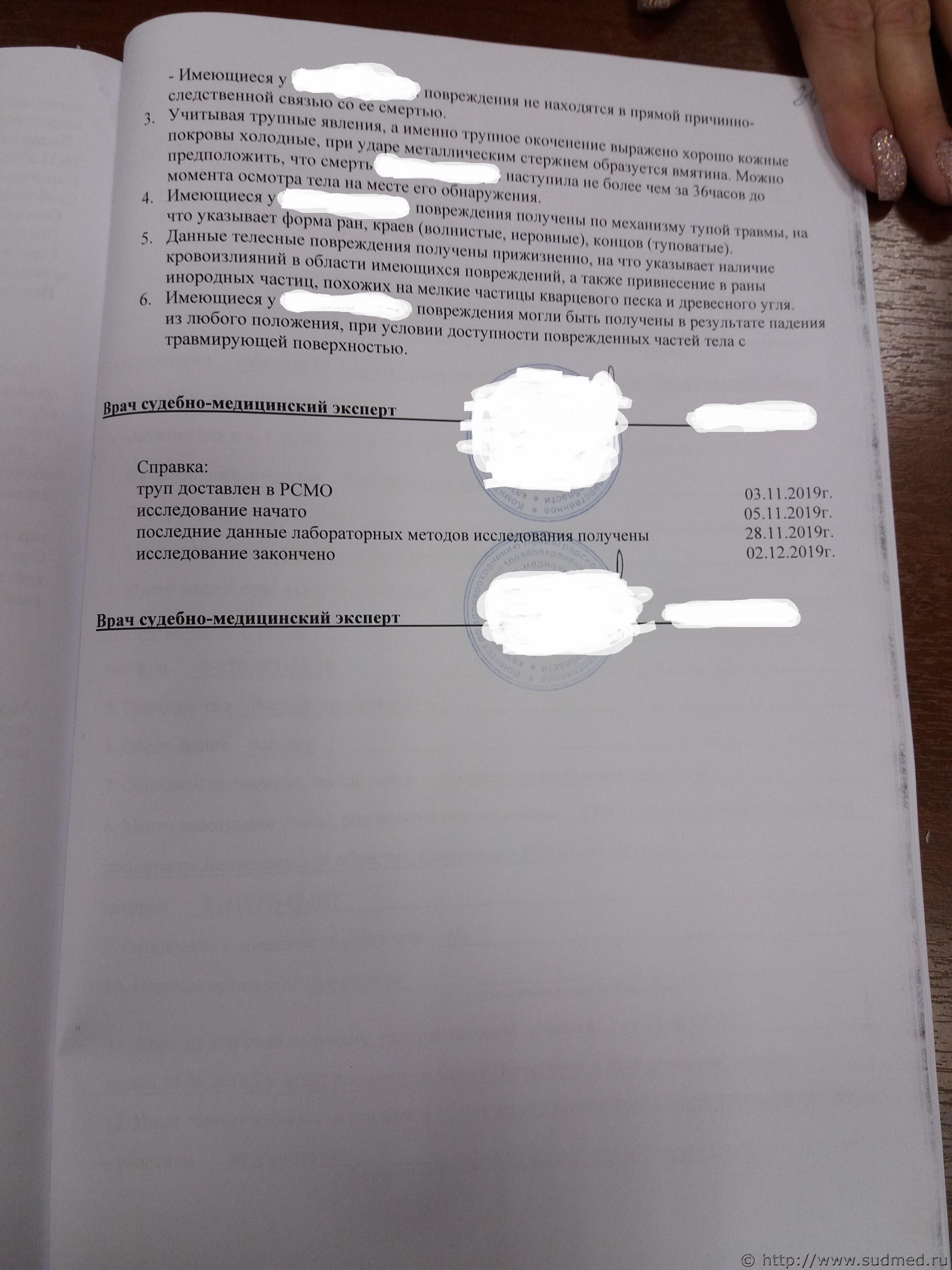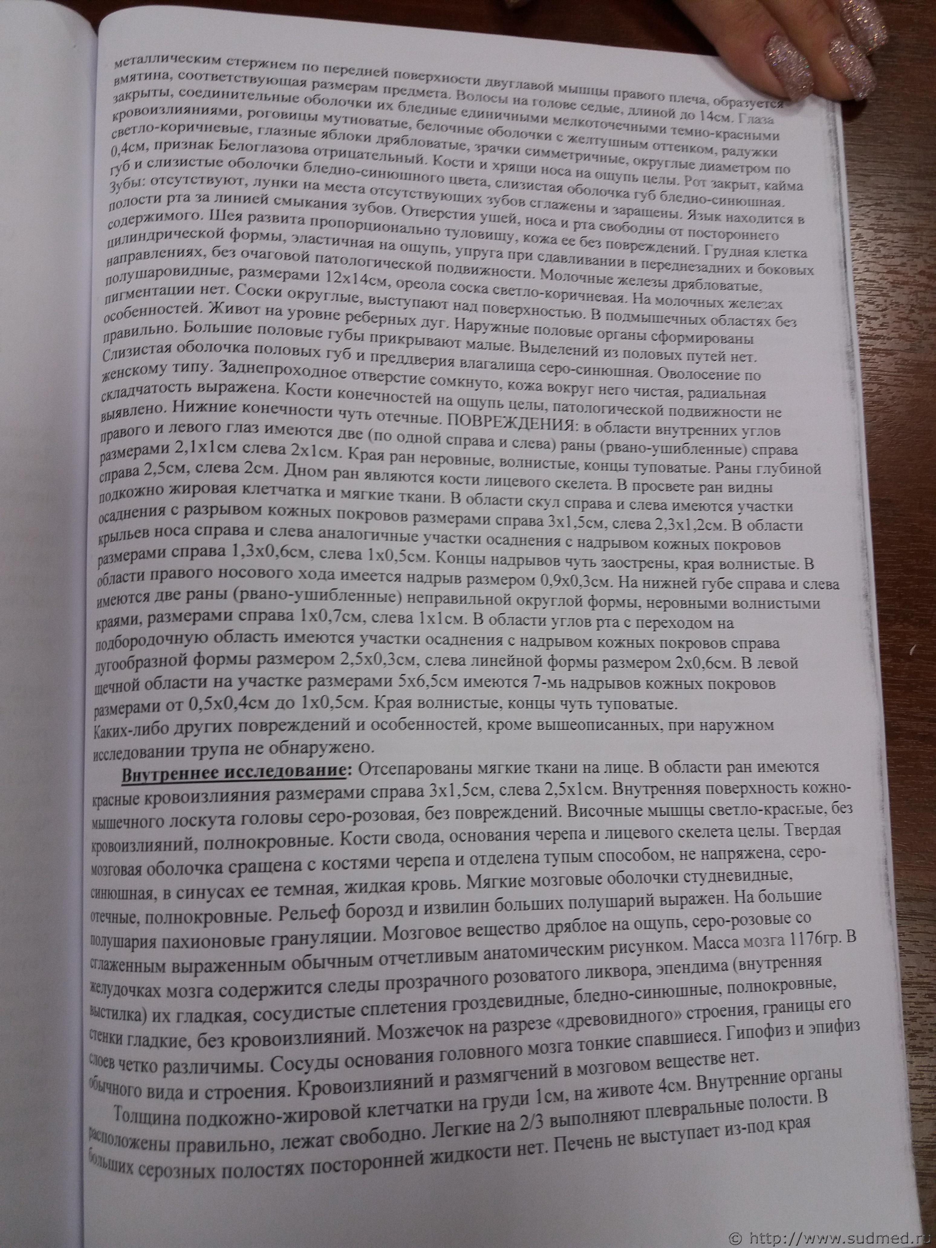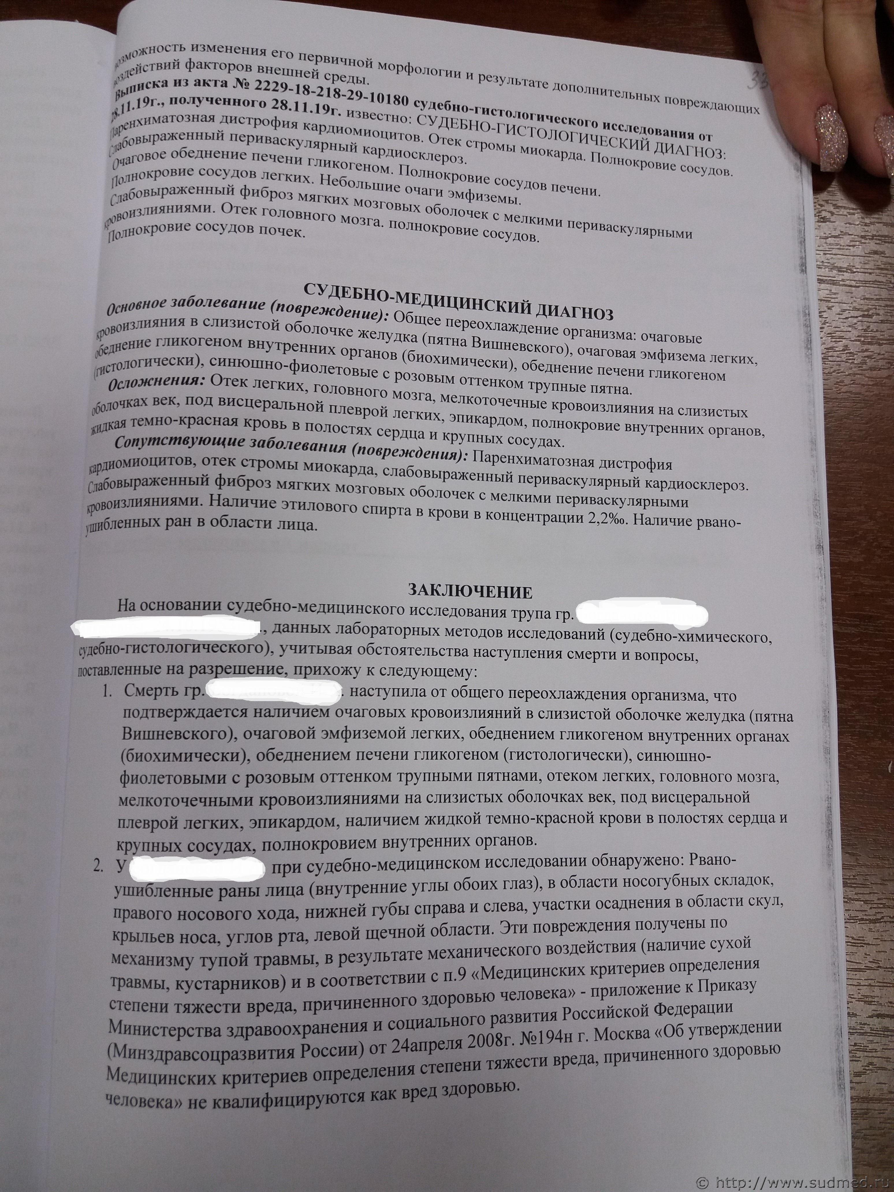 Причина смерти мне не известна. Пятна могли образоваться после извлечения трупа из воды. Есть ли протокол осмотра на месте происшествия? Как алкоголь попал - вопрос к следователю. Спасибо,все понятно.Протокола с места происшествия на руках нет,завтра вызваны в ск на допрос впервые с ноября месяца в качестве потерпевших.Но акт мы выложили скорее для того, чтобы услышать независимые мнения(повторюсь,но большое вам спасибо).В феврале мы оспорили экспертизу в Санкт-Петербурге,нам выдали соответствующие документы,с подписями нескольких экспертов.Они также признали переохлаждение необоснованным,высказав,что причиной смерти является асфиксия(удушение путем закрытия рта и носа и возможно сдавливания шеи руками),рекомендовали эксгумацию.Так вот теперь я возвращаюсь к первому своему вопросу,ск так долго тянул с эксгумацией(на дворе уже июнь),стоит ли ее теперь проводить вообще.Нас интересует не столько подтверждение самого факта удушения,а изъятие подногтевого содержимого на анализ,этого не было сделано,предполагаем, что там могли быть частички кожи преступника и возможно это единственное доказательство.Насколько это реально по вашему мнению спустя столько времени и на какой анализ это можно отправить? |