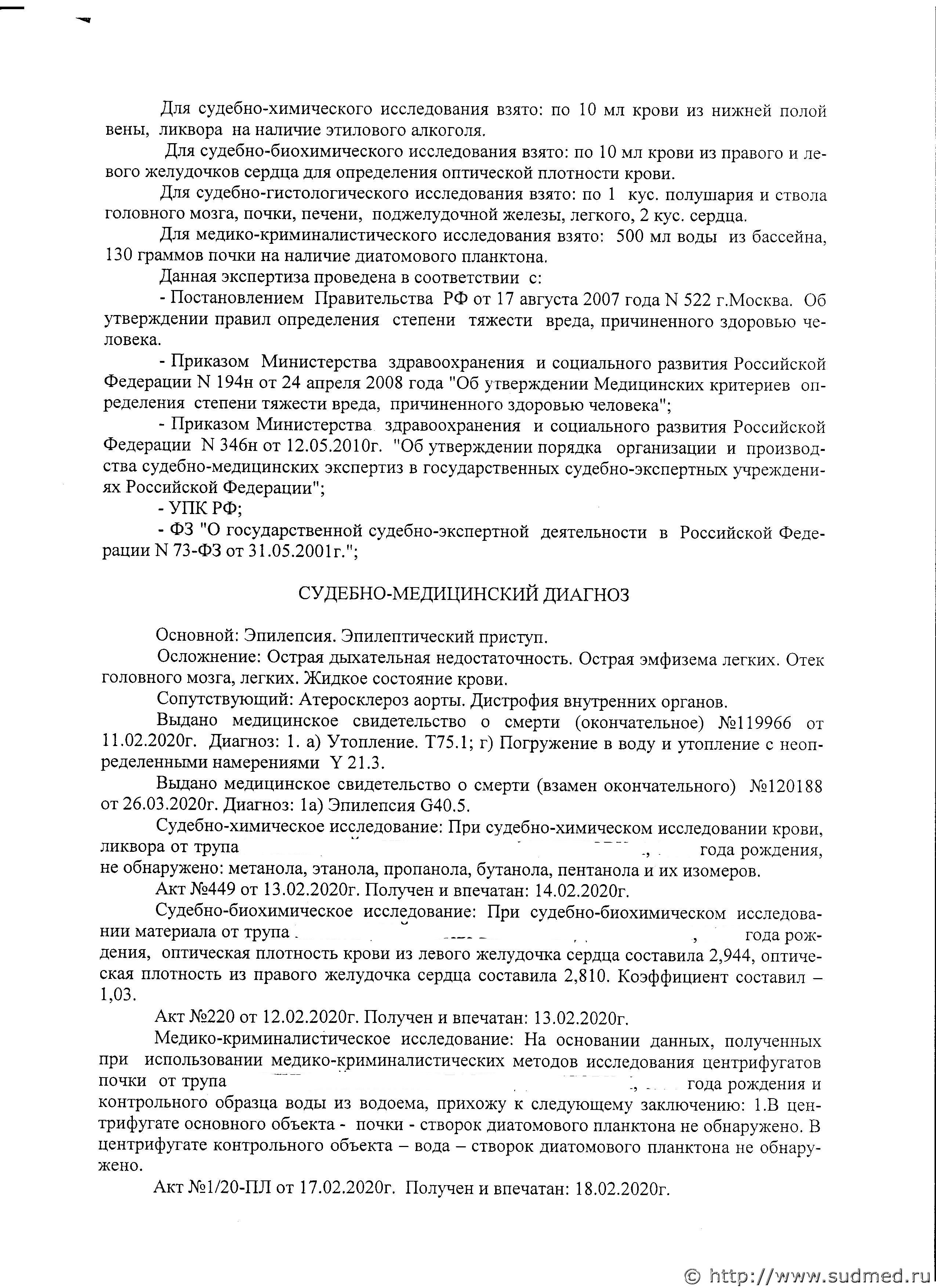 Во-первых, при утоплении вода не всегда попадает в нижние дыхательные пути. Во-вторых, даже если попадает какое-то ее количество - она быстро проникает в сосудистое русло. В-третьих, в предоставленном Заключении/Акте написано "...На разрезах легкие отечные... С плоскости разрез легких стекает большое количество сероватой пенистой жидкости и темно-красной жидкой крови...". Это абсолютно не говорит о том, что "вода попала в легкие", просто мне не понятны ваши категорические выводы. Вам нужно, чтобы там лужа плескалась или текло как с крана? Спасибо! А если она погибла от приступа эпилепсии но в воде, картина была-бы та-же? Это ведь не утопление? Или я не права?  |