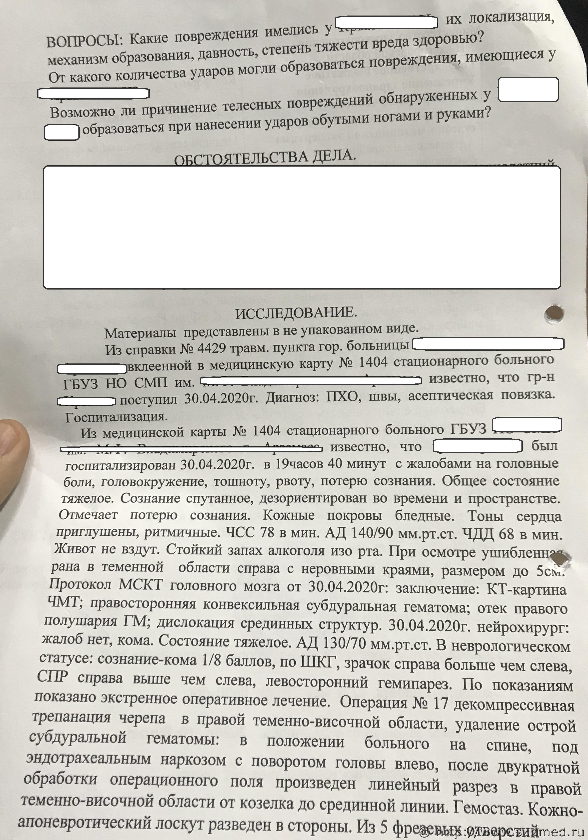 Ситуация следующая. Драка, в ходе которой одному из участников наносятся удары по голове и телу руками и обутыми ногами. От какого-то удара данный участник , впоследствии признанный потерпевшим, падает, предположительно ударяясь головой об асфальт. Из справки травмпункта, куда потерпевший попал в тот же день: Диагноз: ПХО, швы, асептическая повязка. Госпитализация. Из медицинской карты стационарного больного: При осмотре ушибленная рана в теменной области справа с неровными краями, размером до 5 см. Протокол МСКТ головного мозга заключение: КТ-картина ЧМТ; правосторонняя конвексильная субдуральная гематома, отек правого полушария ГМ; дислокация срединных структур. Затем проводилось операция, лечение. Клинический диагноз: ЗЧМТ. Ушиб головного мозга 2 степени, субдуральная гематома правой гемисферы, отек головного мозга, дислокационный синдром влево, левосторонний гемипарез, ушибленная рана волосистой части головы. Содержание медицинской документации привожу в части, имеющей по моему мнению значение для ответа на интересующие вопросы. Если информации не достаточно, дополню или скину скан заключений эксперта. Выводы эксперта: Имелась закрытая черепно-мозговая травма в виде ушибленной раны волосистой части головы, ушиба головного мозга 2 степени, кровоизлияния по твердую мозговую оболочку правого полушария со сдавлением и отеком головного мозга с развитием левостороннего гемипареза. Указанная травма образовалась от воздействия твердых тупых предметов и вполне могла возникнуть от ударов руками и обутыми ногами. Описать от какого количества травматических воздействий образовалась травма головы не представляется возможным, в связи с отсутствием описания точной локализации и количества наружных повреждений в представленной медицинской документации. В связи с отсутствием описания в представленной медицинской документации каких-либо повреждений на лице у потерпевшего судить о конкретном механизме возникновения ЗЧМТ, т.е. могла ли она возникнуть от одного удара рукой по лицу, от трех ударов ладонью по щекам находящемуся лежа на спине потерпевшему, от удара рукой по лицу с последующим падением из положения стоя и ушиба о твердую поверхность, не представляется возможным. Принимаю во внимание локализацию ушибленной раны в правой теменной области, полагаю, что возможность образования черепно-мозговой травмы у потерпевшего при падении из положения стоя и ушиба головной о твердую поверхность следует исключить. У меня такие вопросы: 1. Согласны ли вы с выводом эксперта о том, что локализация раны в правой теменной области свидетельствует о том, что она не могла быть получена в результате падения? 2. Не кажется ли вам, что эксперт мог ответить о возможном количестве травматических воздействий (например, "не менее одного"), раз уж он взялся судить о механизме образования ЗЧМТ по одной только ране. 3. Правильно ли я понимаю, что в данном случае механизм образования раны = механизм образования ЗЧМТ.  |
