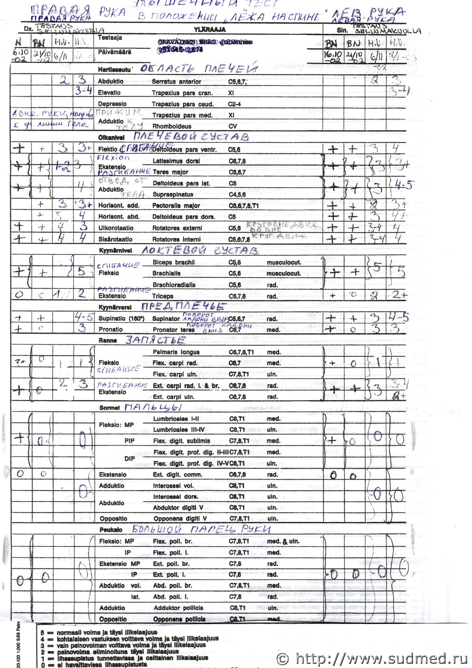 Были сделаны также мышечные тесты по шкале MRC, согласно которым до 21.10 (включительно) в тесте обоих рук, в положении лёжа на спине, везде стоит только "+", а пальцы и большой палец рук - вообще по нолям. В таком же тесте от 6.11: плечевой сустав - все по 3-4 балла. Локтевой сустав, flexio: biceps brachii C5,6 musculocut ; brachialis C5,6 musculocut ; brachioradialis C5,6 rad. = все по 5 баллов. Ekstensio: triceps rad. = 2 балла. Предплечье - все показатели по три балла. Запястье, flexio: palmaris longus C6,7,8,T1 med.; Flex. carpi rad. C6,7 med.; Flex. carpi uin. C7,8,T1 uln. = все по 1 баллу. Ekstensio: Ext. carpi rad. I. & br. C6,7,8 rad.; Ext. carpi uin. C6,7,8 rad. = все по 3 балла. Пальцы и большие пальцы рук по нолям. Можно ли по этим тестам установить, мог ли человек в конце октября и 6 ноября (когда был сделан один из мышечных тестов) двигать рукой, чтобы писать? И если нет, то означало ли это, что по сути, например, для подписи нужно было практически водить его рукой? Заранее спасибо за ответ! |