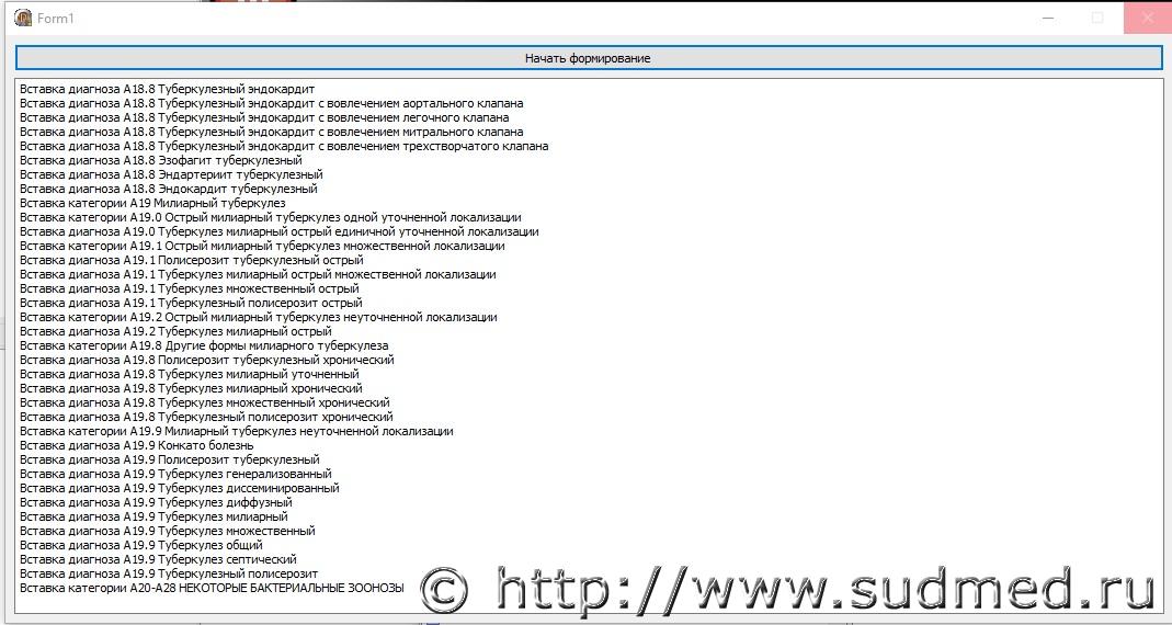 Решил склеить взятый из сети файл с категориями и кодами с третьим томом в базу данных. Учитывая огромный объем данных, решил сделать базу с двумя таблицами - так выборка в программе-заполнялке свидетельства должна пойти быстрее. Накидал простенькую программу для склеивания. Чую, процесс растянется на всю ночь. Ну ладно, дежурство только продолжается. Комп только категорию А уже минут 20 обрабатывает. А пока он думает, можно потихоньку писать код ввода МКБ с учетом этой переделки.