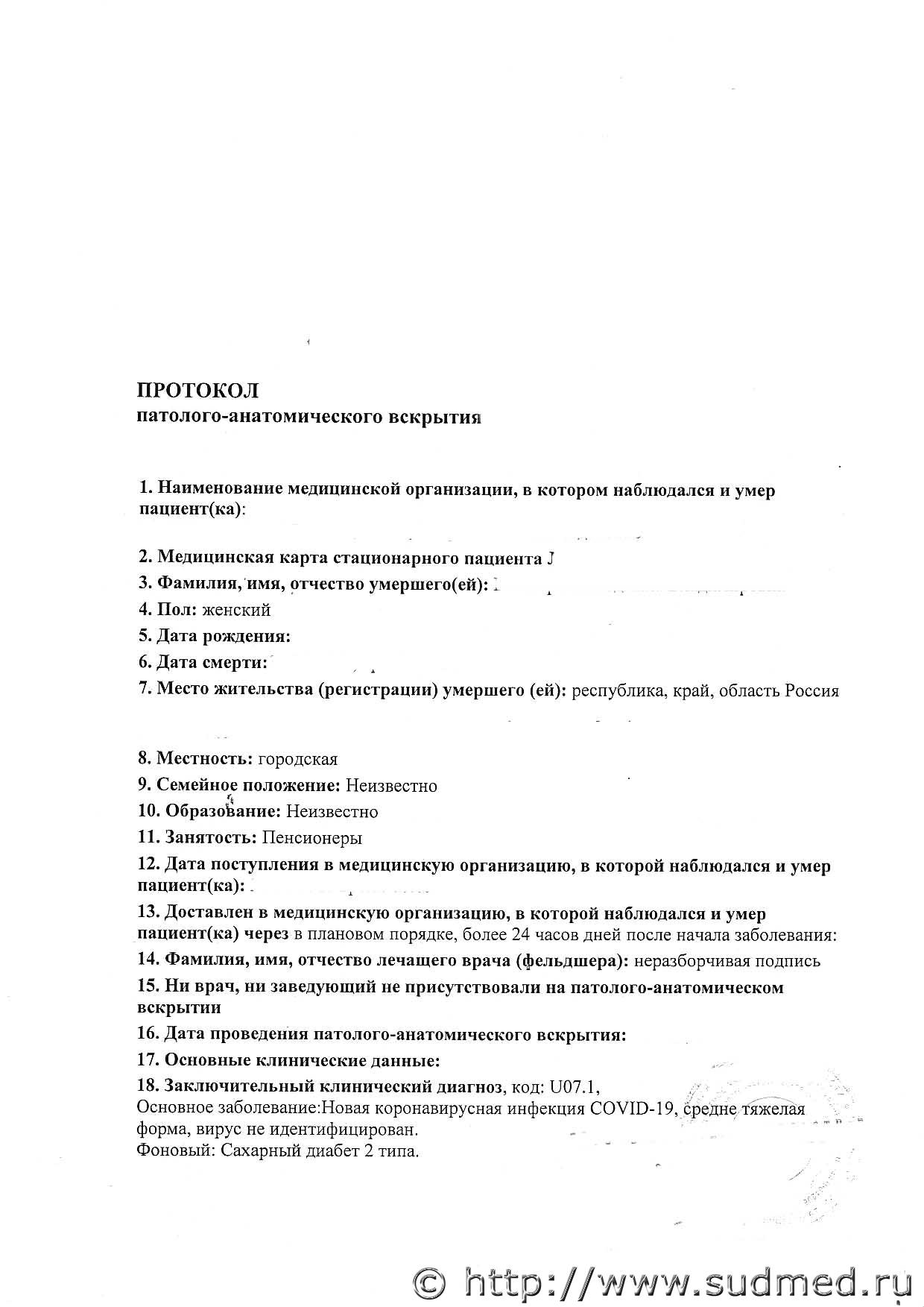 Мнение одно: дождаться результатов патологоанатомического вскрытия после завершения всех дописследований, запросить копию его протокола, ознакомить с ней нас. Не исключено, что при получении копии в беседе с патологоанатомом или начмедом все вопросы разрешатся. По свидетельству о смерти, наверняка предварительному, никаких выводов не сделать. Спасибо! Копию протокола вскрытия я запросил. Заодно запросил копию истории болезни. Вряд ли могут выдать, но за спрос денег не берут. Как получу все на руки, я так понял, можно в консультационный раздел разместить свой вопрос? |
