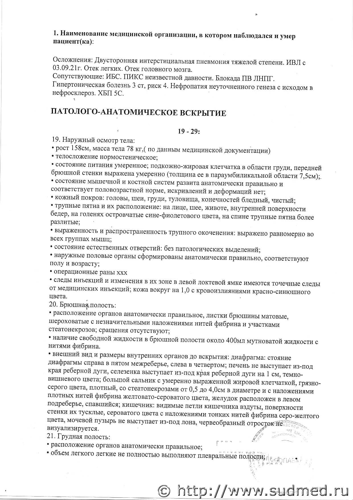 Добрый день! Пока на руках никаких документов нет, хотелось бы получить хотя бы теоретические измышления. Заранее спасибо. Моя мать, 73 года. Хронический пиелонефрит (с периодическими обострениями), ХПН (5 ст. СКФ 6,88), ХСН IIA, СД 2 тип, гипертония 2 риск 4. Вот такой букет. Не уберег - в конце августа сам слег в госпиталь с коронавирусом, и пока лежал, через несколько дней, по телефону начал замечать у неё симптомы интоксикации - заторможенность, нарушение слуха, сонливость, слабость. В общем симптомы для меня не новые были, такие же симптомы были в 15 году при обострении пиелонефрита. Я выписываюсь срочно, с отказом от лечения (как получил отрицательные анализы на коронавирус), приехав, замечаю, что у неё еще и понос болотного темно-зеленого цвета, недели за 2, до этих событий, у неё тоже был понос, но какого вида - не обратил внимания. Пока пытаюсь организовать госпитализацию, заказываю в частной лаборатории анализы. Результаты таковы: АЛТ(26.4 Ед/л) АСТ(31.3 Ед/л) Общ. белок (80.1 г/л), мочевая кислота 771.5 мкмоль, мочевина 40.5, креатинин 652 мкмоль, альфа-амилаза 73.1, гемоглобин 147. Сатурация мерянная мной и скорой 94-96. Температуры не было. Кашель ну такой обычный, легкий, в общем периодически мы все покашливаем, хотя несколько "глуховат" был по ощущениям. Единсвенное что меня насторожило (но не насторожило врачей СМП - дыхание животом, довольно резкие дыхательные движения). В 19 году креатинин был 750, но вижу что шкалят мочевая кислота и мочевина. От мочи сильный запах аммиака. Такого высокого гемоглобина не было никогда - обычно от 90 до 112 это на эральфоне и витаминах B, фолиевой и железе. Укладываю с большим трудом в больницу СМП, там делают КТ и выявляют вирусную пневмонию (25%). Переводят в коронавирусный госпиталь. Там несколько дней улучшений, потом резкое ухудшение - реанимация - смерть. Провела она там неделю. Получил справку о смерти... Ia. Интоксикация септическая б. Панкреатит острый идиопатический. II. Двусторонняя полисегментарная пневмония. Честно я ожидал увидеть что-то про почки, может быть сердце, дыхательную недостаточность. Но никак не панкреатит острый. Хотя в конце 19 года она лежала в больнице с обострением хронического панкреатита. Прошу ваших мнений на этот счет. Коронавирус вызвал панкреатит? Врачи не углядели? Как такое возможно? Заранее еще раз спасибо! |