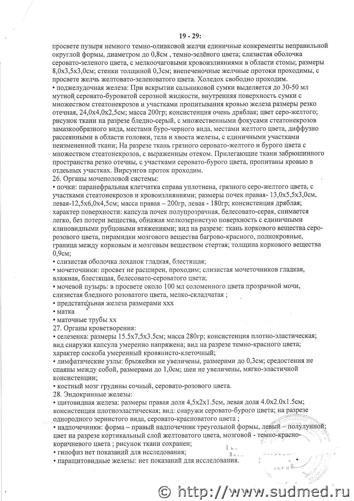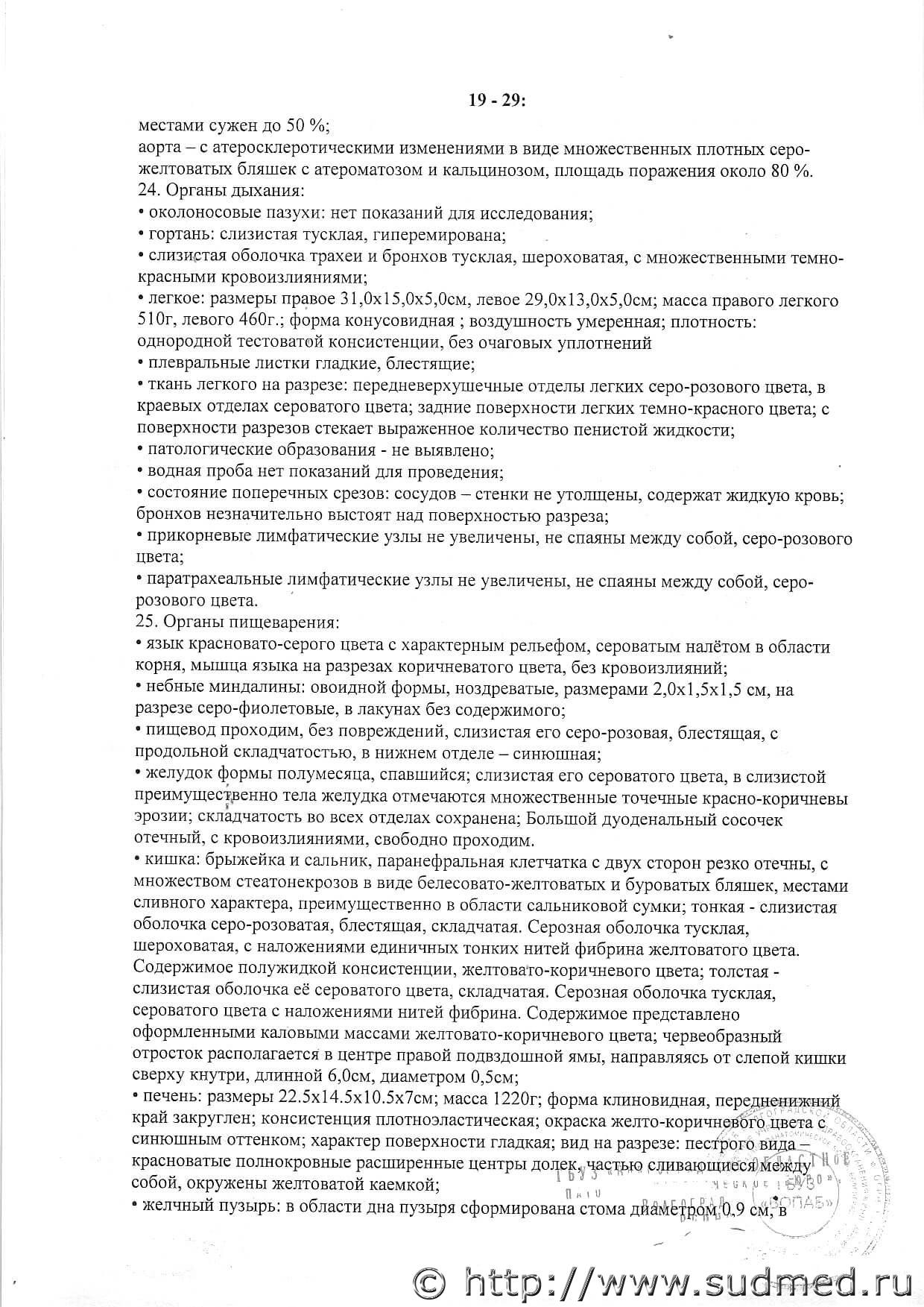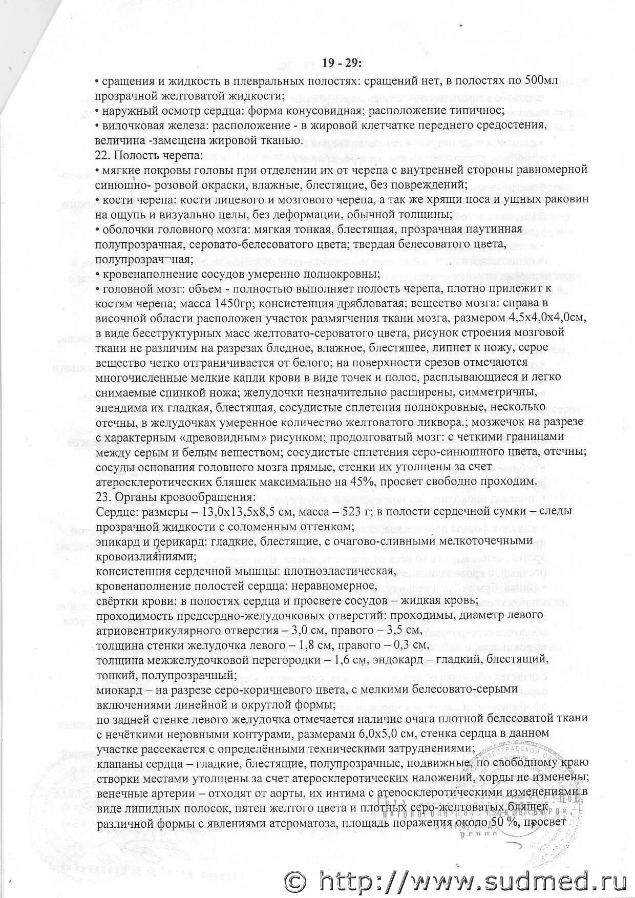 Мнение одно: дождаться результатов патологоанатомического вскрытия после завершения всех дописследований, запросить копию его протокола, ознакомить с ней нас. Не исключено, что при получении копии в беседе с патологоанатомом или начмедом все вопросы разрешатся. По свидетельству о смерти, наверняка предварительному, никаких выводов не сделать.