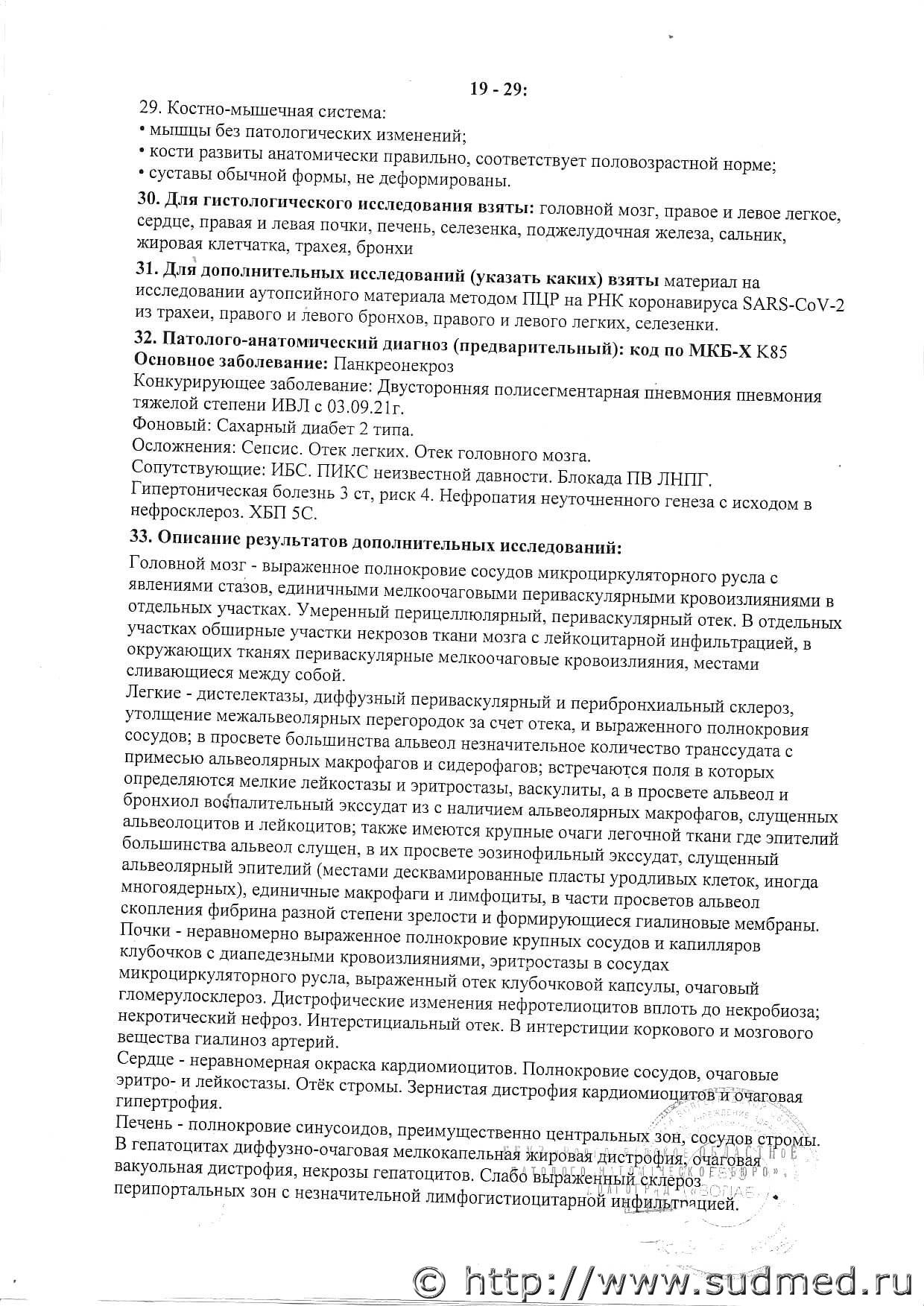 Последний набор вопросов от меня. Панкреатит мог возникнуть и как самостоятельная болезнь и как реакция на продукты, медикаменты, и как следствие корона-вируса - но в общем это гадание и установить истину не получится? Сахарный диабет и ХПН 5С - сами по себе болезни, которые могут декомпенсироваться в любой момент. Коронавирус лишь ускорил (утяжелил) этот момент? Имел ли место отек мозга? Меня смущает участок размягчения головного мозга, указанный в протоколе, или он ни на что не влияет и какова его причина(ы)? Как по вашему насколько правильный протокол вскрытия? (Я понимаю, доктор, скорее всего, некоторые не имеющие значения моменты опустил - следы от операции на ЖП в 2013, неправильно сросшийся перелом правой ноги (голеностоп) в начале 2019 года.) |